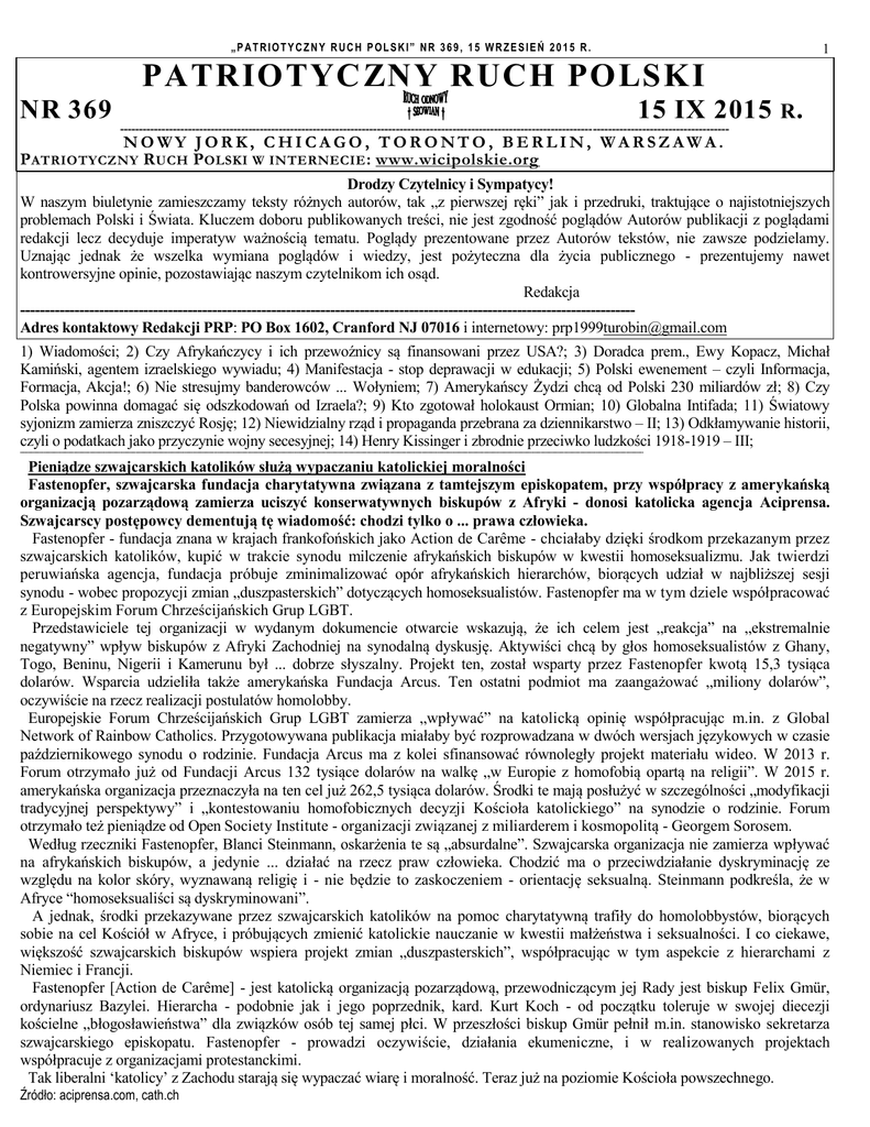 „PATRIOTYCZNY RUCH POLSKI” NR 369, 15 WRZESIEŃ 2015 R. 1 PATRIOTYCZNY RUCH POLSKI NR 369 15 IX 2015 R . ----------------------------------------------------------------------------------------------------------------------------------------------------------------- NOWY JORK, CHICAGO, TORONTO, BERLIN, WARSZAWA. P ATRIOTYCZNY R UCH P OLSKI W INTERNECIE : www.wicipolskie.org Drodzy Czytelnicy i Sympatycy! W naszym biuletynie zamieszczamy teksty różnych autorów, tak „z pierwszej ręki” jak i przedruki, traktujące o najistotniejszych problemach Polski i Świata. Kluczem doboru publikowanych treści, nie jest zgodność poglądów Autorów publikacji z poglądami redakcji lecz decyduje imperatyw ważnością tematu. Poglądy prezentowane przez Autorów tekstów, nie zawsze podzielamy. Uznając jednak że wszelka wymiana poglądów i wiedzy, jest pożyteczna dla życia publicznego - prezentujemy nawet kontrowersyjne opinie, pozostawiając naszym czytelnikom ich osąd. Redakcja ----------------------------------------------------------------------------------------------------------------------------Adres kontaktowy Redakcji PRP: PO Box 1602, Cranford NJ 07016 i internetowy: [email protected] 1) Wiadomości; 2) Czy Afrykańczycy i ich przewoźnicy są finansowani przez USA?; 3) Doradca prem., Ewy Kopacz, Michał Kamiński, agentem izraelskiego wywiadu; 4) Manifestacja - stop deprawacji w edukacji; 5) Polski ewenement – czyli Informacja, Formacja, Akcja!; 6) Nie stresujmy banderowców ... Wołyniem; 7) Amerykańscy Żydzi chcą od Polski 230 miliardów zł; 8) Czy Polska powinna domagać się odszkodowań od Izraela?; 9) Kto zgotował holokaust Ormian; 10) Globalna Intifada; 11) Światowy syjonizm zamierza zniszczyć Rosję; 12) Niewidzialny rząd i propaganda przebrana za dziennikarstwo – II; 13) Odkłamywanie historii, czyli o podatkach jako przyczynie wojny secesyjnej; 14) Henry Kissinger i zbrodnie przeciwko ludzkości 1918-1919 – III; ------------------------------------------------------------------------------------------------------------------------------------------------------------------------------------------------------------------------------------------------------------------------------------------------------------------------------------------------------------------------------------------------------------------ Pieniądze szwajcarskich katolików służą wypaczaniu katolickiej moralności Fastenopfer, szwajcarska fundacja charytatywna związana z tamtejszym episkopatem, przy współpracy z amerykańską organizacją pozarządową zamierza uciszyć konserwatywnych biskupów z Afryki - donosi katolicka agencja Aciprensa. Szwajcarscy postępowcy dementują tę wiadomość: chodzi tylko o ... prawa człowieka. Fastenopfer - fundacja znana w krajach frankofońskich jako Action de Carême - chciałaby dzięki środkom przekazanym przez szwajcarskich katolików, kupić w trakcie synodu milczenie afrykańskich biskupów w kwestii homoseksualizmu. Jak twierdzi peruwiańska agencja, fundacja próbuje zminimalizować opór afrykańskich hierarchów, biorących udział w najbliższej sesji synodu - wobec propozycji zmian „duszpasterskich” dotyczących homoseksualistów. Fastenopfer ma w tym dziele współpracować z Europejskim Forum Chrześcijańskich Grup LGBT. Przedstawiciele tej organizacji w wydanym dokumencie otwarcie wskazują, że ich celem jest „reakcja” na „ekstremalnie negatywny” wpływ biskupów z Afryki Zachodniej na synodalną dyskusję. Aktywiści chcą by głos homoseksualistów z Ghany, Togo, Beninu, Nigerii i Kamerunu był ... dobrze słyszalny. Projekt ten, został wsparty przez Fastenopfer kwotą 15,3 tysiąca dolarów. Wsparcia udzieliła także amerykańska Fundacja Arcus. Ten ostatni podmiot ma zaangażować „miliony dolarów”, oczywiście na rzecz realizacji postulatów homolobby. Europejskie Forum Chrześcijańskich Grup LGBT zamierza „wpływać” na katolicką opinię współpracując m.in. z Global Network of Rainbow Catholics. Przygotowywana publikacja miałaby być rozprowadzana w dwóch wersjach językowych w czasie październikowego synodu o rodzinie. Fundacja Arcus ma z kolei sfinansować równoległy projekt materiału wideo. W 2013 r. Forum otrzymało już od Fundacji Arcus 132 tysiące dolarów na walkę „w Europie z homofobią opartą na religii”. W 2015 r. amerykańska organizacja przeznaczyła na ten cel już 262,5 tysiąca dolarów. Środki te mają posłużyć w szczególności „modyfikacji tradycyjnej perspektywy” i „kontestowaniu homofobicznych decyzji Kościoła katolickiego” na synodzie o rodzinie. Forum otrzymało też pieniądze od Open Society Institute - organizacji związanej z miliarderem i kosmopolitą - Georgem Sorosem. Według rzeczniki Fastenopfer, Blanci Steinmann, oskarżenia te są „absurdalne”. Szwajcarska organizacja nie zamierza wpływać na afrykańskich biskupów, a jedynie ... działać na rzecz praw człowieka. Chodzić ma o przeciwdziałanie dyskryminację ze względu na kolor skóry, wyznawaną religię i - nie będzie to zaskoczeniem - orientację seksualną. Steinmann podkreśla, że w Afryce “homoseksualiści są dyskryminowani”. A jednak, środki przekazywane przez szwajcarskich katolików na pomoc charytatywną trafiły do homolobbystów, biorących sobie na cel Kościół w Afryce, i próbujących zmienić katolickie nauczanie w kwestii małżeństwa i seksualności. I co ciekawe, większość szwajcarskich biskupów wspiera projekt zmian „duszpasterskich”, współpracując w tym aspekcie z hierarchami z Niemiec i Francji. Fastenopfer [Action de Carême] - jest katolicką organizacją pozarządową, przewodniczącym jej Rady jest biskup Felix Gmür, ordynariusz Bazylei. Hierarcha - podobnie jak i jego poprzednik, kard. Kurt Koch - od początku toleruje w swojej diecezji kościelne „błogosławieństwa” dla związków osób tej samej płci. W przes