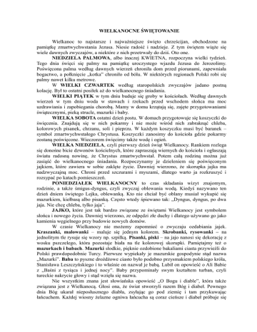 WIELKANOCNE ŚWIĘTOWANIE Wielkanoc to najstarsze i najważniejsze święto chrześcijan, obchodzone na pamiątkę zmartwychwstania Jezusa. Niesie radość i nadzieje. Z tym świętem wiąże się wiele dawnych zwyczajów, a niektóre z nich przetrwały do dziś. Oto one. NIEDZIELA PALMOWA, albo inaczej KWIETNA, rozpoczyna wielki tydzień. Tego dnia święci się palmy na pamiątkę uroczystego wjazdu Jezusa do Jerozolimy. Poświęcona palma według dawnych wierzeń chroniła dom przed piorunami, zapewniała bogactwo, a połknięcie „kotka” chroniło od bólu. W niektórych regionach Polski robi się palmy nawet kilku metrowe. W WIELKI CZWARTEK według staropolskich zwyczajów jadano postną kolację. Był to ostatni posiłek aż do wielkanocnego śniadania. WIELKI PIĄTEK w tym dniu buduje się groby w kościołach. Według dawnych wierzeń w tym dniu woda w stawach i rzekach przed wschodem słońca ma moc uzdrawiania i zapobiegania chorobą. Mamy w domu krzątają się, zajęte przygotowaniami świątecznymi, pieką strucle, mazurki i baby. WIELKA SOBOTA ostatni dzień postu. W domach przygotowuje się koszyczki do święcenia. Znajdują się w nich pokarmy i nie może wśród nich zabraknąć chleba, kolorowych pisanek, chrzanu, soli i pieprzu. W każdym koszyczku musi być baranek – symbol zmartwychwstałego Chrystusa. Koszyczki zanosimy do kościoła gdzie pokarmy zostaną poświęcone. Wieczorem święcimy także wodę i ogień. WIELKA NIEDZIELA, czyli pierwszy dzień świąt Wielkanocy. Rankiem rozlega się donośne bicie dzwonów kościelnych, które zapraszają wiernych do kościoła i ogłaszają światu radosną nowinę, że Chrystus zmartwychwstał. Potem całą rodziną można już zasiąść do wielkanocnego śniadania. Rozpoczynamy je dzieleniem się poświęconym jajkiem, które zawiera w sobie zaklęte życie. Dawniej wierzono, że skorupka jajka ma nadzwyczajną moc. Chroni przed szczurami i myszami, dlatego warto ja rozkruszyć i rozsypać po katach pomieszczeń. PONIEDZIAŁEK WIELKANOCNY to czas składania wizyt znajomym, rodzinie, a także śmigus-dyngus, czyli zwyczaj oblewania wodą. Kiedyś nazywano ten dzień dniem świętego Lejka, oblewanką. Kto nie chciał być oblany musiał wykupić się mazurkiem, kiełbasą albo pisanką. Często wtedy śpiewano tak: „Dyngus, dyngus, po dwa jaja. Nie chcę chleba, tylko jaja”. JAJKO, które jest tak bardzo związane ze świętami Wielkanocy jest symbolem słońca i nowego życia. Dawniej wierzono, ze odpędzi złe duchy i dlatego używano go jako kamienia węgielnego przy budowie nowych domów. W czasie Wielkanocy nie możemy zapomnieć o zwyczaju ozdabiania jajek. Kraszanki, malowanki – maluje się jednym kolorem. Skrobanki, rysowanki – na jednolitym tle rysuje się wzory np. szpilką. Pisanki, piski – na jajo nanosi się dekorację z wosku pszczelego, która pozostaje biała na tle kolorowej skorupki. Pamiętajmy też o mazurkach i babach. Mazurki słodkie, pięknie ozdobione bakaliami ciasta przywieźli do Polski prawdopodobnie Turcy. Pierwsze wypiekały je mazurskie gospodynie stąd nazwa „Mazurki”. Baba to pyszne drożdżowe ciasto było podobno przysmakiem polskiego króla, Stanisława Leszczyńskiego i to właśnie on nazwał je babą. Lubił on opowieść o Ali Babie z „Baśni z tysiąca i jednej nocy”. Baby przypominały swym kształtem turban, czyli tureckie nakrycie głowy i stąd wzięła się nazwa. Nie wszystkim znana jest słowiańska opowieść „O Bogu i diable”, która także związana jest z Wielkanocą. Głosi ona, że świat stworzyli razem Bóg i diabeł. Pewnego dnia Bóg ukarał nieposłusznego diabła, zsyłając go pod ziemię i tam przykuwając łańcuchem. Każdej wiosny żelazne ogniwa łańcucha są coraz cieńsze i diabeł próbuje się uwolnić. Kiedy świętujemy zmartwychwstanie Chrystusa lub uderza pierwszy wiosenny piorun, łańcuch ponownie staje się mocny. Opracowały: Grażyna Krychowiak, Barbara Michniewicz