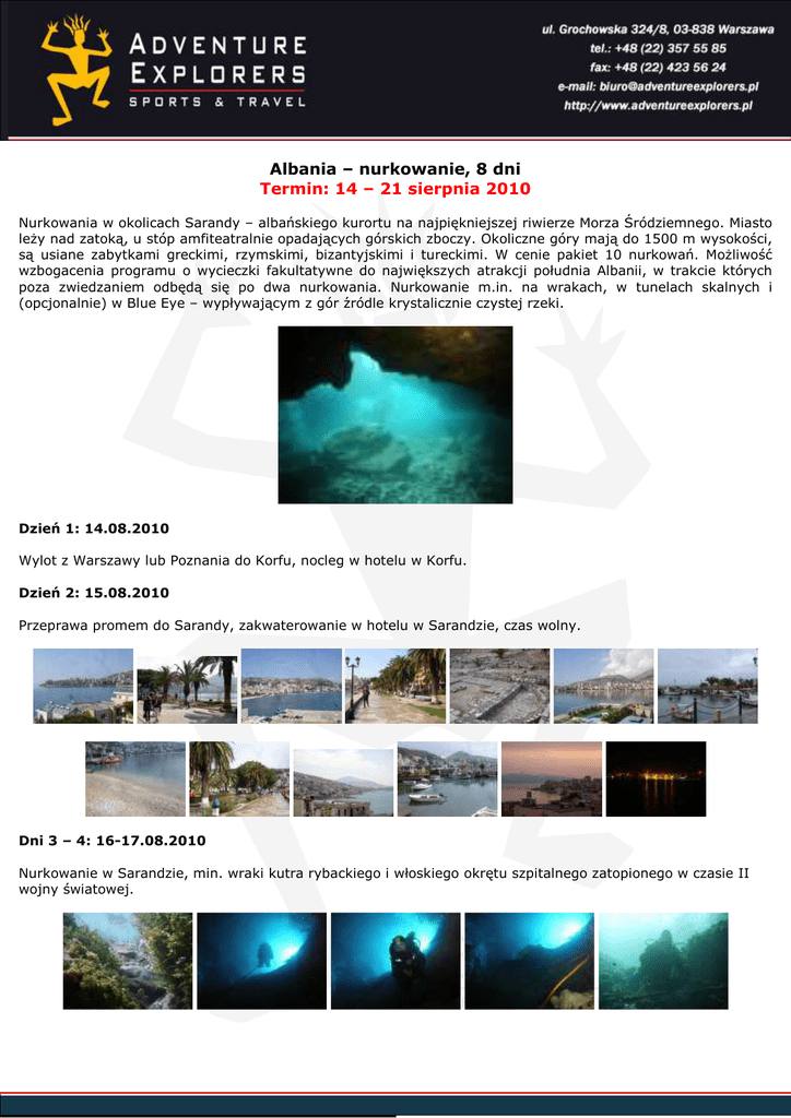 Albania – nurkowanie, 8 dni Termin: 14 – 21 sierpnia 2010 Nurkowania w okolicach Sarandy – albańskiego kurortu na najpiękniejszej riwierze Morza Śródziemnego. Miasto leŜy nad zatoką, u stóp amfiteatralnie opadających górskich zboczy. Okoliczne góry mają do 1500 m wysokości, są usiane zabytkami greckimi, rzymskimi, bizantyjskimi i tureckimi. W cenie pakiet 10 nurkowań. MoŜliwość wzbogacenia programu o wycieczki fakultatywne do największych atrakcji południa Albanii, w trakcie których poza zwiedzaniem odbędą się po dwa nurkowania. Nurkowanie m.in. na wrakach, w tunelach skalnych i (opcjonalnie) w Blue Eye – wypływającym z gór źródle krystalicznie czystej rzeki. Dzień 1: 14.08.2010 Wylot z Warszawy lub Poznania do Korfu, nocleg w hotelu w Korfu. Dzień 2: 15.08.2010 Przeprawa promem do Sarandy, zakwaterowanie w hotelu w Sarandzie, czas wolny. Dni 3 – 4: 16-17.08.2010 Nurkowanie w Sarandzie, min. wraki kutra rybackiego i włoskiego okrętu szpitalnego zatopionego w czasie II wojny światowej. 1 Dzień 5: 18.08.2010 Wycieczka do Gjiri i Palermo, połączona z dwoma nurkowaniami. Dzień 6: 19.08.2010 Wycieczka do Butrind, Ciflik i Monastiri, połączona z dwoma nurkowaniami. Dzień 7: 20.08.2010 Wycieczka do Gjirocastra i Libohova, połączona z nurkowaniem w Blue Eye, pionowej jaskini, z której wypływa krystalicznie czysta górska rzeka. 2 Dzień 8: 21.08.2010 Przeprawa promem do Korfu, moŜliwość zwiedzenia miasta, wylot do Warszawy lub Poznania. CENA WYNOSI: 1990 PLN + dojazd / przelot CENA ZAWIERA: • transport do hoteli, bilety na prom do/z Sarandy, pozostałe transfery, • zakwaterowanie w hotelach klasy turystycznej, w pokojach 2-osobowych, • trzy całodzienne wycieczki połączone z nurkowaniami, pakiet 9 nurkowań (dodatkowe nurkowania za dopłatą), • • butle 12l, balast, • • polskich przewodników i instruktorów pod wodą, • opiekę przedstawiciela biura, • ubezpieczenie SIGNAL IDUNA TRAVEL na cały wyjazd, • ubezpieczenie SIGNAL IDUNA TRAVEL rozszerzone o nurkowanie ze specjalistycznym sprzętem (komora). CENA NIE ZAWIERA: • przelotu międzynarodowego na Korfu (ok. 1200 – 1400 PLN) – w zaleŜności od dostępności miejsc; moŜliwy wylot z Warszawy i Poznania, • wyŜywienia, • wypoŜyczenia sprzętu nurkowego, • kursu nurkowego OWD. INFORMACJE DODATKOWE: ALBANIA (Republika Albanii) Stolica: Tirana Waluta: lek albański (ALL); Język urzędowy: albański WIZA, PRZEPISY WJAZDOWE. Obywatele RP mogą wjeŜdŜać bez wizy i przebywać na terytorium Albanii jednorazowo do 30 dni, zachowując prawo przedłuŜenia pobytu maksymalnie do 90 dni w okresie jednego roku. Formalności związanych z przedłuŜeniem pobytu moŜna dopełnić w komisariacie policji właściwym dla miejsca pobytu. Od obywateli RP nie pobiera się granicznych opłat wjazdowych. Dotyczy to równieŜ kierowców tirów i autobusów. Nie wymaga się od turystów posiadania powrotnego biletu ani określonej kwoty pieniędzy. PRZEPISY CELNE. Nie ma specjalnych uregulowań dotyczących wwozu pieniędzy; wywóz pieniędzy ograniczony jest do kwoty 10 tys. EUR na osobę. Nie ma restrykcji celnych odbiegających od powszechnie przyjętych standardów. MELDUNEK. Nie ma obowiązku meldunkowego. 3 UBEZPIECZENIE. Ubezpieczenie osobowe nie jest współpracujących z polskimi firmami ubezpieczeniowymi. obowiązkowe. W Albanii nie ma towarzystw SZCZEPIENIA, SŁUśBA ZDROWIA. Od przyjeŜdŜających do Albanii nie wymaga się świadectwa szczepień ochronnych. W Tiranie i większych miastach powstały prywatne przychodnie lekarskie o dobrym poziomie diagnostycznym (bez moŜliwości hospitalizacji). Koszt wizyty wynosi ok. 20-30 EUR. INFORMACJE DLA KIEROWCÓW. PodróŜujący samochodem powinni liczyć się z koniecznością wniesienia przy wyjeździe opłaty za korzystanie z dróg w wysokości 1 EUR za kaŜdy dzień pobytu. Ponadto powinni mieć międzynarodowe prawo jazdy oraz ubezpieczenie OC – tzw. zieloną kartę. Uznawane są zielone karty wystawiane przez polskie towarzystwa ubezpieczeniowe. Ostatnio zmodernizowano część dróg głównych. Nie zaleca się poruszania po drogach po zmroku ze względu na nie oświetlonych uŜytkowników dróg (motocykle, rowery, piesi) oraz nie oznakowane i nie oświetlone przeszkody na drodze (m.in. otwarte studzienki kanalizacyjne). BEZPIECZEŃSTWO. NaleŜy zachować ostroŜność z uwagi na moŜliwość kradzieŜy mienia lub samochodu. Do miejsc szczególnie niebezpiecznych zaliczyć moŜna górskie tereny północnej Albanii. RELIGIA, OBYCZAJE. W Albanii obowiązują normy obyczajowe podobne do norm przyjętych w innych krajach bałkańskich. Na terenach wiejskich turystyka nie jest popularna, co niesie ze sobą pewne utrudnienia. Albania to kraj tolerancji religijnej, a kwestie natury religijnej nie stwarzają problemów przyjezdnym. ŚWIĘTA. Dniami wolnymi od pracy są początek i koniec muzułmańskiego postu ramadanu – tzw. Mały i DuŜy Bajram, ponadto BoŜe Narodzenie (obchodzone dwukrotnie: w grudniu wg wyznania katolickiego – 1 dzień, w styczniu wg wyznania prawosławnego – 1 dzień), Nowy Rok, 1 maja, 28 i 29 listopada – Święto Niepodległości. PRZYDATNE INFORMACJE: • Jest coraz więcej bankomatów, jednakŜe w większości tylko dla posiadaczy kart wydanych w Albanii. • Baza turystyczna jest słabo rozwinięta. W Tiranie moŜna zatrzymać się w kilku hotelach o wysokim standardzie. Na wybrzeŜu moŜna skorzystać z pensjonatów. Brakuje pól namiotowych i kempingów. • Dyskomfortem – nie tylko dla turystów – są na terenie całej Albanii, a zwłaszcza na prowincji okresowe przerwy w dostawach energii elektrycznej i wody, dochodzące do kilku godzin na dobę. • Pewnym utrudnieniem jest niewydolna sieć telefoniczna i częste przeciąŜenia łączy internetowych. Sieć telefonii komórkowej nie obejmuje terenów północnych i górskich. • Znajomość języków obcych nie jest powszec