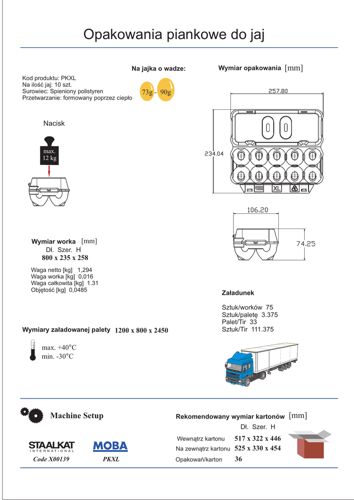 Opakowania piankowe do jaj Product Code:PKXL Caliber Na jajka o wadze: 1 PKXL KodUnits: produktu: Na Eggs/Unit:10 ilość jaj: 10 szt. Surowiec: Spieniony polistyren Material: foam polystyrene 73g - 90g Przetwarzanie: formowany poprzez ciepło Processing: thermo formed Wymiar opakowania Pack Dimensions [mm] Nacisk Pressure max. 12 kg XL Bag Dimensions Wymiar worka [mm] L Szer. Dł. W H 800 x 235 x 258 Net Weight [kg] 1,2941,294 Waga netto [kg] Bag [kg] 0,0160,016 WagaWeight worka [kg] Waga całkowita [kg] 1.31 Gross Weight [kg] 1,31 Objętość Bag [kg] [m³] 0,0485 0,0485 Volume Wymiary palety 1200 x 800 x 2450 Storagezaładowanej Pallete Dimensions Truck Loading Załadunek Pieces/Bag 75 Sztuk/worków 75 3.375 Pieces/Pallet Sztuk/paletę 3.375 Pallets/TIR 33 Palet/Tir 33 Sztuk/Tir 111.375 111.375 Pieces/TIR max. +40°C min. -30°C Machine Setup Code X00139 PKXL Recommended Dimensions RekomendowanyBox wymiar kartonów [mm] LDł. Szer. W HH Inside box kartonu 517 x 322 x 446 Wewnątrz Na zewnątrz Outside box kartonu 525 x 330 x 454 Eggpacks/box 36 Opakowań/karton