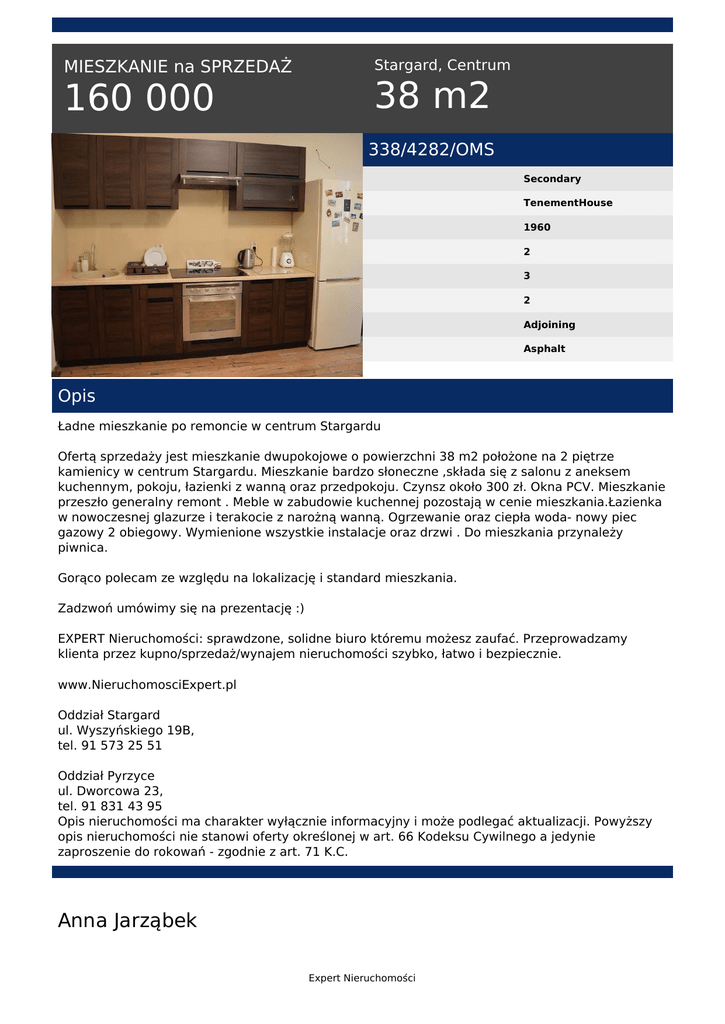 Stargard, Centrum MIESZKANIE na SPRZEDAŻ 38 m2 160 000 338/4282/OMS Secondary TenementHouse 1960 2 3 2 Adjoining Asphalt Opis Ładne mieszkanie po remoncie w centrum Stargardu Ofertą sprzedaży jest mieszkanie dwupokojowe o powierzchni 38 m2 położone na 2 piętrze kamienicy w centrum Stargardu. Mieszkanie bardzo słoneczne ,składa się z salonu z aneksem kuchennym, pokoju, łazienki z wanną oraz przedpokoju. Czynsz około 300 zł. Okna PCV. Mieszkanie przeszło generalny remont . Meble w zabudowie kuchennej pozostają w cenie mieszkania.Łazienka w nowoczesnej glazurze i terakocie z narożną wanną. Ogrzewanie oraz ciepła woda- nowy piec gazowy 2 obiegowy. Wymienione wszystkie instalacje oraz drzwi . Do mieszkania przynależy piwnica. Gorąco polecam ze względu na lokalizację i standard mieszkania. Zadzwoń umówimy się na prezentację :) EXPERT Nieruchomości: sprawdzone, solidne biuro któremu możesz zaufać. Przeprowadzamy klienta przez kupno/sprzedaż/wynajem nieruchomości szybko, łatwo i bezpiecznie. www.NieruchomosciExpert.pl Oddział Stargard ul. Wyszyńskiego 19B, tel. 91 573 25 51 Oddział Pyrzyce ul. Dworcowa 23, tel. 91 831 43 95 Opis nieruchomości ma charakter wyłącznie informacyjny i może podlegać aktualizacji. Powyższy opis nieruchomości nie stanowi oferty określonej w art. 66 Kodeksu Cywilnego a jedynie zaproszenie do rokowań - zgodnie z art. 71 K.C. Anna Jarząbek Expert Nieruchomości tel. 793057111 email: [email protected] Expert Nieruchomości Powered by TCPDF (www.tcpdf.org)