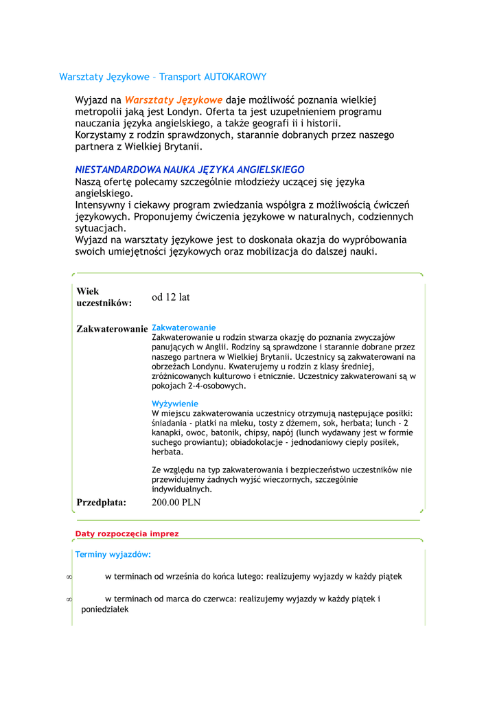 Warsztaty Językowe – Transport AUTOKAROWY Wyjazd na Warsztaty Językowe daje możliwość poznania wielkiej metropolii jaką jest Londyn. Oferta ta jest uzupełnieniem programu nauczania języka angielskiego, a także geografi ii i historii. Korzystamy z rodzin sprawdzonych, starannie dobranych przez naszego partnera z Wielkiej Brytanii. NIESTANDARDOWA NAUKA JĘZYKA ANGIELSKIEGO Naszą ofertę polecamy szczególnie młodzieży uczącej się języka angielskiego. Intensywny i ciekawy program zwiedzania współgra z możliwością ćwiczeń językowych. Proponujemy ćwiczenia językowe w naturalnych, codziennych sytuacjach. Wyjazd na warsztaty językowe jest to doskonała okazja do wypróbowania swoich umiejętności językowych oraz mobilizacja do dalszej nauki. Wiek uczestników: od 12 lat Zakwaterowanie Zakwaterowanie Zakwaterowanie u rodzin stwarza okazję do poznania zwyczajów panujących w Anglii. Rodziny są sprawdzone i starannie dobrane przez naszego partnera w Wielkiej Brytanii. Uczestnicy są zakwaterowani na obrzeżach Londynu. Kwaterujemy u rodzin z klasy średniej, zróżnicowanych kulturowo i etnicznie. Uczestnicy zakwaterowani są w pokojach 2-4-osobowych. Wyżywienie W miejscu zakwaterowania uczestnicy otrzymują następujące posiłki: śniadania - płatki na mleku, tosty z dżemem, sok, herbata; lunch - 2 kanapki, owoc, batonik, chipsy, napój (lunch wydawany jest w formie suchego prowiantu); obiadokolacje - jednodaniowy ciepły posiłek, herbata. Ze względu na typ zakwaterowania i bezpieczeństwo uczestników nie przewidujemy żadnych wyjść wieczornych, szczególnie indywidualnych. Przedpłata: 200.00 PLN Daty rozpoczęcia imprez Terminy wyjazdów: • • w terminach od września do końca lutego: realizujemy wyjazdy w każdy piątek w terminach od marca do czerwca: realizujemy wyjazdy w każdy piątek i poniedziałek 1 DZIEŃ Zbiórka, wyjazd - godzina wyjazdu ustalona jest z grupą, przejazd przez Niemcy w kierunku Wielkiej Brytanii. 2 DZIEŃ Przeprawa promowa Calais (Francja) - Dover (W. Brytania). Londyn: Tower of London, Tower Bridge, Katedra św. Pawła, Millennium Bridge. Zakwaterowanie, obiadokolacja, nocleg. Uwaga: w tym dniu poruszamy się komunikacją miejską 3 DZIEŃ Śniadanie, lunch w formie suchego prowiantu. Londyn: Spacer po Westminsterze, przejście obok Westminster Abbey, Houses of Parliament, Big Ben, Buckingham Palace, St. Jame's Park. Zwiedzanie Muzeum Historii Naturalnej i Muzeum Nauki, następnie przejazd autokarem obok Harrods'a - najsłynniejszego londyńskiego domu towarowego. Obiadokolacja, nocleg. 4 DZIEŃ Śniadanie, lunch w formie suchego prowiantu. Londyn: zwiedzanie Muzeum Figur Woskowych Madame Tussaud's, Muzeum Brytyjskie, Oxford Street, Regent Street, Piccadilly Circus, Plac Trafalgar. Obiadokolacja, nocleg. 5 DZIEŃ Śniadanie, lunch w formie suchego prowiantu. Londyn: London Eye, rejs statkiem po Tamizie, spacer po parku w Greenwich, Południk „0", zwiedzanie Królewskiego Obserwatorium w Greenwich. Wyjazd z Londynu około godziny 16.00. Uwaga: w tym dniu poruszamy się komunikacją miejską Przeprawa promowa Dover (W. Brytania) - Calais (Francja). 6 DZIEŃ Przyjazd do Polski Program wyjazdu prowadzony jest przez pilota w języku polskim. Poszczególne punkty programu mogą ulec przesunięciu lub zmianie.