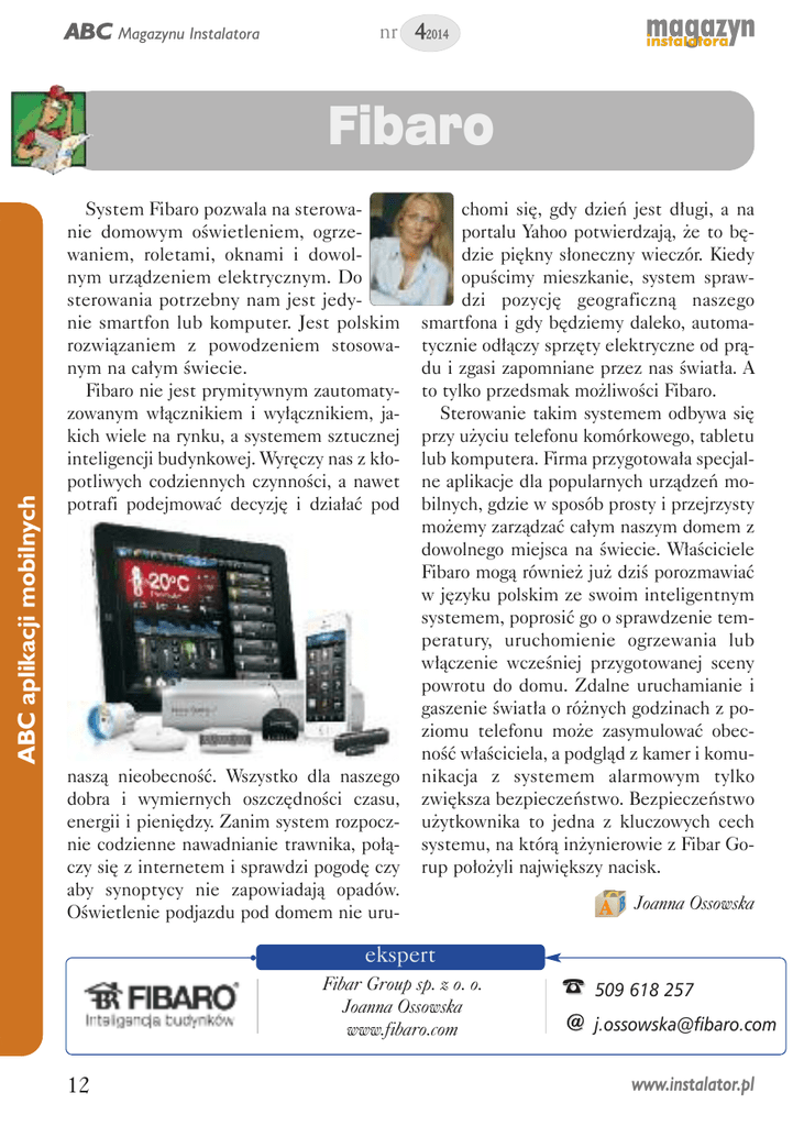 ABC Magazynu Instalatora nr 42014 ABC aplikacji mobilnych Fibaro System Fibaro pozwala na sterowanie domowym oświetleniem, ogrzewaniem, roletami, oknami i dowolnym urządzeniem elektrycznym. Do sterowania potrzebny nam jest jedynie smartfon lub komputer. Jest polskim rozwiązaniem z powodzeniem stosowanym na całym świecie. Fibaro nie jest prymitywnym zautomatyzowanym włącznikiem i wyłącznikiem, jakich wiele na rynku, a systemem sztucznej inteligencji budynkowej. Wyręczy nas z kłopotliwych codziennych czynności, a nawet potrafi podejmować decyzję i działać pod naszą nieobecność. Wszystko dla naszego dobra i wymiernych oszczędności czasu, energii i pieniędzy. Zanim system rozpocznie codzienne nawadnianie trawnika, połączy się z internetem i sprawdzi pogodę czy aby synoptycy nie zapowiadają opadów. Oświetlenie podjazdu pod domem nie uru- chomi się, gdy dzień jest długi, a na portalu Yahoo potwierdzają, że to będzie piękny słoneczny wieczór. Kiedy opuścimy mieszkanie, system sprawdzi pozycję geograficzną naszego smartfona i gdy będziemy daleko, automatycznie odłączy sprzęty elektryczne od prądu i zgasi zapomniane przez nas światła. A to tylko przedsmak możliwości Fibaro. Sterowanie takim systemem odbywa się przy użyciu telefonu komórkowego, tabletu lub komputera. Firma przygotowała specjalne aplikacje dla popularnych urządzeń mobilnych, gdzie w sposób prosty i przejrzysty możemy zarządzać całym naszym domem z dowolnego miejsca na świecie. Właściciele Fibaro mogą również już dziś porozmawiać w języku polskim ze swoim inteligentnym systemem, poprosić go o sprawdzenie temperatury, uruchomienie ogrzewania lub włączenie wcześniej przygotowanej sceny powrotu do domu. Zdalne uruchamianie i gaszenie światła o różnych godzinach z poziomu telefonu może zasymulować obecność właściciela, a podgląd z kamer i komunikacja z systemem alarmowym tylko zwiększa bezpieczeństwo. Bezpieczeństwo użytkownika to jedna z kluczowych cech systemu, na którą inżynierowie z Fibar Gorup położyli największy nacisk. JoannaOssowska ekspert FibarGroupsp.zo.o. JoannaOssowska www.fibaro.com 12 ☎ 509 618 257 @ [email protected] www.instalator.pl