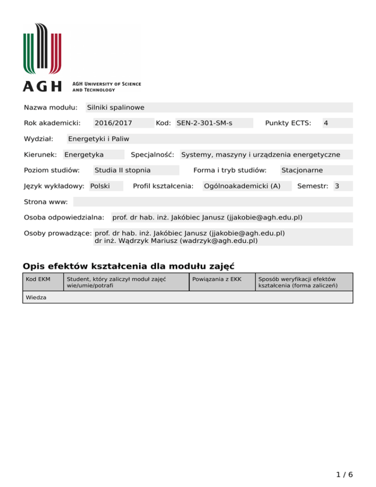 Nazwa modułu: Rok akademicki: Wydział: Kierunek: Silniki spalinowe 2016/2017 Kod: SEN-2-301-SM-s Punkty ECTS: 4 Energetyki i Paliw Energetyka Poziom studiów: Specjalność: Studia II stopnia Język wykładowy: Polski Systemy, maszyny i urządzenia energetyczne Forma i tryb studiów: Profil kształcenia: Stacjonarne Ogólnoakademicki (A) Semestr: 3 Strona www: Osoba odpowiedzialna: prof. dr hab. inż. Jakóbiec Janusz ([email protected]) Osoby prowadzące: prof. dr hab. inż. Jakóbiec Janusz ([email protected]) dr inż. Wądrzyk Mariusz ([email protected]) Opis efektów kształcenia dla modułu zajęć Kod EKM Student, który zaliczył moduł zajęć wie/umie/potrafi Powiązania z EKK Sposób weryfikacji efektów kształcenia (forma zaliczeń) Wiedza 1/6 Karta modułu - Silniki spalinowe M_W001 Student dysponuje wiedzą w zakresie ogólnej budowy silników spalinowych tłokowych, ich podziału wg: rodzaju zapłonu, sposobu tworzenia mieszanki, rodzaju paliwa, sposobu pracy, układu cylindrów i tłoków, a w szczególności zna: •cykle pracy silnika spalinowego o zapłonie samoczynnym i z zapłonem iskrowym •budowę tłokowych silników spalinowych (układy korbowe, rozrządu, kadłuby, głowice, układy chłodzenia, układy smarowania, układy oczyszczania spalin i tłumienia hałasu wylotu spalin) •wpływ czynników konstrukcyjnych i eksploatacyjnych na pracę silnika o ZS i ZI •doładowanie silników o ZS i ZI •wskaźniki pracy silników samochodowych •charakterystyki eksploatacyjne •właściwości dynamiczne silników •tendencje w zakresie rozwoju konstrukcji silników spalinowych •zasilania silników samochodowych paliwami alternatywnymi EN2A_W01, EN2A_W04, EN2A_W12 Egzamin M_W002 Student zdobył wiedzę dotyczącą: •oceny cykli pracy silnika spalinowego o zapłonie samoczynnym i iskrowym (w tym czterosuwowych i dwusuwowych) •budowy tłokowych silników spalinowych •wpływu czynników konstrukcyjnych i eksploatacyjnych na pracę silnika o ZS i ZI w tym efektów doładowania EN2A_W10, EN2A_W12 Egzamin M_U001 Student potrafi rozwiązywać podstawowe zadania dotyczące: •oceny cyklu pracy silnika spalinowego o ZI i ZS (w tym czterosuwowego i dwusuwowego) •budowy silników tłokowych spalinowych •wpływu czynników konstrukcyjnych i eksploatacyjnych na pracę silnika o ZS i ZI •bezpiecznej pracy silników o ZS i ZI zasilanych paliwem konwencjonalnym (ropopochodnym) i alternatywnym podczas badań hamownianych EN2A_U05, EN2A_U07 Wykonanie ćwiczeń laboratoryjnych, Aktywność na zajęciach, Kolokwium, Sprawozdanie M_U002 Student potrafi posługiwać się sprzętem laboratoryjnym będącym na wyposażeniu hamowni silnikowej i wykorzystać do pomiaru parametrów roboczych silnika EN2A_U04, EN2A_U07, EN2A_U12 Aktywność na zajęciach, Wykonanie ćwiczeń laboratoryjnych, Sprawozdanie, Kolokwium EN2A_K02, EN2A_K04, EN2A_K01 Udział w dyskusji Umiejętności Kompetencje społeczne M_K001 Student wie jak konstruktywnie należy współpracować w zespole rozwiązującym problemy dotyczące pomiarów silnikowych (sporządzać charakterystyki) 2/6 Karta modułu - Silniki spalinowe M_K002 Student angażuje się w dyskusję w grupie, jak również z prowadzącym i potrafi dobrze sformułować swoje argumenty EN2A_K03, EN2A_K01 Udział w dyskusji Matryca efektów kształcenia w odniesieniu do form zajęć Konwersatori um Zajęcia seminaryjne Zajęcia praktyczne Zajęcia terenowe Zajęcia warsztatowe - + - - - - - - E-learning Ćwiczenia projektowe + Inne Ćwiczenia laboratoryjne Forma zajęć Ćwiczenia audytoryjne Student, który zaliczył moduł zajęć wie/umie/potrafi Wykład Kod EKM Wiedza M_W001 Student dysponuje wiedzą w zakresie ogólnej budowy silników spalinowych tłokowych, ich podziału wg: rodzaju zapłonu, sposobu tworzenia mieszanki, rodzaju paliwa, sposobu pracy, układu cylindrów i tłoków, a w szczególności zna: •cykle pracy silnika spalinowego o zapłonie samoczynnym i z zapłonem iskrowym •budowę tłokowych silników spalinowych (układy korbowe, rozrządu, kadłuby, głowice, układy chłodzenia, układy smarowania, układy oczyszczania spalin i tłumienia hałasu wylotu spalin) •wpływ czynników konstrukcyjnych i eksploatacyjnych na pracę silnika o ZS i ZI •doładowanie silników o ZS i ZI •wskaźniki pracy silników samochodowych •charakterystyki eksploatacyjne •właściwości dynamiczne silników •tendencje w zakresie rozwoju konstrukcji silników spalinowych •zasilania silników samochodowych paliwami alternatywnymi - - 3/6 Karta modułu - Silniki spalinowe M_W002 Student zdobył wiedzę dotyczącą: •oceny cykli pracy silnika spalinowego o zapłonie samoczynnym i iskrowym (w tym czterosuwowych i dwusuwowych) •budowy tłokowych silników spalinowych •wpływu czynników konstrukcyjnych i eksploatacyjnych na pracę silnika o ZS i ZI w tym efektów doładowania + - + - - - - - - - - M_U001 Student potrafi rozwiązywać podstawowe zadania dotyczące: •oceny cyklu pracy silnika spalinowego o ZI i ZS (w tym czterosuwowego i dwusuwowego) •budowy silników tłokowych spalinowych •wpływu czynników konstrukcyjnych i eksploatacyjnych na pracę silnika o ZS i ZI •bezpiecznej pracy silników o ZS i ZI zasilanych paliwem konwencjonalnym (ropopochodnym) i alternatywnym podczas badań hamownianych + - + - - - - - - - - M_U002 Student potrafi posługiwać się sprzętem laboratoryjnym będącym na wyposażeniu hamowni silnikowej i wykorzystać do pomiaru parametrów roboczych silnika - - + - - - - - - - - Umiejętności Kompetencje społeczne M_K001 Student wie jak konstruktywnie należy współpracować w zespole rozwiązującym problemy dotyczące pomiarów silnikowych (sporządzać charakterystyki) - - + - - - - - - - - M_K002 Student angażuje się w dyskusję w grupie, jak również z prowadzącym i potrafi dobrze sformułować swoje argumenty + - + - - - - - - - - Treść modułu zajęć (program wykładów
