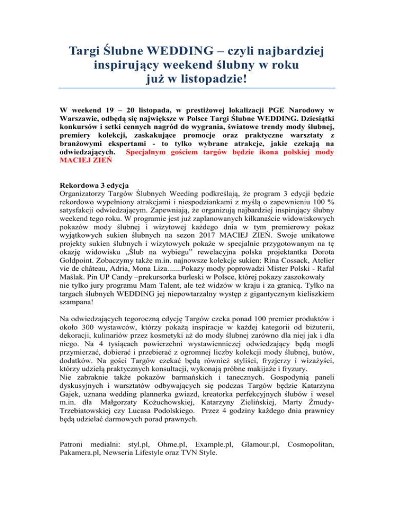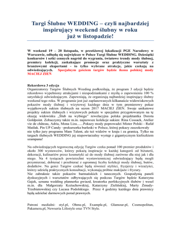 Targi Ślubne WEDDING – czyli najbardziej inspirujący weekend ślubny w roku już w listopadzie! W weekend 19 – 20 listopada, w prestiżowej lokalizacji PGE Narodowy w Warszawie, odbędą się największe w Polsce Targi Ślubne WEDDING. Dziesiątki konkursów i setki cennych nagród do wygrania, światowe trendy mody ślubnej, premiery kolekcji, zaskakujące promocje oraz praktyczne warsztaty z branżowymi ekspertami - to tylko wybrane atrakcje, jakie czekają na odwiedzających. Specjalnym gościem targów będzie ikona polskiej mody MACIEJ ZIEŃ Rekordowa 3 edycja Organizatorzy Targów Ślubnych Weeding podkreślają, że program 3 edycji będzie rekordowo wypełniony atrakcjami i niespodziankami z myślą o zapewnieniu 100 % satysfakcji odwiedzającym. Zapewniają, że organizują najbardziej inspirujący ślubny weekend tego roku. W programie jest już zaplanowanych kilkanaście widowiskowych pokazów mody ślubnej i wizytowej każdego dnia w tym premierowy pokaz wyjątkowych sukien ślubnych na sezon 2017 MACIEJ ZIEŃ. Swoje unikatowe projekty sukien ślubnych i wizytowych pokaże w specjalnie przygotowanym na tę okazję widowisku „Ślub na wybiegu” rewelacyjna polska projektantka Dorota Goldpoint. Zobaczymy także m.in. najnowsze kolekcje sukien: Rina Cossack, Atelier vie de château, Adria, Mona Liza.......Pokazy mody poprowadzi Mister Polski - Rafał Maślak. Pin UP Candy –prekursorka burleski w Polsce, której pokazy zaszokowały nie tylko jury programu Mam Talent, ale też widzów w kraju i za granicą. Tylko na targach ślubnych WEDDING jej niepowtarzalny występ z gigantycznym kieliszkiem szampana! Na odwiedzających tegoroczną edycję Targów czeka ponad 100 premier produktów i około 300 wystawców, którzy pokażą inspiracje w każdej kategorii od biżuterii, dekoracji, kulinariów przez kosmetyki aż do mody ślubnej zarówno dla niej jak i dla niego. Na 4 tysiącach powierzchni wystawienniczej odwiedzający będą mogli przymierzać, dobierać i przebierać z ogromnej liczby kolekcji mody ślubnej, butów, dodatków. Na gości Targów czekać będą również styliści, fryzjerzy i wizażyści, którzy udzielą praktycznych konsultacji, wykonają próbne makijaże i fryzury. Nie zabraknie także pokazów barmańskich i tanecznych. Gospodynią paneli dyskusyjnych i warsztatów odbywających się podczas Targów będzie Katarzyna Gajek, uznana wedding plannerka gwiazd, kreatorka perfekcyjnych ślubów i wesel m.in. dla Małgorzaty Kożuchowskiej, Katarzyny Zielińskiej, Marty ŻmudyTrzebiatowskiej czy Lucasa Podolskiego. Przez 4 godziny każdego dnia prawnicy będą udzielać darmowych porad prawnych. Patroni medialni: styl.pl, Ohme.pl, Example.pl, Glamour.pl, Cosmopolitan, Pakamera.pl, Newseria Lifestyle oraz TVN Style.