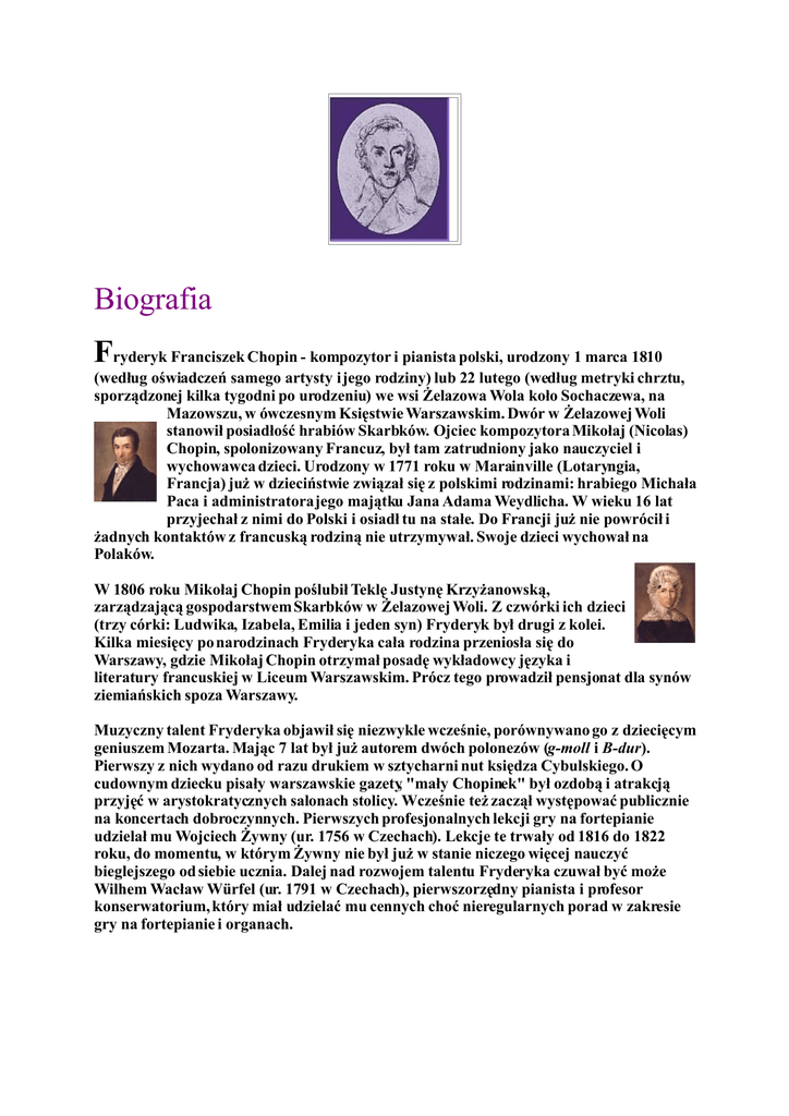 Biografia Fryderyk Franciszek Chopin - kompozytor i pianista polski, urodzony 1 marca 1810 (według oświadczeń samego artysty i jego rodziny) lub 22 lutego (według metryki chrztu, sporządzonej kilka tygodni po urodzeniu) we wsi Żelazowa Wola koło Sochaczewa, na Mazowszu, w ówczesnym Księstwie Warszawskim. Dwór w Żelazowej Woli stanowił posiadłość hrabiów Skarbków. Ojciec kompozytora Mikołaj (Nicolas) Chopin, spolonizowany Francuz, był tam zatrudniony jako nauczyciel i wychowawca dzieci. Urodzony w 1771 roku w Marainville (Lotaryngia, Francja) już w dzieciństwie związał się z polskimi rodzinami: hrabiego Michała Paca i administratora jego majątku Jana Adama Weydlicha. W wieku 16 lat przyjechał z nimi do Polski i osiadł tu na stałe. Do Francji już nie powrócił i żadnych kontaktów z francuską rodziną nie utrzymywał. Swoje dzieci wychował na Polaków. W 1806 roku Mikołaj Chopin poślubił Teklę Justynę Krzyżanowską, zarządzającą gospodarstwem Skarbków w Żelazowej Woli. Z czwórki ich dzieci (trzy córki: Ludwika, Izabela, Emilia i jeden syn) Fryderyk był drugi z kolei. Kilka miesięcy po narodzinach Fryderyka cała rodzina przeniosła się do Warszawy, gdzie Mikołaj Chopin otrzymał posadę wykładowcy języka i literatury francuskiej w Liceum Warszawskim. Prócz tego prowadził pensjonat dla synów ziemiańskich spoza Warszawy. Muzyczny talent Fryderyka objawił się niezwykle wcześnie, porównywano go z dziecięcym geniuszem Mozarta. Mając 7 lat był już autorem dwóch polonezów (g-moll i B-dur). Pierwszy z nich wydano od razu drukiem w sztycharni nut księdza Cybulskiego. O cudownym dziecku pisały warszawskie gazety, "mały Chopinek" był ozdobą i atrakcją przyjęć w arystokratycznych salonach stolicy. Wcześnie też zaczął występować publicznie na koncertach dobroczynnych. Pierwszych profesjonalnych lekcji gry na fortepianie udzielał mu Wojciech Żywny (ur. 1756 w Czechach). Lekcje te trwały od 1816 do 1822 roku, do momentu, w którym Żywny nie był już w stanie niczego więcej nauczyć bieglejszego od siebie ucznia. Dalej nad rozwojem talentu Fryderyka czuwał być może Wilhem Wacław Würfel (ur. 1791 w Czechach), pierwszorzędny pianista i profesor konserwatorium, który miał udzielać mu cennych choć nieregularnych porad w zakresie gry na fortepianie i organach. W latach 1823-26 Fryderyk pobierał naukę w Liceum Warszawskim, gdzie jego ojciec był profesorem. Letnie wakacje spędzał w wiejskich majątkach kolegów szkolnych w różnych rejonach kraju, m. in. dwukrotnie w Szafarni na Kujawach, gdzie zdradził szczególne zainteresowanie folklorem. Słuchał, notował teksty piosenek ludowych, uczestniczył w obrzędach (weselach, dożynkach), tańczył i grał na basetli z muzykantami wiejskimi, z czego zdawał szczegółowe relacje w listach. Polski (nizinny) folklor muzyczny w jego autentycznej, surowej postaci, z jego specyficzną tonalnością, bogactwem rytmów i tanecznym wigorem, poznał doskonale i czerpał z niego - pisząc w 1825 roku swoje pierwsze mazurki, a później następne. Nie zapomniał go do końca życia. Jesienią 1826 roku został studentem wydziału "teorii muzyki, jenerałbasu i kompozycji" warszawskiej Szkoły Głównej Muzyki (stanowiącej część Konserwatorium, a równocześnie związanej z Uniwersytetem Warszawskim), kierowanej przez Józefa Elsnera (ur. 1769 na Śląsku). W klasie fortepianu nie studiował. Elsner, zdając sobie sprawę z wyjątkowego talentu Chopina, pozwolił mu zgodnie z jego naturą i temperamentem koncentrować się na muzyce fortepianowej, był jednak nieugięty w sprawach dotyczących przedmiotów teoretycznych, zwłaszcza kontrapunktu. Chopin, obdarzony z natury wspaniałą inwencją melodyczną, łatwością swobodnego improwizowania, skłonnością do błyskotliwych efektów i pięknie brzmiących harmonii, wyrobił sobie w szkole Elsnera solidny warsztat, dyscyplinę i precyzję konstrukcji, odpowiedzialność za sens i logikę każdej nuty. W czasie studiów powstały pierwsze szeroko rozbudowane dzieła: Sonata c-moll, Wariacje op. 2 na temat z Don Juana Mozarta, Rondo à la Krakowiak, Fantazja op. 13 na tematy polskie (trzy ostatnie na fortepian z orkiestrą) oraz Trio g-moll na skrzypce, wiolonczelę i fortepian. Naukę w Szkole Głównej Muzyki Chopin ukończył w 1829 roku, a Elsner w raporcie po trzecim roku nauki zapisał: "Trzecioletni Szopen Fryderyk - szczególna zdatność, geniusz muzyczny". Po zakończeniu nauki Fryderyk planował dłuższy pobyt za granicą dla poznania życia muzycznego Europy i zdobycia sławy. Dotąd nie opuszczał Polski z wyjątkiem dwóch krótkich wyjazdów do Prus. W 1826 roku spędził wakacje w Bad Reinertz (dzisiejsze Duszniki-Zdrój) na Dolnym Śląsku, a w dwa lata później towarzyszył prof. Feliksowi Jarockiemu, przyjacielowi ojca, zaproszonemu na zjazd przyrodników, w podróży do Berlina, gdzie - nikomu nie znany - poprzestał tylko na prywatnej obserwacji życia muzycznego. Teraz miał śmielsze zamiary. Natychmiast po ukończeniu studiów, w lipcu 1829 roku udał się w towarzystwie znajomych na krótką wycieczkę do Wiednia. Dzięki Würflowi, który wprowadził go w towarzystwo muzyków, Chopin wystąpił dwukrotnie w Kärtnerthortheater, grając z orkiestrą Wariacje op. 2 na temat Mozarta i Rondo a la Krakowiak op. 14. Odniósł fenomenalny sukces u publiczności. Krytyka, jakkolwiek ganiła jego grę za małą siłę dźwięku, kompozycje również oceniła bardzo wysoko. W ślad za tym wydawca wiedeński Tobias Haslinger opublikował Wariacje na temat Mozarta (1830). Było to pierwsze wydanie utworu Chopina za granicą (dotąd publikował swoje utwory w Warszawie). Po powrocie do Warszawy Chopin, wolny już od szkolnych obowiązków, z tym większą pasją zajął się komponowaniem, pisząc m. in. dwa Koncerty fortepianowe z orkiestrą: fmoll i e-moll. W inspiracji Koncertu f-moll niemałą rolę 