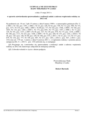 UCHWAŁA NR XXXVIII/386/13 RADY MIEJSKIEJ W ŁASKU z dnia 15 maja 2013 r. w sprawie zatwierdzenia sprawozdania z realizacji zadań z zakresu wspierania rodziny za 2012 rok Na podstawie art. 18 ust. 2 pkt 15 ustawy z dnia 8 marca 1990 r. o samorządzie gminnym (Dz. U. z 2001 r. Nr 142, poz. 1591, z 2002 r. Nr 23, poz. 220, Nr 62, poz. 558, Nr 113, poz. 984, Nr 153, poz. 1271, Nr 214, poz. 1806, z 2003 r. Nr 80 poz. 717, Nr 162, poz. 1568, z 2004 r. Nr 102, poz. 1055, Nr 116, poz. 1203, z 2005 r. Nr 172, poz.1441, Nr 175, poz. 1457, z 2006 r. Nr 17, poz. 128, Nr 181, poz. 1337, z 2007 r.Nr 48, poz. 327, Nr 138, poz. 974, Nr 173, poz. 1218, z 2008 r. Nr 180, poz. 1111, Nr 223, poz. 1458, z 2009 r. Nr 52, poz. 420, Nr 157, poz. 1241, z 2010 r. Nr 28, poz. 142 i poz. 146, Nr 40, poz. 230, Nr 106, poz. 675, z 2011 r. Nr 21, poz. 113, Nr 117, poz. 679, Nr 134, poz. 777, Nr 149, poz. 887, Nr 217, poz. 1281, z 2012 r. poz. 567, z 2013 r. poz. 153) oraz art. 179 ust. 1 ustawy z dnia 9 czerwca 2011 r. o wspieraniu rodziny i systemie pieczy zastępczej (Dz. U. z 2013 r. poz. 135) uchwala się, co następuje: § 1. Przyjmuje się i zatwierdza się sprawozdanie z realizacji zadań z zakresu wspierania rodziny za 2012 rok stanowiące załącznik do niniejszej uchwały. § 2. Uchwała wchodzi w życie z dniem podjęcia. Przewodniczący Rady Miejskiej w Łasku Robert Bartosik Id: 4473BA58-0171-4AAF-B8D1-83C4F66A3A81. Podpisany Strona 1 Załącznik do Uchwały Nr XXXVIII/386/13 Rady Miejskiej w Łasku z dnia 15 maja 2013 r. SPRAWOZDANIE Z REALIZACJI ZADAŃ Z ZAKRESU WSPIERANIA RODZINY ZA 2012 ROK DZIAŁ I. WSTĘP Rodzina jest najważniejszą i podstawową komórką społeczną, na której opiera się całe społeczeństwo. Występuje ona we wszystkich etapach rozwoju społeczeństwa i we wszystkich jego formach. Wywiera ona ogromny wpływ na rozwój fizyczny, psychiczny i społeczny jej członków, a w szczególności na dzieci. Wobec swoich członków rodzina pełni szereg zadań i funkcji takich jak funkcja: opiekuńcza, ekonomiczna, prokreacyjna, socjalizacyjna, wychowawcza, kulturowa i religijna. Funkcje te i zadania obejmują swoim zakresem wszystkie dziedziny życia rodziny i poszczególnych jej członków. Stanowią one nierozerwalną strukturę, a zakłócenia w realizacji choćby jednej z nich powoduje na ogół przejściową lub dłuższą niewydolność ogólnego funkcjonowania całej rodziny. Ustawa z dnia 9 czerwca 2011 r. o wspieraniu rodziny i systemie pieczy zastępczej, obowiązująca od dnia 1 stycznia 2012 r. zobowiązuje do wspierania rodzin przeżywających trudności w wypełnianiu funkcji opiekuńczo – wychowawczych poprzez podejmowanie planowanych działań mających na celu przywrócenie tym rodzinom zdolności do wypełniania tych funkcji. System pieczy zastępczej oznacza tu zespół osób, instytucji i działań mających na celu zapewnienie czasowej opieki i wychowania dzieciom w przypadkach niemożności sprawowania tej opieki i wychowania przez rodziców. Obowiązek wspierania rodzin przeżywających trudności w wypełnianiu funkcji opiekuńczo – wychowawczych oraz organizacji pieczy zastępczej, w zakresie ustalonym ustawą spoczywa na jednostkach samorządu terytorialnego oraz na organach administracji rządowej. DZIAŁ II. CHARAKTERYSTYKA RODZIN KORZYSTAJĄCYCH ZE WSPARCIA i POMOCY MIEJSKO-GMINNEGO OŚRODKA POMOCY SPOŁECZNEJ W ŁASKU W 2012 r. W 2012 roku Miejsko – Gminny Ośrodek Pomocy Społecznej objął pomocą i wsparciem 830 rodzin zamieszkałych na terenie gminy Łask, w tym 262 rodziny wiejskie, w których żyło łącznie 2112 osób. Ze świadczeń pieniężnych skorzystały 432 rodziny, w tym 127 rodzin z terenu wsi. Pomocą w formie pracy socjalnej objęto łącznie 716 rodzin, w których żyło 1761 osób. Poniższa tabela prezentuje typy rodzin objętych pomocą społeczną w 2012 roku Id: 4473BA58-0171-4AAF-B8D1-83C4F66A3A81. Podpisany Strona 1 Powody przyznania pomocy w 2012 roku przedstawia poniższa tabela: Id: 4473BA58-0171-4AAF-B8D1-83C4F66A3A81. Podpisany Strona 2 DZIAŁ III. PIECZA ZASTĘPCZA Zgodnie z art.191 ust.9 ustawy z dnia 9 czerwca 2011 roku o wspieraniu rodziny i systemie pieczy zastępczej (Dz. U. nr 149 poz. 887 z póź.zm.) gmina Łask zobowiązana jest do ponoszenia wydatków na opiekę i wychowanie dzieci w rodzinach zastępczych w wysokości: a) 10% wydatków na opiekę i wychowanie dziecka w pierwszym roku pobytu dziecka w pieczy zastępczej, b) 30% wydatków na opiekę i wychowanie dziecka w drugim roku pobytu dziecka w pieczy zastępczej, c) 50% wydatków na opiekę i wychowanie dziecka w trzecim i następnych latach pobytu dziecka w pieczy zastępczej Liczba dzieci przebywających w pieczy zastępczej w 2012 roku Id: 4473BA58-0171-4AAF-B8D1-83C4F66A3A81. Podpisany Strona 3 Na mocy postanowień Sądu Rejonowego w Łasku oraz zawartych porozumień z Powiatem Łaskim o ponoszeniu wydatków na utrzymanie dzieci w pieczy zastępczej, w 2012 roku 4 dzieci została umieszczona w spokrewnionych rodzinach zastępczych, 1 dziecko w rodzinie zastępczej niezawodowej oraz 4 rodzeństwa w Placówce Opiekuńczo – Wychowawczej w Łasku. Świadczenia pieniężne na pokrycie kosztów utrzymania wychowanków w rodzinach zastępczych są w części finansowane przez gminę. Z zaplanowanej kwoty 15 000 zł na rok 2012 z tytułu finansowania pobytu dzieci w pieczy zastępczej wydatkowano na ten cel sumę 14 428,71 zł. DZIAŁ IV. ASYSTENCI RODZINNI Praca z rodzinami przeżywającymi trudności w wypełnianiu funkcji opiekuńczo – wychowawczych, którą organizuje gmina lub podmiot któremu gmina zleciła realizację tego zadania polega w szczególności na : a) analizie sytuacji rodziny i środowiska rodzinnego oraz przyczyn kryzysu w rodzinie, b) wzmocnieniu roli i funkcji rodziny, c) rozwijaniu umiejętności opiekuńczo-wychowawczych rodziny, d) podniesieniu świadomości w zakresie planowania oraz funkcjonowania rodziny, e) pomocy w inte