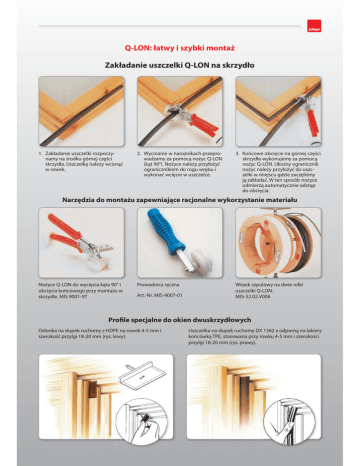 Q-LON: łatwy i szybki montaż Zakładanie uszczelki Q-LON na skrzydło 1. Zakładanie uszczelki rozpoczynamy na środku górnej części skrzydła. Uszczelkę należy wcisnąć w rowek. 2. Wycinanie w narożnikach przeprowadzamy za pomocą nożyc Q-LON (kąt 90°). Nożyce należy przyłożyć ogranicznikiem do rogu wrębu i wykonać wcięcie w uszczelce. 3. Końcowe obcięcie na górnej części skrzydła wykonujemy za pomocą nożyc Q-LON. Ukośny ogranicznik nożyc należy przyłożyć do uszczelki w miejscu gdzie zaczęliśmy ją zakładać. W ten sposób nożyce odmierzą automatycznie odstęp do obcięcia. Narzędzia do montażu zapewniające racjonalne wykorzystanie materiału Nożyce Q-LON do wycięcia kąta 90° i obcięcia końcowego przy montażu w skrzydle. MIS 9001-97 Prowadnica ręczna Art.-Nr. MIS-9007-01 Wózek szpulowy na dwie rolki uszczelki Q-LON. MIS-52.02.V006 Profile specjalne do okien dwuskrzydłowych Osłonka na słupek ruchomy z HDPE na rowek 4-5 mm i szerokość przylgi 18-20 mm (rys. lewy). Uszczelka na słupek ruchomy DX 1362 z odporną na lakiery końcówką TPE, stosowana przy rowku 4-5 mm i szerokości przylgi 18-20 mm (rys. prawy).