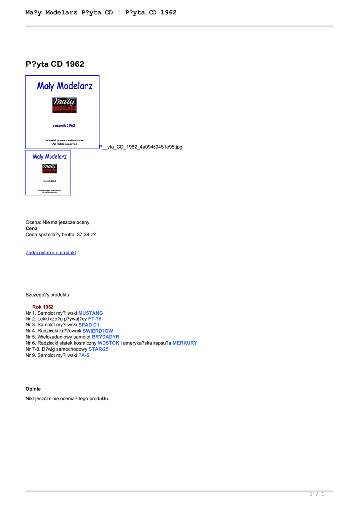 Ma?y Modelarz P?yta CD : P?yta CD 1962 P?yta CD 1962 P__yta_CD_1962_4a09469451e95.jpg Ocena: Nie ma jeszcze oceny Cena Cena sprzeda?y brutto: 37,38 z? Zadaj pytanie o produkt Szczegó?y produktu Rok 1962 Nr 1. Samolot my?liwski MUSTANG Nr 2. Lekki czo?g p?ywaj?cy PT-75 Nr 3. Samolot my?liwski SPAD C1 Nr 4. Radziecki kr??ownik SWIERD?OW Nr 5. Wielozadaniowy samolot BRYGADYR Nr 6. Radziecki statek kosmiczny WOSTOK i ameryka?ska kapsu?a MERKURY Nr 7-8. D?wig samochodowy STAR-25 Nr 9. Samolot my?liwski ?A-5 Opinie Nikt jeszcze nie ocenia? tego produktu. 1 / 1 Powered by TCPDF (www.tcpdf.org)