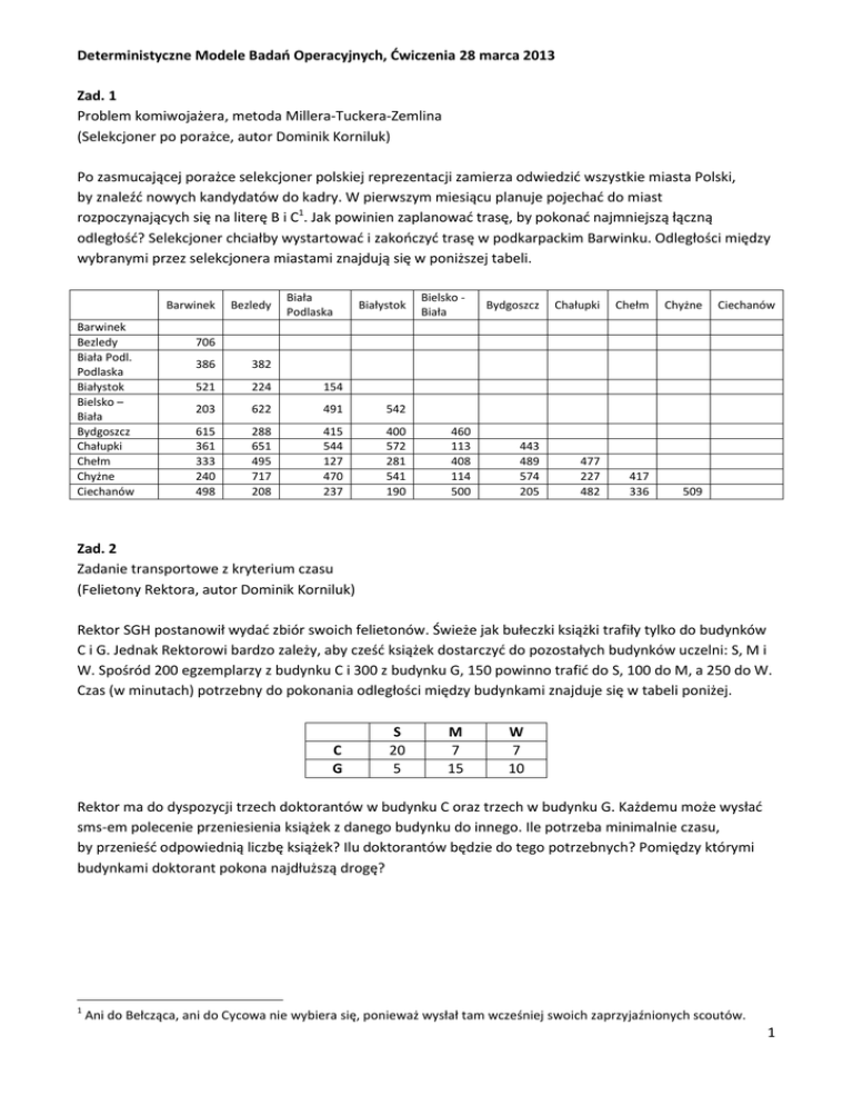 Deterministyczne Modele Badań Operacyjnych, Ćwiczenia 28 marca 2013 Zad. 1 Problem komiwojażera, metoda Millera-Tuckera-Zemlina (Selekcjoner po porażce, autor Dominik Korniluk) Po zasmucającej porażce selekcjoner polskiej reprezentacji zamierza odwiedzić wszystkie miasta Polski, by znaleźć nowych kandydatów do kadry. W pierwszym miesiącu planuje pojechać do miast rozpoczynających się na literę B i C1. Jak powinien zaplanować trasę, by pokonać najmniejszą łączną odległość? Selekcjoner chciałby wystartować i zakończyć trasę w podkarpackim Barwinku. Odległości między wybranymi przez selekcjonera miastami znajdują się w poniższej tabeli. Barwinek Barwinek Bezledy Biała Podl. Podlaska Białystok Bielsko – Biała Bydgoszcz Chałupki Chełm Chyżne Ciechanów Bezledy Biała Podlaska Białystok Bielsko Biała Bydgoszcz Chałupki Chełm Chyżne 443 489 574 205 477 227 482 417 336 509 Ciechanów 706 386 382 521 224 154 203 622 491 542 615 361 333 240 498 288 651 495 717 208 415 544 127 470 237 400 572 281 541 190 460 113 408 114 500 Zad. 2 Zadanie transportowe z kryterium czasu (Felietony Rektora, autor Dominik Korniluk) Rektor SGH postanowił wydać zbiór swoich felietonów. Świeże jak bułeczki książki trafiły tylko do budynków C i G. Jednak Rektorowi bardzo zależy, aby cześć książek dostarczyć do pozostałych budynków uczelni: S, M i W. Spośród 200 egzemplarzy z budynku C i 300 z budynku G, 150 powinno trafić do S, 100 do M, a 250 do W. Czas (w minutach) potrzebny do pokonania odległości między budynkami znajduje się w tabeli poniżej. C G S 20 5 M 7 15 W 7 10 Rektor ma do dyspozycji trzech doktorantów w budynku C oraz trzech w budynku G. Każdemu może wysłać sms-em polecenie przeniesienia książek z danego budynku do innego. Ile potrzeba minimalnie czasu, by przenieść odpowiednią liczbę książek? Ilu doktorantów będzie do tego potrzebnych? Pomiędzy którymi budynkami doktorant pokona najdłuższą drogę? 1 Ani do Bełcząca, ani do Cycowa nie wybiera się, ponieważ wysłał tam wcześniej swoich zaprzyjaźnionych scoutów. 1 Zad. 3 Algebraiczne modelowanie warunków logicznych w problemach optymalizacyjnych (Warunki powtórzone z wykładu i kilka innych) jeśli pracownik X pracuje, to Y też pracuje pracują obaj albo żaden jeśli pracownik X nie pracuje, to Y też nie pracuje jeśli pracuje X i Y, to musi też pracować Z [(X=1 oraz Y=1) => Z=1] jeśli X nie pracuje lub Y nie pracuje, to Z nie pracuje [(X=0 lub Y=0) => Z=0] x jest zmieną nieparzysta x=5 lub x=7 lub x=13 x ≤ 3 lub x ≥ 10 x ≤ 1 lub y ≤ 2 lub z ≤ 3 y > 0 => x=1 Zad. 4 (Armator, autor dr Michał Jakubczyk) Armator posiada w trzech portach X, Y, Z odpowiednio 100, 150 i 300 jednostek towaru. Czterej kupcy zgłaszają zapotrzebowanie na towar z dostawą do portu A, B, C, D w ilościach 150, 50, 200 i 150 odpowiednio. Towar jest przewożony statkami o pojemności 50 jednostek. Znane jest ryzyko zatonięcia statku na danej trasie. Ryzyka są niezależne od siebie. Podaj plan przewozów minimalizujący ryzyko zatonięcia choć jednego statku. Prawdopodobieństwa zatonięcia statku na poszczególnych trasach są podane w tabeli poniżej: A B C D X 5% 7% 3% 4% Y 4% 2% 8% 3% Z 1% 4% 5% 9% 2