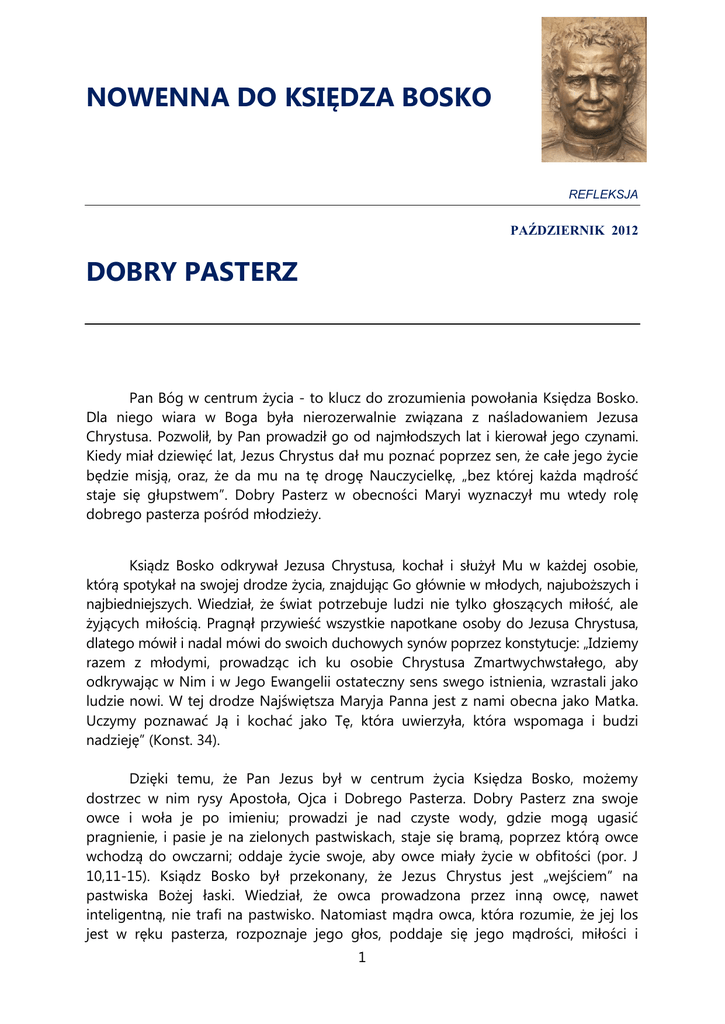 NOWENNA DO KSIĘDZA BOSKO REFLEKSJA PAŹDZIERNIK 2012 DOBRY PASTERZ Pan Bóg w centrum życia - to klucz do zrozumienia powołania Księdza Bosko. Dla niego wiara w Boga była nierozerwalnie związana z naśladowaniem Jezusa Chrystusa. Pozwolił, by Pan prowadził go od najmłodszych lat i kierował jego czynami. Kiedy miał dziewięć lat, Jezus Chrystus dał mu poznać poprzez sen, że całe jego życie będzie misją, oraz, że da mu na tę drogę Nauczycielkę, „bez której każda mądrość staje się głupstwem”. Dobry Pasterz w obecności Maryi wyznaczył mu wtedy rolę dobrego pasterza pośród młodzieży. Ksiądz Bosko odkrywał Jezusa Chrystusa, kochał i służył Mu w każdej osobie, którą spotykał na swojej drodze życia, znajdując Go głównie w młodych, najuboższych i najbiedniejszych. Wiedział, że świat potrzebuje ludzi nie tylko głoszących miłość, ale żyjących miłością. Pragnął przywieść wszystkie napotkane osoby do Jezusa Chrystusa, dlatego mówił i nadal mówi do swoich duchowych synów poprzez konstytucje: „Idziemy razem z młodymi, prowadząc ich ku osobie Chrystusa Zmartwychwstałego, aby odkrywając w Nim i w Jego Ewangelii ostateczny sens swego istnienia, wzrastali jako ludzie nowi. W tej drodze Najświętsza Maryja Panna jest z nami obecna jako Matka. Uczymy poznawać Ją i kochać jako Tę, która uwierzyła, która wspomaga i budzi nadzieję” (Konst. 34). Dzięki temu, że Pan Jezus był w centrum życia Księdza Bosko, możemy dostrzec w nim rysy Apostoła, Ojca i Dobrego Pasterza. Dobry Pasterz zna swoje owce i woła je po imieniu; prowadzi je nad czyste wody, gdzie mogą ugasić pragnienie, i pasie je na zielonych pastwiskach, staje się bramą, poprzez którą owce wchodzą do owczarni; oddaje życie swoje, aby owce miały życie w obfitości (por. J 10,11-15). Ksiądz Bosko był przekonany, że Jezus Chrystus jest „wejściem” na pastwiska Bożej łaski. Wiedział, że owca prowadzona przez inną owcę, nawet inteligentną, nie trafi na pastwisko. Natomiast mądra owca, która rozumie, że jej los jest w ręku pasterza, rozpoznaje jego głos, poddaje się jego mądrości, miłości i 1 przewodnictwu. Dobry pasterz to tajemnica bliskości i autorytetu. Wszystkie te cechy dostrzegamy w naszym Ojcu i Nauczycielu. Ksiądz Bosko nieustanne troszczył się o wzmacnianie więzi z Chrystusem, Dobrym Pasterzem, we wszystkich okolicznościach życia, niezależnie od tego, czy znajdował się nad „spokojnymi wodami”, czy też przyszło mu iść „ciemną doliną”. Idąc za jego przykładem i my pragniemy odkryć Boże wezwanie skierowane do każdego z nas. Chcemy je usłyszeć i przyjąć sercem i życiem. Poprzez wpatrywanie się na modlitwie w Jezusa Chrystusa, Dobrego Pasterza, Ksiądz Bosko „uczył się” systemu prewencyjnego: wdzięczności, troski, poświęcania się tym, którzy się zagubili, poznawania ich życia oraz osobowości, hojnego dzielenia się miłością, dzięki której czuli się kochani. Zgłębiając życie Księdza Bosko zjednoczone z Panem Bogiem oraz porównując go do dobrego pasterza dzieci i młodzieży, możemy zatrzymać się nad trzema aspektami: wołaniem po imieniu, troską o obfitość oraz czujnością na niebezpieczeństwa. 1. Wołanie po imieniu Osoba nie może poczuć się kochana, jeżeli nikt na nią w sposób szczególny nie zwraca uwagi. Jezus, Dobry Pasterz, „woła” swoje owce, każdą po imieniu, wydobywa je z anonimowości stada. Wypowiada moje i twoje imię swoimi ustami, ustanawiając tym samym ściśle osobistą relację oraz powierzając konkretną misję. Ksiądz Bosko znał wszystkich swoich wychowanków po imieniu. Co więcej, znał ich wiek, rodzinę, pochodzenie, potrzeby, marzenia, warunki materialne, problemy. W sposób przyjacielski przyjmował każdego takim, jakim był, oferował pomoc, ale równocześnie obmyślał strategię wzrostu duchowego. Znane było jego „słówko na ucho”, aby dotrzeć do każdego osobiście, by skutecznie wspólnie kroczyć i wzrastać. Każdy chłopiec czuł się osobiście kochany przez Księdza Bosko, czuł się jego ulubieńcem, osobą szczególną, tak jakby był jedynakiem. To dlatego w momencie ciężkiej choroby, kiedy chłopcy przychodzili do świętego i napotykali trudności w spotkaniu go osobiście, mówili: „gdyby Ksiądz Bosko wiedział, że tu jestem, na pewno by mnie wpuścił”. „Młodzi kochali go... Unikali wszystkiego, co mogłoby sprawić mu przykrość. W posłuszeństwie ich nie było nic służalczego, lecz prawdziwie synowskie uczucie. Zdarzało się, że czasem ktoś postępował właściwie bardziej przez wzgląd na niego samego niż na Pana Boga. Wówczas Święty upominał: „Pan Bóg znaczy więcej niż Ksiądz Bosko!” (MB III, rodz. 52). Pod koniec jego życia teolog Piano mówił: „Miłość, jaką żywiliśmy ku Tobie wówczas, żywimy i teraz (…) Nakazuje nam ją wdzięczność za otrzymane dobrodziejstwa (…), owe dobre podstawy, święte zasady, zdrowe wychowanie, dzięki którym możemy zachować się stałymi w dobrym. Wszystko to 2 zawdzięczamy Tobie. I czyż mielibyśmy o Tobie zapomnieć? Przenigdy! (…) pierwej ustanie bić to serce, niżby miało zaprzestać Cię kochać. Miłość ku Tobie uważamy za probierz miłości Bożej!”(MB XVIII, rodz. 16) W ostatnich latach swojego życia, przy innej okazji, Ksiądz Bosko powiedział do grupy byłych wychowanków - duchownych i świeckich: „Teraz na mnie przypada kolej odpowiedzieć, kto jest przeze mnie więcej kochany. Powiedzcie sami: to jest moja ręka; który z pięciu palców jest mi więcej drogi? Którego z nich chciałbym się pozbyć? Na pewno żadnego, ponieważ wszystkie pięć są mi jednakowo drogie i jednakowo potrzebne. Otóż oświadczam wam, że kocham was wszystkich, wszystkich bez wyjątku i bez miary” (MB XVIII, rodz. 5). 2. Troska o obfitość „Ja przyszedłem po to, aby [owce] miały życie i m