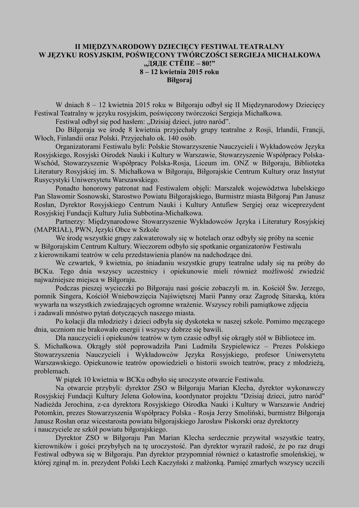 II MIĘDZYNARODOWY DZIECIĘCY FESTIWAL TEATRALNY W JĘZYKU ROSYJSKIM, POŚWIĘCONY TWÓRCZOŚCI SERGIEJA MICHAŁKOWA „ДЯДЕ СТЁПЕ – 80!” 8 – 12 kwietnia 2015 roku Biłgoraj W dniach 8 – 12 kwietnia 2015 roku w Biłgoraju odbył się II Międzynarodowy Dziecięcy Festiwal Teatralny w języku rosyjskim, poświęcony twórczości Sergieja Michałkowa. Festiwal odbył się pod hasłem: „Dzisiaj dzieci, jutro naród”. Do Biłgoraja we środę 8 kwietnia przyjechały grupy teatralne z Rosji, Irlandii, Francji, Włoch, Finlandii oraz Polski. Przyjechało ok. 140 osób. Organizatorami Festiwalu byli: Polskie Stowarzyszenie Nauczycieli i Wykładowców Języka Rosyjskiego, Rosyjski Ośrodek Nauki i Kultury w Warszawie, Stowarzyszenie Współpracy PolskaWschód, Stowarzyszenie Współpracy Polska-Rosja, Liceum im. ONZ w Biłgoraju, Biblioteka Literatury Rosyjskiej im. S. Michałkowa w Biłgoraju, Biłgorajskie Centrum Kultury oraz Instytut Rusycystyki Uniwersytetu Warszawskiego. Ponadto honorowy patronat nad Festiwalem objęli: Marszałek województwa lubelskiego Pan Sławomir Sosnowski, Starostwo Powiatu Biłgorajskiego, Burmistrz miasta Biłgoraj Pan Janusz Rosłan, Dyrektor Rosyjskiego Centrum Nauki i Kultury Antufiew Sergiej oraz wiceprezydent Rosyjskiej Fundacji Kultury Julia Subbotina-Michałkowa. Partnerzy: Międzynarodowe Stowarzyszenie Wykładowców Języka i Literatury Rosyjskiej (MAPRIAŁ), PWN, Języki Obce w Szkole We środę wszystkie grupy zakwaterowały się w hotelach oraz odbyły się próby na scenie w Biłgorajskim Centrum Kultury. Wieczorem odbyło się spotkanie organizatorów Festiwalu z kierownikami teatrów w celu przedstawienia planów na nadchodzące dni. We czwartek, 9 kwietnia, po śniadaniu wszystkie grupy teatralne udały się na próby do BCKu. Tego dnia wszyscy uczestnicy i opiekunowie mieli również możliwość zwiedzić najważniejsze miejsca w Biłgoraju. Podczas pieszej wycieczki po Biłgoraju nasi goście zobaczyli m. in. Kościół Św. Jerzego, pomnik Singera, Kościół Wniebowzięcia Najświętszej Marii Panny oraz Zagrodę Sitarską, która wywarła na wszystkich zwiedzających ogromne wrażenie. Wszyscy robili pamiątkowe zdjęcia i zadawali mnóstwo pytań dotyczących naszego miasta. Po kolacji dla młodzieży i dzieci odbyła się dyskoteka w naszej szkole. Pomimo męczącego dnia, uczniom nie brakowało energii i wszyscy dobrze się bawili. Dla nauczycieli i opiekunów teatrów w tym czasie odbył się okrągły stół w Bibliotece im. S. Michałkowa. Okrągły stół poprowadziła Pani Ludmiła Szypielewicz – Prezes Polskiego Stowarzyszenia Nauczycieli i Wykładowców Języka Rosyjskiego, profesor Uniwersytetu Warszawskiego. Opiekunowie teatrów opowiedzieli o historii swoich teatrów, pracy z młodzieżą, problemach. W piątek 10 kwietnia w BCKu odbyło się uroczyste otwarcie Festiwalu. Na otwarcie przybyli: dyrektor ZSO w Biłgoraju Marian Klecha, dyrektor wykonawczy Rosyjskiej Fundacji Kultury Jelena Gołowina, koordynator projektu "Dzisiaj dzieci, jutro naród" Nadieżda Jerochina, z-ca dyrektora Rosyjskiego Ośrodka Nauki i Kultury w Warszawie Andriej Potomkin, prezes Stowarzyszenia Współpracy Polska - Rosja Jerzy Smoliński, burmistrz Biłgoraja Janusz Rosłan oraz wicestarosta powiatu biłgorajskiego Jarosław Piskorski oraz dyrektorzy i nauczyciele ze szkół powiatu biłgorajskiego. Dyrektor ZSO w Biłgoraju Pan Marian Klecha serdecznie przywitał wszystkie teatry, kierowników i gości przybyłych na tę uroczystość. Pan dyrektor wyraził radość, że po raz drugi Festiwal odbywa się w Biłgoraju. Pan dyrektor przypomniał również o katastrofie smoleńskiej, w której zginął m. in. prezydent Polski Lech Kaczyński z małżonką. Pamięć zmarłych wszyscy uczcili minutą ciszy. Oficjalnego otwarcia Festiwalu dokonali burmistrz Biłgoraja Janusz Rosłan oraz wicestarosta powiatu biłgorajskiego Jarosław Piskorski. Władze miasta podkreśliły, że Festiwal jest nie tylko okazją do zaprezentowania swoich możliwości, umiejętności, ale także do nawiązania kontaktów, a nawet przyjaźni. Następnie zostały wręczone dyplomy i nagrody twórcom strony internetowej Festiwalu. Podziękowania otrzymali: Andrzej Szatowski – nauczyciel w LO im. ONZ w Biłgoraju oraz uczniowie szkoły – Łukasz Bartoszek i Kamil Żmudzki. Po prezentacji teatrów rozpoczęły się przesłuchania. Każdy teatr zaprezentował spektakl na podstawie wybranych utworów Sergieja Michałkowa. W przerwach pomiędzy spektaklami uczniowie Liceum im. ONZ śpiewali piosenki i recytowali wiersze w języku rosyjskim. Wszystkim wystąpieniom przysłuchiwało się jury, w skład którego weszli: rosyjski reżyser, scenarzysta i producent, a przede wszystkim wnuk Siergieja Michałkowa Jegor Konczałowski, rosyjski aktor teatralny i filmowy Iwan Kolesnikow, Prezes Polskiego Stowarzyszenia Nauczycieli i Wykładowców Języka Rosyjskiego Ludmiła Szypielewicz, Jerzy Smoliński – prezydent Stowarzyszenia Współpracy Polska-Rosja, Stefan Szmidt – polski aktor teatru i kino, Andriej Potomkin – zastepca dyrektora Rosyjskiego Centrum Nauki i Kultury w Warszawie. Przesłuchania zakończyły się ok. godz. 17.30. Następnie odbyło się spotkanie uczestników Festiwalu z wnukiem Siergieja Michałkowa Jegorem Konczałowskim i aktorem Iwanem Kolesnikowym. Po kolacji, w Liceum uczestnicy obejrzeli prezentację o Polsce, a następnie wzięli udział w konkursie na temat Polski. Uczniowie naszej szkoły nauczyli gości tańczyć poloneza oraz nauczyli kilku polskich piosenek. Było dużo śmiechu i zabawy, wszyscy dobrze się bawili. W tym samym czasie w Bibliotece im. S. Michałkowa odbyło się spotkanie Jegora Konczałowskiego i Iwana Kolesnikowa z kierownikami teatrów i nauczycielami języka rosyjskiego. W sobotę 11 kwietnia do godz. 13. 00 dalej odbywały się spektakle na scenie BCKu. Po obiedzie jury udało się na naradę. W tym czasie