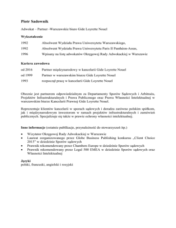 Piotr Sadownik Adwokat – Partner -Warszawskie biuro Gide Loyrette Nouel Wykształcenie 1992 Absolwent Wydziału Prawa Uniwersytetu Warszawskiego, 1992 Absolwent Wydziału Prawa Uniwersytetu Paris II Panthéon-Assas, 1996 Wpisany na listę adwokatów Okręgowej Rady Adwokackiej w Warszawie Kariera zawodowa od 2016 Partner międzynarodowy w kancelarii Gide Loyrette Nouel od 1999 Partner w warszawskim biurze Gide Loyrette Nouel 1993 rozpoczął pracę w kancelarii Gide Loyrette Nouel Obecnie jest partnerem odpowiedzialnym za Departamenty Sporów Sądowych i Arbitrażu, Projektów Infrastrukturalnych i Prawa Publicznego oraz Prawa Własności Intelektualnej w warszawskim biurze Kancelarii Prawnej Gide Loyrette Nouel. Reprezentuje klientów kancelarii w sporach sądowych i doradza zarówno polskim spółkom, jak i międzynarodowym inwestorom w ramach projektów infrastrukturalnych i zamówień publicznych. Specjalizuje się także w prawie ochrony własności intelektualnej. Inne informacje (ostatnie publikacje, przynależność do stowarzyszeń itp.) Wizytator Okręgowej Rady Adwokackiej w Warszawie Laureat zorganizowanego przez Globe Business Publishing konkursu „Client Choice 2015” w dziedzinie Sporów sądowych Prawnik rekomendowany przez Chambers Europe w dziedzinie Sporów sądowych Prawnik rekomendowany przez Legal 500 EMEA w dziedzinie Sporów sądowych oraz Własności Intelektualnej Języki polski, francuski, angielski i rosyjski