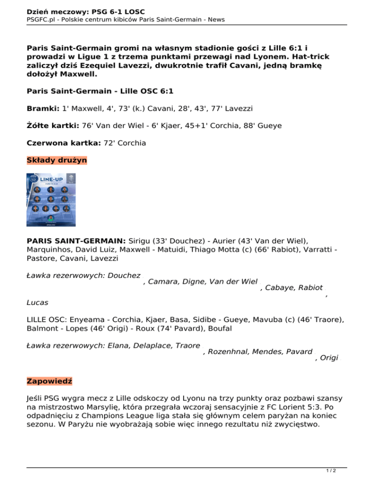 Dzień meczowy: PSG 6-1 LOSC PSGFC.pl - Polskie centrum kibiców Paris Saint-Germain - News Paris Saint-Germain gromi na własnym stadionie gości z Lille 6:1 i prowadzi w Ligue 1 z trzema punktami przewagi nad Lyonem. Hat-trick zaliczył dziś Ezequiel Lavezzi, dwukrotnie trafił Cavani, jedną bramkę dołożył Maxwell. Paris Saint-Germain - Lille OSC 6:1 Bramki: 1' Maxwell, 4', 73' (k.) Cavani, 28', 43', 77' Lavezzi Żółte kartki: 76' Van der Wiel - 6' Kjaer, 45+1' Corchia, 88' Gueye Czerwona kartka: 72' Corchia Składy drużyn PARIS SAINT-GERMAIN: Sirigu (33' Douchez) - Aurier (43' Van der Wiel), Marquinhos, David Luiz, Maxwell - Matuidi, Thiago Motta (c) (66' Rabiot), Varratti Pastore, Cavani, Lavezzi Ławka rezerwowych: Douchez ↑ , Camara, Digne, Van der Wiel ↑ , Cabaye, Rabiot ↑ , Lucas LILLE OSC: Enyeama - Corchia, Kjaer, Basa, Sidibe - Gueye, Mavuba (c) (46' Traore), Balmont - Lopes (46' Origi) - Roux (74' Pavard), Boufal Ławka rezerwowych: Elana, Delaplace, Traore ↑ , Rozenhnal, Mendes, Pavard ↑ , Origi ↑ Zapowiedź Jeśli PSG wygra mecz z Lille odskoczy od Lyonu na trzy punkty oraz pozbawi szansy na mistrzostwo Marsylię, która przegrała wczoraj sensacyjnie z FC Lorient 5:3. Po odpadnięciu z Champions League liga stała się głównym celem paryżan na koniec sezonu. W Paryżu nie wyobrażają sobie więc innego rezultatu niż zwycięstwo. 1/2 Dzień meczowy: PSG 6-1 LOSC PSGFC.pl - Polskie centrum kibiców Paris Saint-Germain - News Sytuacja kadrowa paryskiej drużyny stopniowo ulega poprawie. Do kadry meczowej po kontuzji wraca Thiago Motta. Najprawdopodobniej nie zagra on jeszcze w meczu. Wciąż nieobecny jest natomiast Thiago Silva. Drugi mecz zawieszenia odcierpieć musi Zlatan Ibrahimović. Pełna kadra na spotkanie z Lille dostępna jest pod tym linkiem. Prawdziwy szpital ma w swojej drużynie trener René Girard. Kontuzjowani są Franck Beria, Michael Frey, Adama Soumaoro oraz Marvin Martin. Dodatkowo na urazy narzekają również David Rozehnal i Jonathan Delaplace, którzy pomimo znalezienia się w kadrze meczowej, nie mogą być jeszcze pewni występu w Parku Książąt. Trzy z pięciu ostatnich spotkań obu zespołów wygrał PSG (dwa razy 1:0, raz 3:1). W pozostałych dwóch padły remisy (1:1, 2:2). Ostatnia porażka Paryża w meczu z Lille to rezultat 2:1, z 29 kwietnia 2012 roku. Dzisiejszy mecz sędziował będzie Clément Turpin. Asystować mu będą Frédéric Cano i Nicolas Danos. Arbiter techniczy to Yohann Rouinsard. PARIS SAINT-GERMAIN - Lille OSC Ligue 1, 34. kolejka Parc des Princes 25.04.2015, godz. 17:00 Transmisja: brak w PL TV; we Francji Canal+ Przewidywany skład PSG wg PSGFC.pl Sirigu - Aurier, Marquinhos, David Luiz, Maxwell - Pastore, Cabaye, Matuidi - Lucas, Cavani, Lavezzi Wypowiedzi przedmeczowe Laurent Blanc: "Wielkie wyzwanie" Serge Aurier: "Ekscytujący mecz" Autor: Bercik 2/2 Powered by TCPDF (www.tcpdf.org)