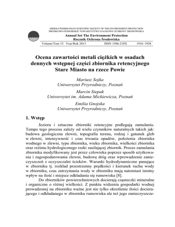 MIDDLE POMERANIAN SCIENTIFIC SOCIETY OF THE ENVIRONMENT PROTECTION ŚRODKOWO-POMORSKIE TOWARZYSTWO NAUKOWE OCHRONY ŚRODOWISKA Annual Set The Environment Protection Rocznik Ochrona Środowiska Volume/Tom 15. Year/Rok 2013 ISSN 1506-218X 1916–1928 Ocena zawartości metali ciężkich w osadach dennych wstępnej części zbiornika retencyjnego Stare Miasto na rzece Powie Mariusz Sojka Uniwersytet Przyrodniczy, Poznań Marcin Siepak Uniwersytet im. Adama Mickiewicza, Poznań Emilia Gnojska Uniwersytet Przyrodniczy, Poznań 1. Wstęp Jeziora i sztuczne zbiorniki retencyjne podlegają zamulaniu. Tempo tego procesu zależy od wielu czynników naturalnych takich jak: budowa geologiczna zlewni, topografia terenu, rodzaj i gatunek gleb w zlewni, intensywność i czas trwania opadów, położenia zbiornika wodnego w zlewni, typu zbiornika, wieku zbiornika, wielkości zbiornika oraz reżimu hydrologicznego rzeki zasilającej zbiornik. Proces zamulania zbiornika modyfikowany jest przez człowieka poprzez sposób użytkowania i zagospodarowania zlewni, budowę dróg oraz wprowadzenie zanieczyszczeń z oczyszczalni ścieków. Warunki hydrodynamiczne panujące w zbiorniku tj. rozkład przestrzenny prędkości i kierunek ruchu wody w zbiorniku, czas zatrzymania wody w zbiorniku mają natomiast istotny wpływ na ilość i miejsce odkładania się rumowiska [8]. Do zbiorników powierzchniowych docierają cząsteczki mineralne i organiczne o różnej wielkości. Z punktu widzenia gospodarki wodnej prowadzonej na zbiorniku ważne jest nie tylko określenie ilości docierającego i odkładanego w zbiorniku rumowiska ale też jego zanieczyszcze- Ocena zawartości metali ciężkich w osadach dennych… 1917 nie. Skład chemiczny osadów dennych jest zależny od typów i rodzajów gleb w zlewni, użycia nawozów sztucznych i środków ochrony roślin [5]. Innymi źródłami zanieczyszczeń są m.in.: resztki roślinne, osady ściekowe, odcieki ze składowisk odpadów, popioły z elektrowni i elektrociepłowni, jak również ścieki przemysłowe pochodzące głównie z przemysłu metalurgicznego, elektrochemicznego i chemicznego [4]. Monitorowanie stężeń metali ciężkich w osadach dennych zbiorników wodnych jest jedną z metod, która pozwala ocenić stan zanieczyszczenia środowiska wodnego. Niektóre metale ciężkie, takie jak kadm, miedź, ołów i cynk ze względu na ich możliwość biologicznej akumulacji tworzą szczególne zagrożenie dla organizmów żywych [6]. Celem pracy była próba oceny przestrzennej zmienności stężeń metali ciężkich oraz składu granulometrycznego osadów dennych na przykładzie wstępnej części zbiornika retencyjnego Stare Miasto na rzece Powie. 2. Materiały i metody 2.1. Teren badań Obszar zlewni rzeki Powy znajduje się w obrębie północnej części makroregionu Nizina Południowowielkopolska, w mezoreginach: Dolina Konińska, Równina Rychwalska i Wysoczyzna Turecka [9]. Rzeka Powa jest ciekiem trzeciego rzędu, lewobrzeżnym dopływem Warty i uchodzi do niej w miejscowości Rumin. Zlewnia rzeki Powy pod względem wielkości zalicza się do zlewni średnich jej powierzchnia wynosi 344,48 km2. Długość rzeki wynosi 48,23 km a gęstość sieci rzecznej wynosi 0,26 km·km-2. Profil zamykający zlewnię znajduje się na wysokości 77,0 m n.p.m., natomiast wysokość na dziale wodnym wynosi 130,0 m n.p.m. Dolny bieg rzeki Powy wyróżnia duży spadek wynoszący około 0,9‰, który miejscami zwiększa się nawet do około 1,6‰. Natomiast średni spadek podłużny zlewni jest równy 1,09‰. Średnie nachylenie zlewni przyjmuje wartość 6,14‰. Obszar zlewni rzeki Powy pod względem struktury użytkowania jest bardzo urozmaicony. Niewiele ponad połowę (52%) powierzchni zlewni rzeki Powy zajmują grunty orne. W odniesieniu do całej powierzchni analizowanego obszaru tereny zalesione stanowią ponad 27%, łąki nieco ponad 14% a tereny zabudowane 3,1%. W zlewni rzeki Powy dominują utwory o składzie granulometrycznym piasków słabo gliniastych (51%), piasków luźnych (16%) oraz piasków gliniastych lekkich (11%). 1918 Mariusz Sojka, Marcin Siepak, Emilia Gnojska Rys. 1. Położenie obiektu badań Fig. 1. Study site location Zbiornik Stare Miasto powstał w wyniku Programu Małej Retencji, którego celem jest zarówno poprawa zdolności retencyjnych zlewni, jak również ochrona przed powodzią i suszą. Zbiornik Stare Miasto powstał poprzez przegrodzenie doliny rzeki Powy zaporą czołową zlokalizowaną w 9+100 km biegu rzeki. Dla zbiornika retencyjnego Stare Miasto powierzchnia zlewni w przekroju zapory wynosi 299,7 km2, co stanowi 87% całkowitej powierzchni zlewni. Powierzchnia terenu przeznaczona pod wybudowanie zbiornika wynosiła 144 ha. Całkowita pojemność zbiornika przy normalnym poziomie piętrzenia wynosi 2,159 mln m3, pojemność użytkowa jest znacznie mniejsza i wynosi 1,216 mln m3. Natomiast pojemność martwa zbiornika przy minimalnym poziomie piętrzenia wynosi tylko 0,943 mln m3. Średnia głębokość zbiornika wynosi 2,38 m, a długość to 4,90 km. Maksymalny poziom piętrzenia (max PP) znajduje się na rzędnej 94,00 m n.p.m. Normalny poziom piętrzenia (NPP) znajduje się na rzędnej 93,50 m n.p.m., natomiast powierzchnia zalewu przy tym poziomie piętrzenia jest równa 90,68 ha. Rzędna piętrzenia przy minimalnym poziomie piętrzenia (min PP) wynosi 92,00 m n.p.m. Przy tym poziomie piętrzenia powierzchnia zalewu wynosi już Ocena zawartości metali ciężkich w osadach dennych… 1919 tylko 75,77 ha. Tereny przyległe znajdujące się pod wpływem oddziaływania zbiornika stanowią użytki rolne o niskiej klasie bonitacyjnej, nie posiadające większej wartości rolniczej. Przeprowadzone badania wstępnej części zbiornika Stare Miasto wykazały, że zbiornik podlega silnemu procesowi zamulania. 2.2. Prace terenowe i laboratoryjne Podstawą oceny były próbki osadów dennych pobrane z wstępnej części zbiornika retencyj