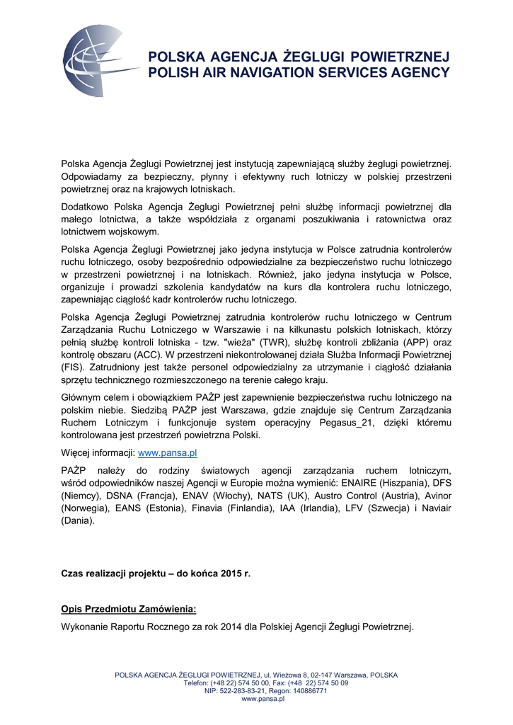 Polska Agencja Żeglugi Powietrznej jest instytucją zapewniającą służby żeglugi powietrznej. Odpowiadamy za bezpieczny, płynny i efektywny ruch lotniczy w polskiej przestrzeni powietrznej oraz na krajowych lotniskach. Dodatkowo Polska Agencja Żeglugi Powietrznej pełni służbę informacji powietrznej dla małego lotnictwa, a także współdziała z organami poszukiwania i ratownictwa oraz lotnictwem wojskowym. Polska Agencja Żeglugi Powietrznej jako jedyna instytucja w Polsce zatrudnia kontrolerów ruchu lotniczego, osoby bezpośrednio odpowiedzialne za bezpieczeństwo ruchu lotniczego w przestrzeni powietrznej i na lotniskach. Również, jako jedyna instytucja w Polsce, organizuje i prowadzi szkolenia kandydatów na kurs dla kontrolera ruchu lotniczego, zapewniając ciągłość kadr kontrolerów ruchu lotniczego. Polska Agencja Żeglugi Powietrznej zatrudnia kontrolerów ruchu lotniczego w Centrum Zarządzania Ruchu Lotniczego w Warszawie i na kilkunastu polskich lotniskach, którzy pełnią służbę kontroli lotniska - tzw. "wieża" (TWR), służbę kontroli zbliżania (APP) oraz kontrolę obszaru (ACC). W przestrzeni niekontrolowanej działa Służba Informacji Powietrznej (FIS). Zatrudniony jest także personel odpowiedzialny za utrzymanie i ciągłość działania sprzętu technicznego rozmieszczonego na terenie całego kraju. Głównym celem i obowiązkiem PAŻP jest zapewnienie bezpieczeństwa ruchu lotniczego na polskim niebie. Siedzibą PAŻP jest Warszawa, gdzie znajduje się Centrum Zarządzania Ruchem Lotniczym i funkcjonuje system operacyjny Pegasus_21, dzięki któremu kontrolowana jest przestrzeń powietrzna Polski. Więcej informacji: www.pansa.pl PAŻP należy do rodziny światowych agencji zarządzania ruchem lotniczym, wśród odpowiedników naszej Agencji w Europie można wymienić: ENAIRE (Hiszpania), DFS (Niemcy), DSNA (Francja), ENAV (Włochy), NATS (UK), Austro Control (Austria), Avinor (Norwegia), EANS (Estonia), Finavia (Finlandia), IAA (Irlandia), LFV (Szwecja) i Naviair (Dania). Czas realizacji projektu – do końca 2015 r. Opis Przedmiotu Zamówienia: Wykonanie Raportu Rocznego za rok 2014 dla Polskiej Agencji Żeglugi Powietrznej. POLSKA AGENCJA ŻEGLUGI POWIETRZNEJ, ul. Wieżowa 8, 02-147 Warszawa, POLSKA Telefon: (+48 22) 574 50 00, Fax: (+48 22) 574 50 09 NIP: 522-283-83-21, Regon: 140886771 www.pansa.pl Przedmiot zamówienia obejmuje: - projekt graficzny, - skład, - pomoc w korekcie językowej materiału (copywriting), - wykonanie Raportu Rocznego za rok 2014 do zamieszczenia na stronie www.bip.pansa.pl, www.pansa.pl, - przygotowanie okładki opakowanie, nagranie i dostarczenie do PAŻP 200 sztuk e-raportu na nośnik CD/DVD dla raportu rocznego 2014 - wykonany Raport Roczny za rok 2014 musi być w formie, która będzie nadawać się do ewentualnego druku (druk nie jest przedmiotem zamówienia) I. SPECYFIKACJA RAPORTU:   Raport Roczny za rok 2014 z możliwością umieszczenia go na stronach PAŻP i ewentualnego druku 200 egzemplarzy płyt wraz z nagranym i zrealizowanym przez wykonawcę Raportem Rocznym za rok 2014 wraz z projektem okładki 1) Format dokumentu: Zadaniem Wykonawcy jest opracowanie Raportu Rocznych PAŻP 2014 tzn.  przygotowanie ok. 90 stron Raportu (liczba stron dla formatu A4 – może ulec zmianie w przypadku wyboru innego formatu) z tekstem, fotografiami oraz elementami graficznymi  materiały źródłowe do obrobienia: tabele, wykresy, infografiki udostępnia Zamawiającego. Raport ma zostać przygotowane z w wersji elektronicznej w formie interaktywnego PDF z aktywnym spisem treści i nawigacji z przeznaczeniem do:  umieszczenia na stronach www.pansa.pl i www.bip.pansa.pl,  nagrania na płytach CD (nagranie raportu oraz zaprojektowanie okładki jest zadaniem Wykonawcy),  ewentualnego druku (druk nie jest przedmiotem zamówienia) Projekt graficzny i skład Raportu:  projekt okładki przedniej obowiązkowymi:  i tylnej dokumentu z następującymi elementami logotyp Polskiej Agencji Żeglugi Powietrznej, 2  tytuł „Raport Roczny Polskiej Agencji Żeglugi Powietrznej 2014”,  element graficzny lub zdjęciowy,  adres siedziby PAŻP i kontakt,  projekt strony ze spisem treści,  projekt stron tytułowych poszczególnych rozdziałów,  projekt stron wnętrza raportu, z następującymi elementami:  nagłówkiem/stopką  paginacją  projekt wykresów i tabel, do prezentacji danych liczbowych i statystyk (przekazane w wersji excel przez PAŻP),  projekt inforgrafik, które w ciekawy, przykuwający uwagę sposób dodatkowo eksponują ważne dla zamawiającego informacje lub dane liczbowe. Zamawiający przewiduje stworzenie minimum 10 infografik,  koncepcję prezentacji treści Raportu w dwóch językach – polskim i angielskim, z zastosowaniem zabiegów formalnych lub graficznych, które rozdzielą obie części. Zaproponowany format powinien być funkcjonalny i dopasowany do charakteru dokumentu (umożliwiający czytelną i efektowną prezentację zarówno części tekstowej, jak i graficznej przede wszystkim tabel i wykresów). II. Specyfikacja dla okładki do raportów rocznych na CD/DVD: Zadaniem Wykonawcy jest przygotowanie projektu grafiki okładki tekturowej i nadruku na CD/DVD Raportu Rocznego wraz z wgraniem materiału na nośnik (średnica płyty 12 cm). Projekt grafiki obejmować powinien:  opakowanie tekturowe, papier: tektura jednostronnie kredowana biała 300g, klejona z trzech boków, otwór po prawej stronie projektu; 3 cm od klejenia grzbietu, nadruk na opakowaniu: 4+0 (CMYK), folia błyszcząca 1+0,  opakowanie ma wewnątrz zawierać DIGIPACK przeźroczysty,  projekt pliku do druku „okładki” przedniej i tylnej opakowania 2-skrzydełkowego na 1 CD/DVD z następującymi elementami obowiązkowymi:  logotyp Polskiej Agencji Żeglugi Powietrznej,  tytuł „Raport Roczny Polskiej Agencji Żeglugi Powietrznej 2014”,  element graficzny lub zdjęciowy,  adres siedziby PAŻP i kontakt,  projekt nadruku na CD za