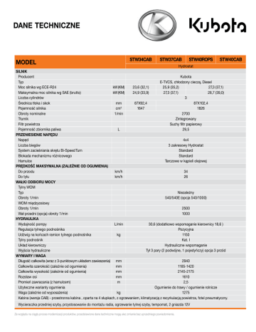 DANE TECHNICZNE Model STW34caB STW37caB STW40roPS STW40caB Hydrostat Silnik Producent Kubota Typ E-TVCS, chłodzony cieczą, Diesel Moc silnika wg ECE-R24 kW (KM) 23,6 (32,1) 25,9 (35,2) 27,3 (37,1) Maksymalna moc silnika wg SAE (brutto) kW (KM) 24,9 (33,9) 27,3 (37,1) 28,7 (39,0) Liczba cylindrów 3 Średnica tłoka i skok mm 87X92,4 87X102,4 Pojemność silnika cm3 1647 1826 Obroty nominalne 1/min 2700 Tłumik Zintegrowany Filtr powietrza Suchy filtr papierowy Pojemność zbiornika paliwa L 29,5 PrzenieSienie naPędU Napęd 4x4 Liczba biegów 3 zakresowy Hydrostat System zacieśniania skrętu Bi-Speed Turn Standard Blokada mechanizmu różnicowego Standard Hamulce Tarczowe w kąpieli olejowej Prędkość MakSyMalna (zależnie od ogUMienia) Do przodu km/h 34 Do tyłu km/h 26 Wałki odBiorU Mocy Tylny WOM Typ Niezależny Obroty 1/min 540/540E (opcja 540/1000) WOM międzyosiowy Obroty 1/min 2500 Wał przedni (opcja) obroty 1/min 1000 hydraUlika Wydajność pompy L/min 30,6 (dodatkowo wspomaganie kierownicy 18,6 ) Regulacja tylnego podnośnika Pozycyjna Udźwig na końcach ramion tylnego podnośnika kg 1150 Tylny podnośnik Kat. I Układ kierowniczy Hydrauliczne wspomaganie Wyjścia hydrauliczne Tył 3 pary (2 podwójne, 1 pojedyńczy) opcja 3 przód WyMiary i Waga Długość całkowita (wraz z 3-punktowym układem zawieszenia) mm 2940 Całkowita szerokość (zależnie od ogumienia) mm 1185-1420 Całkowita wysokość (zależnie od ogumienia) mm 2145-2175 Rozstaw osi mm 1610 Promień zawracania (z hamulcem) m 2,5 Użyteczne warianty ogumienia Ogumienie do trawy / ogumienie rolnicze Waga (zależnie od wyposażenia) kg 1275 Kabina (wersja CAB) - przestronna kabina , oparta na 4 słupkach, z ogrzewaniem, klimatyzacją z recyrkulacją powietrza, fotel pneumatyczny. Wycieraczka przedniej szyby, przystosowanie do montażu radia, ogrzewanie tylnej szyby, tempomat, 2 gniazda 12V Ze względu na ciągły proces modernizacji produktów, przedstawione dane techniczne mogą ulec zmianie bez uprzedniego powiadomienia.
