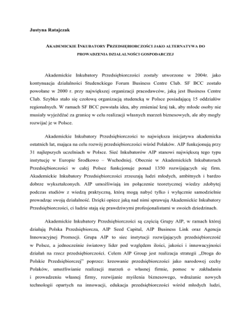Justyna Ratajczak AKADEMICKIE INKUBATORY PRZEDSIĘBIORCZOŚCI JAKO ALTERNATYWA DO PROWADZENIA DZIAŁALNOŚCI GOSPODARCZEJ Akademickie Inkubatory Przedsiębiorczości zostały utworzone w 2004r. jako kontynuacja działalności Studenckiego Forum Business Centre Club. SF BCC zostało powołane w 2000 r. przy największej organizacji pracodawców, jaką jest Business Centre Club. Szybko stało się czołową organizacją studencką w Polsce posiadającą 15 oddziałów regionalnych. W ramach SF BCC powstała idea, aby zmieniać kraj tak, aby młode osoby nie musiały wyjeżdżać za granicę w celu realizacji własnych marzeń biznesowych, ale aby mogły rozwijać je w Polsce. Akademickie Inkubatory Przedsiębiorczości to największa inicjatywa akademicka ostatnich lat, mająca na celu rozwój przedsiębiorczości wśród Polaków. AIP funkcjonują przy 31 najlepszych uczelniach w Polsce. Sieć Inkubatorów AIP stanowi największą tego typu instytucję w Europie Środkowo – Wschodniej. Obecnie w Akademickich Inkubatorach Przedsiębiorczości w całej Polsce funkcjonuje ponad 1350 rozwijających się firm. Akademickie Inkubatory Przedsiębiorczości zrzeszają ludzi młodych, ambitnych i bardzo dobrze wykształconych. AIP umożliwiają im połączenie teoretycznej wiedzy zdobytej podczas studiów z wiedzą praktyczną, którą mogą nabyć tylko i wyłącznie samodzielnie prowadząc swoją działalność. Dzięki opiece jaką nad nimi sprawują Akademickie Inkubatory Przedsiębiorczości, ci ludzie stają się prawdziwymi profesjonalistami w swoich dziedzinach. Akademickie Inkubatory Przedsiębiorczości są częścią Grupy AIP, w ramach której działają Polska Przedsiębiorcza, AIP Seed Capital, AIP Business Link oraz Agencja Innowacyjnej Promocji. Grupa AIP to siec instytucji rozwijających przedsiębiorczość w Polsce, a jednocześnie światowy lider pod względem ilości, jakości i innowacyjności działań na rzecz przedsiębiorczości. Celem AIP Group jest realizacja strategii „Droga do Polskie Przedsiębiorczej” poprzez: kreowanie przedsiębiorczości jako narodowej cechy Polaków, umożliwianie realizacji marzeń o własnej firmie, pomoc w zakładaniu i prowadzeniu własnej firmy, rozwijanie myślenia biznesowego, wdrażanie nowych technologii opartych na innowacji, edukacja przedsiębiorczości wśród młodych ludzi, promowanie postaw proinnowacyjnych i kreatywności, podnoszenie świadomości na temat mechanizmów rynkowych, odkrywanie i inwestowanie w firmy na miarę Skype’a. Akademickie Inkubatory Przedsiębiorczości ułatwiają start w biznesie poprzez zaoferowanie pełnego wachlarza usług związanych z prowadzeniem firmy. Na ten wachlarz składają się: a) Działalność na zasadzie pionu AIP- to podstawowy element wyróżniający sieć Akademickich Inkubatorów Przedsiębiorczości. Osoba zainteresowana prowadzeniem firmy, nie musi zakładać działalności gospodarczej zgodnie z ustawą o swobodzie działalności gospodarczej, lecz wykorzystuje osobowość prawną AIP. Formalnie działa w ramach struktury AIP, jednak w rzeczywistości realizuje swoje własne przedsięwzięcie. Pozwala to oszczędzić młodemu przedsiębiorcy czas związany z oczekiwaniem na założenie działalności gospodarczej oraz co najważniejsze, zwalania go z konieczności opłacania comiesięcznej składki do ZUS z tytułu prowadzenia działalności gospodarczej. Taka osoba nie figuruje w rejestrach jako osoba prowadząca jednoosobową działalność gospodarczą oraz nie zamyka sobie dróg możliwości korzystania z programów pomocowych na zakładanie działalności gospodarczej po usamodzielnieniu się- wyjściu z AIP. Takie funkcjonowanie zdecydowanie wpływa korzystanie na wiarygodność startującego przedsiębiorcy. W sprawach biznesowych występuje w jego imieniu Fundacja z siedzibą w stolicy państwa, kilkudziesięcioma oddziałami w całym kraju, obracająca kilkunastoma milionami złotych rocznie. Działanie pod osobowością prawną AIP to podstawowy element zapewniający bezpieczeństwo działania przedsiębiorcom – w sytuacji spornej (których w biznesie nie brakuje) osoba taka nie jest pozostawiona „sama sobie” i może liczyć na wsparcie Fundacji w jej rozwiązaniu. Formą prawną AIP jest fundacja, które wpisana jest także do rejestru przedsiębiorców, co umożliwia jej, a tym samym pojedynczym przedsiębiorcą realizującym swoje pomysły w ramach AIP, prowadzenie działalności gospodarczej. b) Prowadzenie księgowości przez biuro rachunkowe- prowadząc firmę w AIP prowadzenie księgowości spoczywa na AIP. Każda z firm indywidualnie jest comiesięcznie rozliczania z uzyskanego przychodu oraz odprowadzenia składek na ubezpieczenia społeczne w ramach wewnętrznej struktury, natomiast przed Urzędem Skarbowym czy ZUSem widnieje Fundacja AIP jako jeden podmiot. Fundacja AIP jest płatnikiem podatku VAT oraz zgodnie wymogiem ustawowym, prowadzi pełną księgowość. To samo rozciąga się na poszczególne firmy z AIP. Wszystkie dokumenty księgowe danej firmy są wystawiane i weryfikowane pod nadzorem kadry danego AIP, która raz w miesiącu przesyła je do Biura Rachunkowego w Warszawie w celu zaksięgowania. Jedyna praca beneficjenta w kwestii dokumentów, to ich dostarczenie w odpowiednim terminie do swojego AIP. To Biuro Rachunkowe dba o prawidłowe księgowanie, prawidłowość rozliczeń z Urzędem Skarbowym i ZUSem. Działanie obsługi księgowej skonstruowane jest tak, by osoba prowadząca działalność w AIP mogła nauczyć się procedur i zasad związanych z obrotem dokumentami księgowymi od podstaw po wszelkie zagadnienia niezbędne do prowadzenia wybranej przez niego działalności. c) Obsługa prawa firmy- osoba prowadząca firmę w AIP otrzymuje wsparcie Biura Prawnego, które jest nadzorowane i prowadzone przez jedną z najlepszych kancelarii prawnych w Polsce. Pomoc jaką beneficjent AIP może uzyskać to w szczególności pomoc w po