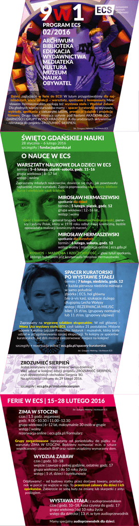 9w1 PROGRAM ECS 02/2016 ARCHIWUM BIBLIOTEKA EDUKACJA WYDAWNICTWA MEDIATEKA KULTURA MUZEUM NAUKA OBYWATEL Dzieci zaglądajcie w ferie do ECS! W lutym przygotowaliśmy dla najmłodszych wiele atrakcji – warsztaty, spotkanie z kosmonautą Mirosławem Hermaszewskim, czekają też wystawa stała i Wydział Zabaw. Dla głodnych wiedzy starszaków mamy – spacer kuratorski po wystawie, wykłady, spotkania z ciekawymi ludźmi, promocje książek i projekcję filmową. Druga część miesiąca upłynie pod hasłami AKADEMII SOLIDARNOŚCI i GRUPY WYSZEHRADZKIEJ. A dla urodzonych aktywistów – rekrutacja do projektu ZROZUMIEĆ SIERPIEŃ. fot. Grzegorz Mehring / Archiwum ECS ŚWIĘTO GDAŃSKIEJ NAUKI 28 stycznia – 6 lutego 2016 szczegóły | fundacjagdanska.pl O NAUCE W ECS WARSZTATY NAUKOWE DLA DZIECI W ECS termin | 5–6 lutego, piątek–sobota, godz. 11–16 grupa wiekowa | 8–17 lat wstęp | wolny Zapraszamy młodych naukowców, dowiecie się m.in., jak powstawały najbardziej znane wynalazki. Zajęcia poprowadzą edukatorzy, bibliotekarze i wielbiciele nauk ścisłych. MIROSŁAW HERMASZEWSKI spotkanie dla dzieci termin | 5 lutego, piątek, godz. 12 grupa wiekowa | 12–16 lat wstęp | wolny Gość z kosmosu! – generał brygady Mirosław Hermaszewski, pierwszy i jedyny Polak, który w 1978 roku odbył misję kosmiczną, będzie opowiadał o realizacji kosmicznych marzeń. MIROSŁAW HERMASZEWSKI spotkanie dla dorosłych termin | 6 lutego, sobota, godz. 12 wstęp wolny | rejestracja online | ecs.gda.pl KOSMOS – MARZENIA I RZECZYWISTOŚĆ – głosi tytuł spotkania, którego bohaterem jest kosmonauta Mirosław Hermaszewski. SPACER KURATORSKI PO WYSTAWIE STAŁEJ termin | 7 lutego, niedziela, godz. 12 + każda pierwsza niedziela miesiąca w samo południe zbiórka | ECS, hol główny (vis-à-vis kas), szukajcie dużego długopisu Lecha Wałęsy wstęp | REZERWACJA MIEJSC bilet: 15 zł/os. (grupowy normalny) lub 11 zł/os. (grupowy ulgowy) Zapraszamy na wyprawę szlakiem eksponatów. W roli głównej – Mona Lisa wystawy stałej ECS, czyli tablice 21 postulatów. Historie opowie Karolina Lejczak-Pastuszka, historyk i muzealnik, która brała udział w przygotowywaniu naszej ekspozycji. To kolejny ze spacerów kuratorskich. Już dziś możesz zarezerwować miejsce na kolejne! szczegóły + rezerwacja online | ecs.gda.pl/spacery-kuratorskie fot. Grzegorz Mehring / Archiwum ECS ZROZUMIEĆ SIERPIEŃ Jesteś kreatywny i chcesz zmienić swoją dzielnicę? Weź udział w kolejnej edycji projektu ZROZUMIEĆ SIERPIEŃ, czyli obywatelskich obchodów Sierpnia ’80. Na zgłoszenia czekamy do 29 lutego 2016. szczegóły | ecs.gda.pl/zrozumiecsierpien FERIE W ECS | 15–28 LUTEGO 2016 ZIMA W STOCZNI fot. Grzegorz Mehring / Archiwum ECS czas | 1,5 godz. zegarowej godz. 9.00–10.30 i 11.00–12.30 grupa wiekowa | 6–12 lat, maksymalnie 30 osób w grupie wstęp | wolny rezerwacja online | ecs.gda.pl/Formularz Grupy zorganizowane zapraszamy od poniedziałku do piątku na warsztaty ZIMA W STOCZNI. Będziemy rozmawiać m.in. o sztuce współczesnej i zasadach BHP oraz razem urządzimy wymarzony dom. WYDZIAŁ ZABAW czas | godz. 10–18 wejście | zawsze o pełnej godzinie, ostatnie: godz. 17 grupa wiekowa | do 10 roku życia wstęp | 5 zł, dzieci i opiekunowie Odpływamy! – od budowy statku przez dostawę towaru, przeładunek w porcie po wyjście w rejs. To przestrzeń zabawy dla dzieci i ich opiekunów. Zabierzcie ze sobą buty na zmianę lub skarpetki z antypoślizgiem. WYSTAWA STAŁA | z audioprzewodnikiem czas | godz. 10–18, kasa czynna do godz. 17 grupa wiekowa | od 10 roku życia wstęp dla dziecka | 13 zł, w tym audioprzewodnik Mamy specjalny audioprzewodnik dla dzieci. KOŚCIÓŁ NA ŁAMACH PARYSKIEJ KULTURY 1946–2000 | promocja książki termin | 16 lutego, wtorek, godz. 18 miejsce | ECS, biblioteka wstęp | wolny To wybór tekstów na temat Kościoła, jakie przez pół wieku ukazywały się na łamach czasopisma założonego przez Jerzego Giedroycia. Wśród autorów m.in.: Leszek Kołakowski, Czesław Miłosz i kard. Stefan Wyszyński. O książce opowiedzą: o. Tomasz Dostatni OP – który dokonał wyboru tekstów, oraz Aleksander Hall, ks. Krzysztof Niedałtowski, Zbigniew Mikołejko i o. Ludwik Wiśniewski OP. organizatorzy | Instytut Książki, Europejskie Centrum Solidarności, Instytut Literacki w Paryżu zapowiadamy sprzedaż antologii w cenie promocyjnej (30 zł) i innych wydawnictw Instytutu Książki − płatność tylko gotówką SPOTKANIE AUTORSKIE Z PAWŁEM KOWALEM termin | 17 lutego, środa, godz. 18 miejsce | ECS, biblioteka wstęp | wolny Bohaterami wieczoru będą: książka „Między Majdanem a Smoleńskiem” oraz jej autor – Paweł Kowal, jeden z najlepszych polskich ekspertów od spraw wschodnich, doktor politologii, historyk i polityk. Spotkanie w ramach projektu Ambasador Nowej Europy. SPOTKANIA Z NAUKĄ | wykłady termin | 18 lutego, czwartek, godz. 17.30 miejsce | ECS, biblioteka wstęp | wolny Inaugurujemy cykl SPOTKANIA Z NAUKĄ, w którym będziemy prezentować młodych naukowców. Pierwszy wykład: „Chcemy być sobą, chcemy bić ZOMO”, odpowiedzi na pytanie: czy rock obalił komunizm? – poszuka Marcin Mindykowski, dziennikarz i krytyk filmowy. Drugi wykład: o „Polskiej prasie gospodarczej w latach 1946–1956”– wygłosi Bartosz Poświata, historyk z Uniwersytetu Gdańskiego. ...FORGOTTEN BY WORLD wystawa fotografii termin | do 21 lutego, godz. 10–18 miejsce | ECS, sala wystaw czasowych wstęp | wolny Wystawa fotografii opowiadających o losie dzieci, ofiar wojny na Ukrainie. organizatorzy | Lambre Foundation, Stowarzyszenie Expatria est fot. Agata Grzybowska ast EUROPA termin | 25 lutego, czwartek, godz. 18 miejsce | ECS, sala wystaw czasowych wstęp | wolny O stosunkach polsko-rosyjskich, obecnej sytuacji w Rosji, konflikcie w Donbasie, ale i pracy korespondenta zagranicznego opowie – Wacław Radziwinowicz, były korespondent „Gaz