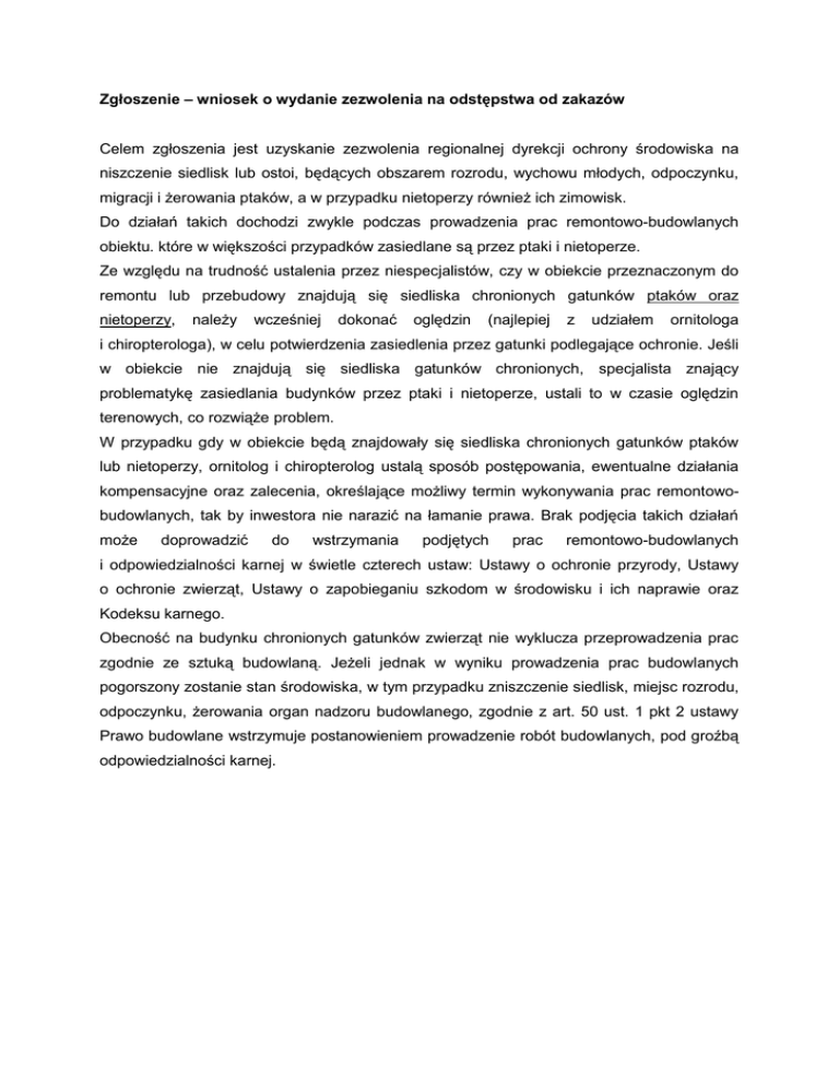 Zgłoszenie – wniosek o wydanie zezwolenia na odstępstwa od zakazów Celem zgłoszenia jest uzyskanie zezwolenia regionalnej dyrekcji ochrony środowiska na niszczenie siedlisk lub ostoi, będących obszarem rozrodu, wychowu młodych, odpoczynku, migracji i żerowania ptaków, a w przypadku nietoperzy również ich zimowisk. Do działań takich dochodzi zwykle podczas prowadzenia prac remontowo-budowlanych obiektu. które w większości przypadków zasiedlane są przez ptaki i nietoperze. Ze względu na trudność ustalenia przez niespecjalistów, czy w obiekcie przeznaczonym do remontu lub przebudowy znajdują się siedliska chronionych gatunków ptaków oraz nietoperzy, należy wcześniej dokonać oględzin (najlepiej z udziałem ornitologa i chiropterologa), w celu potwierdzenia zasiedlenia przez gatunki podlegające ochronie. Jeśli w obiekcie nie znajdują się siedliska gatunków chronionych, specjalista znający problematykę zasiedlania budynków przez ptaki i nietoperze, ustali to w czasie oględzin terenowych, co rozwiąże problem. W przypadku gdy w obiekcie będą znajdowały się siedliska chronionych gatunków ptaków lub nietoperzy, ornitolog i chiropterolog ustalą sposób postępowania, ewentualne działania kompensacyjne oraz zalecenia, określające możliwy termin wykonywania prac remontowobudowlanych, tak by inwestora nie narazić na łamanie prawa. Brak podjęcia takich działań może doprowadzić do wstrzymania podjętych prac remontowo-budowlanych i odpowiedzialności karnej w świetle czterech ustaw: Ustawy o ochronie przyrody, Ustawy o ochronie zwierząt, Ustawy o zapobieganiu szkodom w środowisku i ich naprawie oraz Kodeksu karnego. Obecność na budynku chronionych gatunków zwierząt nie wyklucza przeprowadzenia prac zgodnie ze sztuką budowlaną. Jeżeli jednak w wyniku prowadzenia prac budowlanych pogorszony zostanie stan środowiska, w tym przypadku zniszczenie siedlisk, miejsc rozrodu, odpoczynku, żerowania organ nadzoru budowlanego, zgodnie z art. 50 ust. 1 pkt 2 ustawy Prawo budowlane wstrzymuje postanowieniem prowadzenie robót budowlanych, pod groźbą odpowiedzialności karnej. Wnioskodawca: ................................................ miejsce i data Regionalna Dyrekcja Ochrony Środowiska w Katowicach ul. Dąbrowskiego 22 40-032 Katowice Wniosek o wydanie zezwolenia na podstawie art. 56 ust. 2 w stosunku do gatunków zwierząt objętych ochroną ścisłą i częściową, na odstępstwa od zakazów wymienionych w art. 52 ust. 1 ustawy z 16 kwietnia 2004r. o ochronie przyrody 1) imię, nazwisko i adres albo nazwę i siedzibę wnioskodawcy (jeżeli jako pełnomocnik to kopia odpowiedniego dokumentu, który to potwierdza i opłata skarbowa za pełnomocnictwo 17zł) ................................................................................................................................................................... ................................................................................................................................................................... ................................................................................................................................................................... ................................................................................................................................................................... ................................................................................................................................................................... 2) cel wykonania wnioskowanych czynności (remont budynku, dachu itp. oraz opisać krótko gdzie znajdują się siedliska na podstawie opinii ornitologicznej i chiropterologicznej) ................................................................................................................................................................... ................................................................................................................................................................... ................................................................................................................................................................... ................................................................................................................................................................... ................................................................................................................................................................... ................................................................................................................................................................... ................................................................................................................................................................... ................................................................................................................................................................... ................................................................................................................................................................... .................................................................................................................................................................. 3) opis czynności, na którą może być wydane zezwolenie (należy wpisać jedną z czynności wymienionych w art. 52 ust. 1 oraz krótko opisać w jaki sposób będzie odbywało sie niszczenie siedlisk) ................................................................................................................................................................... ................................................................................................................................................................... ...................................................................