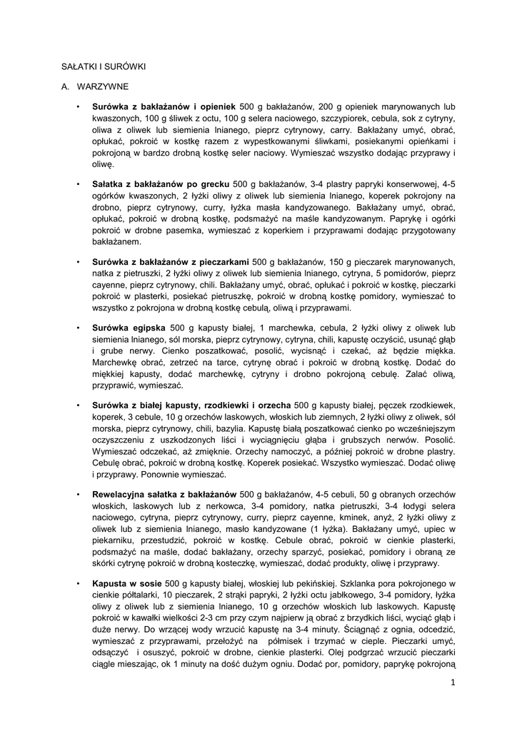 SAŁATKI I SURÓWKI A. WARZYWNE • Surówka z bakłażanów i opieniek 500 g bakłażanów, 200 g opieniek marynowanych lub kwaszonych, 100 g śliwek z octu, 100 g selera naciowego, szczypiorek, cebula, sok z cytryny, oliwa z oliwek lub siemienia lnianego, pieprz cytrynowy, carry. Bakłażany umyć, obrać, opłukać, pokroić w kostkę razem z wypestkowanymi śliwkami, posiekanymi opieńkami i pokrojoną w bardzo drobną kostkę seler naciowy. Wymieszać wszystko dodając przyprawy i oliwę. • Sałatka z bakłażanów po grecku 500 g bakłażanów, 3-4 plastry papryki konserwowej, 4-5 ogórków kwaszonych, 2 łyżki oliwy z oliwek lub siemienia lnianego, koperek pokrojony na drobno, pieprz cytrynowy, curry, łyżka masła kandyzowanego. Bakłażany umyć, obrać, opłukać, pokroić w drobną kostkę, podsmażyć na maśle kandyzowanym. Paprykę i ogórki pokroić w drobne pasemka, wymieszać z koperkiem i przyprawami dodając przygotowany bakłażanem. • Surówka z bakłażanów z pieczarkami 500 g bakłażanów, 150 g pieczarek marynowanych, natka z pietruszki, 2 łyżki oliwy z oliwek lub siemienia lnianego, cytryna, 5 pomidorów, pieprz cayenne, pieprz cytrynowy, chili. Bakłażany umyć, obrać, opłukać i pokroić w kostkę, pieczarki pokroić w plasterki, posiekać pietruszkę, pokroić w drobną kostkę pomidory, wymieszać to wszystko z pokrojona w drobną kostkę cebulą, oliwą i przyprawami. • Surówka egipska 500 g kapusty białej, 1 marchewka, cebula, 2 łyżki oliwy z oliwek lub siemienia lnianego, sól morska, pieprz cytrynowy, cytryna, chili, kapustę oczyścić, usunąć głąb i grube nerwy. Cienko poszatkować, posolić, wycisnąć i czekać, aż będzie miękka. Marchewkę obrać, zetrzeć na tarce, cytrynę obrać i pokroić w drobną kostkę. Dodać do miękkiej kapusty, dodać marchewkę, cytryny i drobno pokrojoną cebulę. Zalać oliwą, przyprawić, wymieszać. • Surówka z białej kapusty, rzodkiewki i orzecha 500 g kapusty białej, pęczek rzodkiewek, koperek, 3 cebule, 10 g orzechów laskowych, włoskich lub ziemnych, 2 łyżki oliwy z oliwek, sól morska, pieprz cytrynowy, chili, bazylia. Kapustę białą poszatkować cienko po wcześniejszym oczyszczeniu z uszkodzonych liści i wyciągnięciu głąba i grubszych nerwów. Posolić. Wymieszać odczekać, aż zmięknie. Orzechy namoczyć, a później pokroić w drobne plastry. Cebulę obrać, pokroić w drobną kostkę. Koperek posiekać. Wszystko wymieszać. Dodać oliwę i przyprawy. Ponownie wymieszać. • Rewelacyjna sałatka z bakłażanów 500 g bakłażanów, 4-5 cebuli, 50 g obranych orzechów włoskich, laskowych lub z nerkowca, 3-4 pomidory, natka pietruszki, 3-4 łodygi selera naciowego, cytryna, pieprz cytrynowy, curry, pieprz cayenne, kminek, anyż, 2 łyżki oliwy z oliwek lub z siemienia lnianego, masło kandyzowane (1 łyżka). Bakłażany umyć, upiec w piekarniku, przestudzić, pokroić w kostkę. Cebule obrać, pokroić w cienkie plasterki, podsmażyć na maśle, dodać bakłażany, orzechy sparzyć, posiekać, pomidory i obraną ze skórki cytrynę pokroić w drobną kosteczkę, wymieszać, dodać produkty, oliwę i przyprawy. • Kapusta w sosie 500 g kapusty białej, włoskiej lub pekińskiej. Szklanka pora pokrojonego w cienkie półtalarki, 10 pieczarek, 2 strąki papryki, 2 łyżki octu jabłkowego, 3-4 pomidory, łyżka oliwy z oliwek lub z siemienia lnianego, 10 g orzechów włoskich lub laskowych. Kapustę pokroić w kawałki wielkości 2-3 cm przy czym najpierw ją obrać z brzydkich liści, wyciąć głąb i duże nerwy. Do wrzącej wody wrzucić kapustę na 3-4 minuty. Ściągnąć z ognia, odcedzić, wymieszać z przyprawami, przełożyć na półmisek i trzymać w cieple. Pieczarki umyć, odsączyć i osuszyć, pokroić w drobne, cienkie plasterki. Olej podgrzać wrzucić pieczarki ciągle mieszając, ok 1 minuty na dość dużym ogniu. Dodać por, pomidory, paprykę pokrojoną 1 w cienkie plasterki bardzo drobne. Dodać olej, przyprawy, sos, ocet, wymoczone i pokrojone na bardzo drobno orzechy, przyprawy. Wymieszać, dodać wody 5-6 łyżek i 3 minuty trzymać na ogniu. Polać tym sosem kapustę. • Biała kapusta po pekińsku 500 g kapusty białej lub pekińskiej, 3 zmiażdżone ząbki czosnku, 1 łyżeczka imbiru, 2 łyżeczki sosu sojowego, 5-6 łyżek wywaru z kapusty lub łyżeczkę masła kandyzowanego, 3 cebule, sól morska, kminek, majeranek, 3 grzybki suszone. Kapustę obrać, obmyć poszatkować, wrzucić do wody, obgotować, odlać wodę, do pełna zalać woda jeszcze raz i ugotować, aż będzie miękka. Wyciągnąć kapustę. Na patelni rozpuścić masło i podsmażyć cebulkę obraną i pokrojoną w bardzo cienkie półplasterki. Dodać kapustę, czosnek, imbir, sos sojowy i przyprawy i wywar z kapusty lub warzyw. Wymieszać podgrzewając na małym ogniu. • Surówka z białej kapusty, papryki i pomidora 500 g kapusty białej, 2 strąki papryki, 3 pomidory, szczypiorek, 2 łyżki oliwy z oliwek, 1 łyżka miodu, pieprz cytrynowy, pieprz biały, chili. Kapustę oczyścić, opłukać, poszatkować cienko usuwając grube nerwy i głąb. Posolić. Odczekać, aż zmięknie, paprykę umyć, oczyścić pokroić w cienkie, małe plasterki. Pomidory umyć, pokroić w kostkę, szczypiorek poszatkować. Wszystko wymieszać dodając oliwę i przyprawy. • Z białej kapusty i ogórków 500g białej kapusty, 500g świeżych ogórków, 3 łyżki koperku, 2 łyżki oliwy z oliwek, sól morska, pieprz cytrynowy, pieprz cayenne. Kapustę obrać tak, aby była czysta, wyciąć głąb i grube nerwy poszatkować, posolić, wymieszać i odczekać, aby była miękka. Ogórki obrać i pokroić w drobną kostkę. Ogórki i kapustę wymieszać dodać koper, olej, wymieszać i przyprawić. • Z białej kapusty i pora 300 g białej kapusty, 300 g pora, 250 g marchewki, 3 łyżki oliwy z oliwek, sól morska, pieprz cytrynowy. Kapustę obrać ze starych i zgnitych części, w