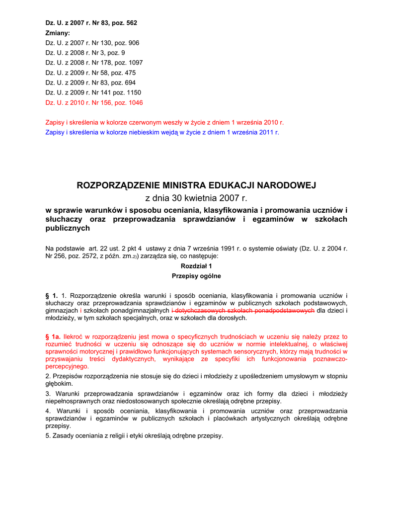 Dz. U. z 2007 r. Nr 83, poz. 562 Zmiany: Dz. U. z 2007 r. Nr 130, poz. 906 Dz. U. z 2008 r. Nr 3, poz. 9 Dz. U. z 2008 r. Nr 178, poz. 1097 Dz. U. z 2009 r. Nr 58, poz. 475 Dz. U. z 2009 r. Nr 83, poz. 694 Dz. U. z 2009 r. Nr 141 poz. 1150 Dz. U. z 2010 r. Nr 156, poz. 1046 Zapisy i skreślenia w kolorze czerwonym weszły w życie z dniem 1 września 2010 r. Zapisy i skreślenia w kolorze niebieskim wejdą w życie z dniem 1 września 2011 r. ROZPORZĄDZENIE MINISTRA EDUKACJI NARODOWEJ z dnia 30 kwietnia 2007 r. w sprawie warunków i sposobu oceniania, klasyfikowania i promowania uczniów i słuchaczy oraz przeprowadzania sprawdzianów i egzaminów w szkołach publicznych Na podstawie art. 22 ust. 2 pkt 4 ustawy z dnia 7 września 1991 r. o systemie oświaty (Dz. U. z 2004 r. Nr 256, poz. 2572, z późn. zm.2)) zarządza się, co następuje: Rozdział 1 Przepisy ogólne § 1. 1. Rozporządzenie określa warunki i sposób oceniania, klasyfikowania i promowania uczniów i słuchaczy oraz przeprowadzania sprawdzianów i egzaminów w publicznych szkołach podstawowych, gimnazjach i szkołach ponadgimnazjalnych i dotychczasowych szkołach ponadpodstawowych dla dzieci i młodzieży, w tym szkołach specjalnych, oraz w szkołach dla dorosłych. § 1a. Ilekroć w rozporządzeniu jest mowa o specyficznych trudnościach w uczeniu się należy przez to rozumieć trudności w uczeniu się odnoszące się do uczniów w normie intelektualnej, o właściwej sprawności motorycznej i prawidłowo funkcjonujących systemach sensorycznych, którzy mają trudności w przyswajaniu treści dydaktycznych, wynikające ze specyfiki ich funkcjonowania poznawczopercepcyjnego. 2. Przepisów rozporządzenia nie stosuje się do dzieci i młodzieży z upośledzeniem umysłowym w stopniu głębokim. 3. Warunki przeprowadzania sprawdzianów i egzaminów oraz ich formy dla dzieci i młodzieży niepełnosprawnych oraz niedostosowanych społecznie określają odrębne przepisy. 4. Warunki i sposób oceniania, klasyfikowania i promowania uczniów oraz przeprowadzania sprawdzianów i egzaminów w publicznych szkołach i placówkach artystycznych określają odrębne przepisy. 5. Zasady oceniania z religii i etyki określają odrębne przepisy. Rozdział 2 Ocenianie, klasyfikowanie i promowanie uczniów w szkołach dla dzieci i młodzieży § 2. 1. Ocenianiu podlegają: 1) osiągnięcia edukacyjne ucznia; 2) zachowanie ucznia. 2. Ocenianie osiągnięć edukacyjnych ucznia polega na rozpoznawaniu przez nauczycieli poziomu i postępów w opanowaniu przez ucznia wiadomości i umiejętności w stosunku do wymagań edukacyjnych wynikających z podstawy programowej, określonej w odrębnych przepisach, i realizowanych w szkole programów nauczania uwzględniających tę podstawę. 3. Ocenianie zachowania ucznia polega na rozpoznawaniu przez wychowawcę klasy, nauczycieli oraz uczniów danej klasy stopnia respektowania przez ucznia zasad współżycia społecznego i norm etycznych oraz obowiązków ucznia określonych w statucie szkoły. § 3. 1. Ocenianie osiągnięć edukacyjnych i zachowania ucznia odbywa się w ramach oceniania wewnątrzszkolnego. 2. Ocenianie wewnątrzszkolne ma na celu: 1) informowanie ucznia o poziomie jego osiągnięć edukacyjnych i jego zachowaniu oraz o postępach w tym zakresie; 2) udzielanie uczniowi pomocy w samodzielnym planowaniu swojego rozwoju; 3) motywowanie ucznia do dalszych postępów w nauce i zachowaniu; 4) dostarczenie rodzicom (prawnym opiekunom) i nauczycielom informacji o postępach, trudnościach w nauce, zachowaniu oraz specjalnych uzdolnieniach ucznia; 5) umożliwienie nauczycielom doskonalenia organizacji i metod pracy dydaktyczno-wychowawczej. 3. Ocenianie wewnątrzszkolne obejmuje: 1) formułowanie przez nauczycieli wymagań edukacyjnych niezbędnych do uzyskania poszczególnych śródrocznych i rocznych (semestralnych) ocen klasyfikacyjnych z obowiązkowych i dodatkowych zajęć edukacyjnych; 2) ustalanie kryteriów oceniania zachowania; 3) ocenianie bieżące i ustalanie śródrocznych ocen klasyfikacyjnych z obowiązkowych i dodatkowych zajęć edukacyjnych oraz śródrocznej oceny klasyfikacyjnej zachowania, według skali i w formach przyjętych w danej szkole; 4) przeprowadzanie egzaminów klasyfikacyjnych zgodnie z § 17 ust. 7-14a; 5) ustalanie rocznych (semestralnych) ocen klasyfikacyjnych z obowiązkowych i dodatkowych zajęć edukacyjnych oraz rocznej oceny klasyfikacyjnej zachowania, według skali, o której mowa w § 13 ust. 2 i § 15 ust. 3; 6) ustalanie warunków i trybu uzyskania wyższych niż przewidywane rocznych (semestralnych) ocen klasyfikacyjnych z obowiązkowych i dodatkowych zajęć edukacyjnych oraz rocznej oceny klasyfikacyjnej zachowania; 7) ustalanie warunków i sposobu przekazywania rodzicom (prawnym opiekunom) informacji o postępach i trudnościach ucznia w nauce. 4. Szczegółowe warunki i sposób oceniania wewnątrzszkolnego określa statut szkoły, z uwzględnieniem przepisów rozporządzenia. § 4. 1. Nauczyciele na początku każdego roku szkolnego informują uczniów oraz ich rodziców (prawnych opiekunów) o: 1) wymaganiach edukacyjnych niezbędnych do uzyskania poszczególnych śródrocznych i rocznych (semestralnych) ocen klasyfikacyjnych z obowiązkowych i dodatkowych zajęć edukacyjnych, wynikających z realizowanego przez siebie programu nauczania; 2) sposobach sprawdzania osiągnięć edukacyjnych uczniów; 3) warunkach i trybie uzyskania wyższej niż przewidywana rocznej (semestralnej) oceny klasyfikacyjnej z obowiązkowych i dodatkowych zajęć edukacyjnych. 2 2. Wychowawca klasy na początku każdego roku szkolnego informuje uczniów oraz ich rodziców (prawnych opiekunów) o: 1) warunkach i sposobie oraz kryteriach oceniania zachowania; 2) warunkach i trybie uzyskania wyższej niż przewidywana rocznej oceny klasyfikacyjnej zachowania; 3) skutkach ustalenia uczniowi nagannej rocznej oceny klasyfikacyjnej zachowania. § 5. 1. Oceny s