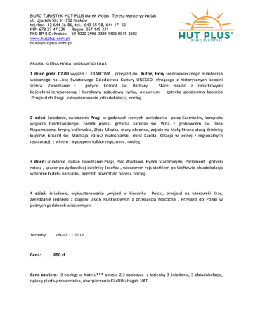 BIURO TURYSTYKI HUT-PLUS Marek Wolak, Teresa Manterys-Wolak ul. Ujastek 5b, 31-752 Kraków tel/fax: 12 644-36-86, tel. 643-55-98, 644-17- 52 NIP: 678 27 47 229 Regon: 357 145 331 PKO BP II O/Kraków 59 1020 2906 0000 1102 0015 3502 www.hutplus.com.pl [email protected] PRAGA KUTNA HORA MORAWSKI KRAS 1 dzień godz: 07.00 wyjazd z KRAKOWA , przejazd do Kutnej Hory średniowiecznego miasteczka wpisanego na Listę Swiatowego Dziedzictwa Kultury UNESKO, słynącego z historycznych kopalni srebra. Zwiedzanie : gotycki kościół św. Barbary , Stare miasto z zabytkowymi kościołami,renesansową i barokową zabudową rynku, ossuarium – gotycka podziemna kostnica .Przejazd do Pragi , zakwaterowanie ,obiadokolacja, nocleg. 2 dzień: śniadanie, zwiedzanie Pragi w godzinach rannych- zwiedzanie : pałac Czerninów, kompleks wzgórza hradczańskiego- zamek praski, gotycka katedra św. Wita z grobowcem św. Jana Nepomucena, krypty królewskie, Złota Uliczka, mury obronne, zejście na Małą Stranę starą dzielnicę kupców, kościół św. Mikołaja, ratusz małostrański, most Karola. Kolacja w jednej z regionalnych restauracji, z winem i występem folklorystycznym , nocleg 3 dzień: śniadanie, dalsze zwiedzanie Pragi, Plac Wacława, Rynek Staromiejski, Parlament , gotycki ratusz , spacer po żydowskiej dzielnicy Josefov , wieczorem rejs statkiem po Wełtawie obiadokolacja w formie bufetu na statku, aperitif, powrót do hotelu, nocleg. 4 dzień: śniadanie, wykwaterowanie ,wyjazd w kierunku Polski, przejazd na Morawski Kras, zwiedzanie jednego z ciągów jaskiń Punkwiowych z przepaścią Macocha . Przyjazd do Polski w póżnych godzinach wieczornych. Terminy: Cena: 09-12.11.2017 690 zł Cena zawiera: 3 noclegi w hotelu*** pokoje 2,3 osobowe z łazienką 3 śniadania, 3 obiadokolacje, opiekę pilota-przewodnika, ubezpieczenie KL+NW+bagaż, VAT. BIURO TURYSTYKI HUT-PLUS Marek Wolak, Teresa Manterys-Wolak ul. Ujastek 5b, 31-752 Kraków tel/fax: 12 644-36-86, tel. 643-55-98, 644-17- 52 NIP: 678 27 47 229 Regon: 357 145 331 PKO BP II O/Kraków 59 1020 2906 0000 1102 0015 3502 www.hutplus.com.pl [email protected] w/w program jest ramowy i moze ulec zmianie kolejność zwiedzania w zależności od warunków atmosferycznych i godzin otwarcia zwiedzanych obiektów . Na wstępy oraz rejs statkiem proponujemy kwotę ok. 1400 Czk