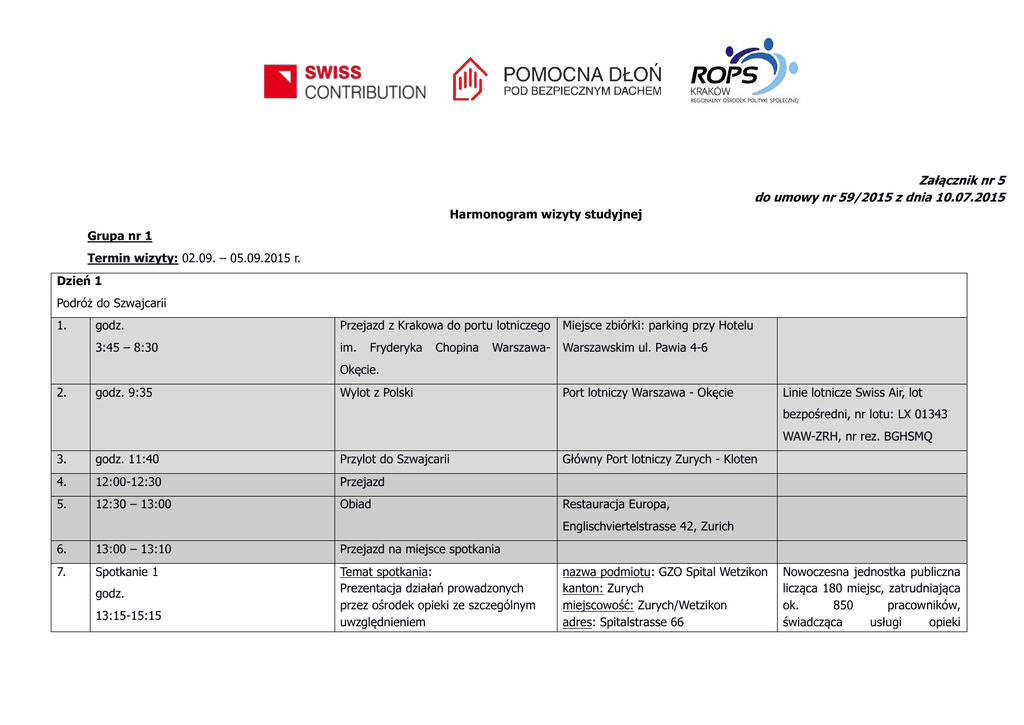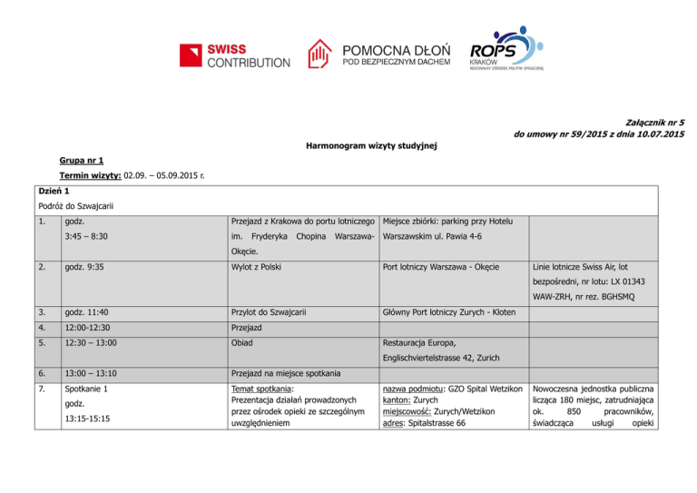 Załącznik nr 5 do umowy nr 59/2015 z dnia 10.07.2015 Harmonogram wizyty studyjnej Grupa nr 1 Termin wizyty: 02.09. – 05.09.2015 r. Dzień 1 Podróż do Szwajcarii 1. godz. Przejazd z Krakowa do portu lotniczego 3:45 – 8:30 im. Fryderyka Chopina Miejsce zbiórki: parking przy Hotelu Warszawa- Warszawskim ul. Pawia 4-6 Okęcie. 2. godz. 9:35 Wylot z Polski Port lotniczy Warszawa - Okęcie Linie lotnicze Swiss Air, lot bezpośredni, nr lotu: LX 01343 WAW-ZRH, nr rez. BGHSMQ 3. godz. 11:40 Przylot do Szwajcarii 4. 12:00-12:30 Przejazd 5. 12:30 – 13:00 Obiad Główny Port lotniczy Zurych - Kloten Restauracja Europa, Englischviertelstrasse 42, Zurich 6. 13:00 – 13:10 Przejazd na miejsce spotkania 7. Spotkanie 1 Temat spotkania: Prezentacja działań prowadzonych przez ośrodek opieki ze szczególnym uwzględnieniem godz. 13:15-15:15 nazwa podmiotu: GZO Spital Wetzikon kanton: Zurych miejscowość: Zurych/Wetzikon adres: Spitalstrasse 66 Nowoczesna jednostka publiczna licząca 180 miejsc, zatrudniająca ok. 850 pracowników, świadcząca usługi opieki zagadnień związanych ze świadczeniem opieki pielęgniarskiej, w tym w formie niestacjonarnej. Zakres spotkania: wizyta i obserwacja pracy. Czas trwania: 120 min. 8620 Wetzikon zdrowotnej. Przyszpitalny wydział opieki paliatywnej świadczy mobilne usługi opieki nowatorskie podejście zapełniające lukę pomiędzy usługami ambulatoryjnymi a stacjonarnymi. Szpital jest także znaczącą jednostką szkoleniową. Placówka mocno zakorzeniona w społeczności lokalnej oferuje całodobową kompleksową opiekę. Należy do Gesundheitsnetz - koalicji 25 organizacji specjalizujących się w opiece zdrowotnej, w tym długotrwałej opiece zdrowotnej i opiece społecznej. prelegent: Andreas Weber 8. 15:15 – 15:30 Przejazd na miejsce drugiego spotkania 9. Spotkanie 2 godz. 16:00-18:00 Temat spotkania: Prezentacja działań prowadzonych przez ośrodek opieki ze szczególnym uwzględnieniem zagadnień związanych ze świadczeniem opieki pielęgniarskiej na nazwa podmiotu: Pflegezentrum Entlisberg kanton: Zurych miejscowość: Zurych adres: Paradiesstrasse 45 Ośrodek opieki Entlisberg świadczący różnorodne usługi opiekuńcze i terapeutyczne, oferujący miejsce zamieszkania dla klientów opieki 10. godz. 18:00 - 18:30 rzecz mieszkańców. Zakres spotkania: wizyta i obserwacja pracy Czas trwania: 120 min. 8038 Zürich Przejazd do hotelu Hotel Kronenhof Wehntalerstrasse 551, 8046 Zürich, Szwajcaria 11. godz. 18:30 – 19:00 Zakwaterowanie jw 12. godz. 19:00 – 20:00 Kolacja Kolacja w hotelu w formie bufetu 13. godz. 20:00 – 21:00 Spotkanie organizacyjne Hotelowa sala konferencyjna długoterminowej (333 miejsca), opiekę medyczną przy jednoczesnym zachowaniu niezależności mieszkańców domu opieki. Oferuje fizyczną terapię zajęciową i inne formy aktywizacji. Ponadto w Entlisberg działa grupa opieki LieniHof, której celem jest opieka nad grupą młodszych osób dorosłych. Ośrodek opieki Entlisberg należy do Gesundheitsnetz - koalicji 25 organizacji specjalizujących się w opiece zdrowotnej, w tym długotrwałej opiece zdrowotnej i opiece społecznej. Prelegent: Barbara ArnoldReichlin Hotel 3* Dzień 2 Lp. Godz. Wydarzenie Miejsce Informacje o podmiocie, imię i nazwisko prelegenta 1. godz. 8:00 – 9:00 Śniadanie W hotelu w formie bufetu 2. godz. 9:30 – 10:00 Przejazd 3. Spotkanie 3 Temat spotkania: Prezentacja działań nazwa podmiotu: IV Betriebe des Wydział spraw społecznych godz. wydziału i zapoznanie z problematyką Kantonalen Sozialamts kantonu Zurych prowadzący 10:00 – 12:00 wsparcia osób wymagających pomocy kanton: Zurych m.in. usługi doradcze osobom ze szczególnym uwzględnieniem miejscowość: Zurych starszym w zakresie m.in. opieki zagadnień związanych z opieką adres: Schaffhauserstrasse 78 pielęgniarskiej. Beratungsstelle pielęgniarską. Wohnen im Alter – Centrum Zakres spotkania: wizyta i obserwacja doradcze opieki pielęgniarskiej pracy. prelegent: Urs-Christoph Dieterle Czas trwania: 120 min. 4. godz. 12:00 – 12:30 Przejazd 5. godz. 12:40 – 13:40 Obiad Restauracja Europa, Englischviertelstrasse 42, Zurich 6. godz. 13:40-14:00 Przejazd 7. Spotkanie 4 Temat spotkania: Zapoznanie z nazwa podmiotu: Stiftung Altried Fundacja Altried oferuje szeroki godz. działalnością oraz ofertą programową kanton: Zurych zakres pomocy wg motto: godz. 14:00 – 16:00 podmiotu ze szczególnym miejscowość: Zurych „wszystkie obszary życia dla uwzględnieniem zagadnień związanych adres: Ueberlandstrasse 424, 8051 ludzi z upośledzeniami”. z opieką pielęgniarską Zürich Fundacja wspomaga ludzi Zakres spotkania: uczestnictwo w dorosłych, upośledzonych spotkaniu, obserwacja działań umysłowo i fizycznie w Czas trwania: 120 min. prowadzeniu życia w społeczeństwie na zasadzie normalności z uwzględnieniem ich indywidualnych możliwości. prelegent: Erhard Humm 8. godz. 16:00 – 16:45 Przejazd 9. godz. 19:00 – 20:00 Kolacja 10. godz. 20:00 – 21:00 Podsumowanie W hotelu w formie bufetu dnia - wymiana Sala konferencyjna hotelu spostrzeżeń, omówienie planu na dzień następny. Dzień 3 L.p Godz. Wydarzenie 1. godz. 8:00 – 8:40 Śniadanie 2. godz. 8:45 – 10:00 Przejazd Miejsce W hotelu w formie bufetu Informacje o podmiocie 3. Spotkanie 5 Temat spotkania: nazwa podmiotu: Fundacja Schmelzi Fundacja zajmująca się godz. Prezentacja kanton: Solura kompleksowo osobami 10:00- 12:00 Fundacji miejscowość: Grenchen niepełnosprawnymi umysłowo. uwzględnieniem zagadnień związanych adres: Schmelzistr. 21, 2540 Schmelzi prelegent: Lukas Baeumle z opieką pielęgniarską Centrum Opieki Sunnepark prowadzonych ze działań szczególnym Zakres spotkania: wizyta i obserwacja pracy. Czas trwania: 120 min. 4. godz. 12:00-12:05 Przejście na obiad 5. godz. 12:10 – 12:45 Obiad Obiad w Fundacji Schmelzi, Schmelzistr. 21, 2540 Schmelzi 6. godz. 12:45 – 14:00 Przejazd 7. Spotkanie 6 Temat spotkania: 