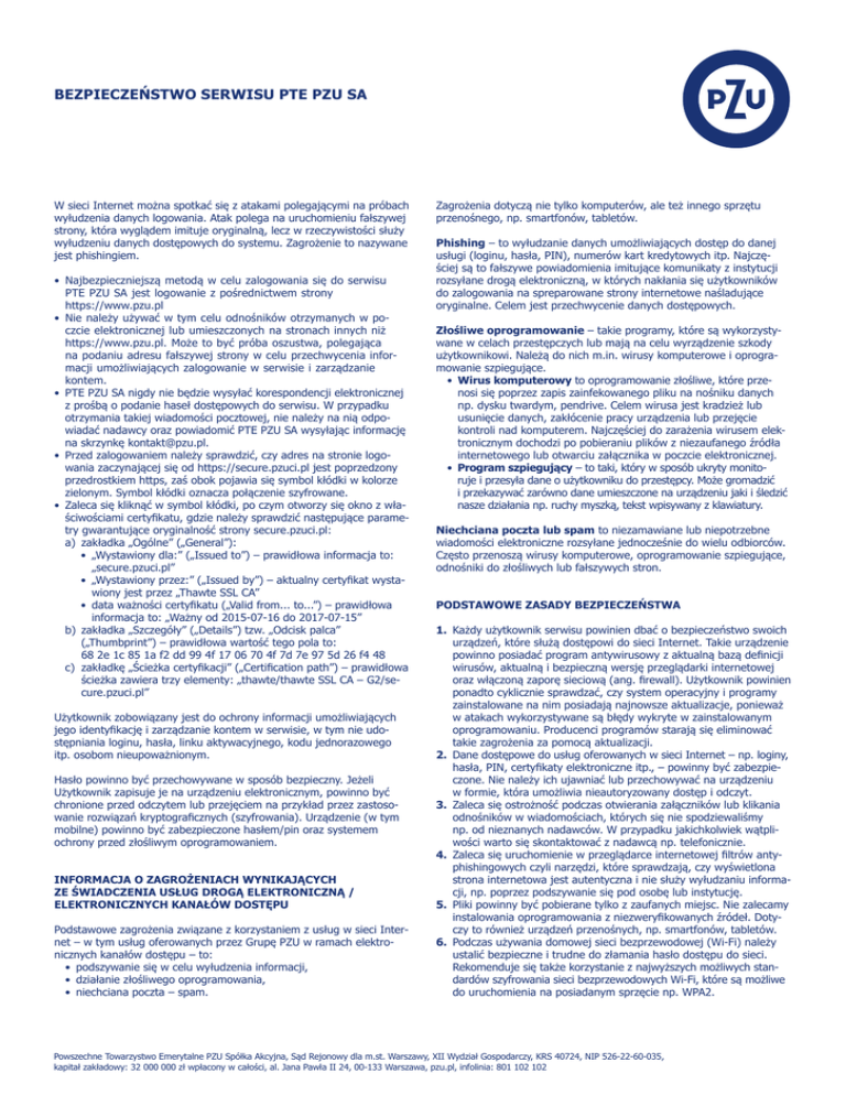 BEZPIECZEŃSTWO SERWISU PTE PZU SA W sieci Internet można spotkać się z atakami polegającymi na próbach wyłudzenia danych logowania. Atak polega na uruchomieniu fałszywej strony, która wyglądem imituje oryginalną, lecz w rzeczywistości służy wyłudzeniu danych dostępowych do systemu. Zagrożenie to nazywane jest phishingiem. • Najbezpieczniejszą metodą w celu zalogowania się do serwisu PTE PZU SA jest logowanie z pośrednictwem strony https://www.pzu.pl • Nie należy używać w tym celu odnośników otrzymanych w poczcie elektronicznej lub umieszczonych na stronach innych niż https://www.pzu.pl. Może to być próba oszustwa, polegająca na podaniu adresu fałszywej strony w celu przechwycenia informacji umożliwiających zalogowanie w serwisie i zarządzanie kontem. • PTE PZU SA nigdy nie będzie wysyłać korespondencji elektronicznej z prośbą o podanie haseł dostępowych do serwisu. W przypadku otrzymania takiej wiadomości pocztowej, nie należy na nią odpowiadać nadawcy oraz powiadomić PTE PZU SA wysyłając informację na skrzynkę [email protected]. • Przed zalogowaniem należy sprawdzić, czy adres na stronie logowania zaczynającej się od https://secure.pzuci.pl jest poprzedzony przedrostkiem https, zaś obok pojawia się symbol kłódki w kolorze zielonym. Symbol kłódki oznacza połączenie szyfrowane. • Zaleca się kliknąć w symbol kłódki, po czym otworzy się okno z właściwościami certyfikatu, gdzie należy sprawdzić następujące parametry gwarantujące oryginalność strony secure.pzuci.pl: a)zakładka „Ogólne” („General”): • „Wystawiony dla:” („Issued to”) – prawidłowa informacja to: „secure.pzuci.pl” • „Wystawiony przez:” („Issued by”) – aktualny certyfikat wystawiony jest przez „Thawte SSL CA” • data ważności certyfikatu („Valid from... to...”) – prawidłowa informacja to: „Ważny od 2015-07-16 do 2017-07-15” b)zakładka „Szczegóły” („Details”) tzw. „Odcisk palca” („Thumbprint”) – prawidłowa wartość tego pola to: 68 2e 1c 85 1a f2 dd 99 4f 17 06 70 4f 7d 7e 97 5d 26 f4 48 c)zakładkę „Ścieżka certyfikacji” („Certification path”) – prawidłowa ścieżka zawiera trzy elementy: „thawte/thawte SSL CA – G2/secure.pzuci.pl” Użytkownik zobowiązany jest do ochrony informacji umożliwiających jego identyfikację i zarządzanie kontem w serwisie, w tym nie udostępniania loginu, hasła, linku aktywacyjnego, kodu jednorazowego itp. osobom nieupoważnionym. Hasło powinno być przechowywane w sposób bezpieczny. Jeżeli Użytkownik zapisuje je na urządzeniu elektronicznym, powinno być chronione przed odczytem lub przejęciem na przykład przez zastosowanie rozwiązań kryptograficznych (szyfrowania). Urządzenie (w tym mobilne) powinno być zabezpieczone hasłem/pin oraz systemem ochrony przed złośliwym oprogramowaniem. INFORMACJA O ZAGROŻENIACH WYNIKAJĄCYCH ZE ŚWIADCZENIA USŁUG DROGĄ ELEKTRONICZNĄ / ELEKTRONICZNYCH KANAŁÓW DOSTĘPU Podstawowe zagrożenia związane z korzystaniem z usług w sieci Internet – w tym usług oferowanych przez Grupę PZU w ramach elektronicznych kanałów dostępu – to: • podszywanie się w celu wyłudzenia informacji, • działanie złośliwego oprogramowania, • niechciana poczta – spam. Zagrożenia dotyczą nie tylko komputerów, ale też innego sprzętu przenośnego, np. smartfonów, tabletów. Phishing – to wyłudzanie danych umożliwiających dostęp do danej usługi (loginu, hasła, PIN), numerów kart kredytowych itp. Najczęściej są to fałszywe powiadomienia imitujące komunikaty z instytucji rozsyłane drogą elektroniczną, w których nakłania się użytkowników do zalogowania na spreparowane strony internetowe naśladujące oryginalne. Celem jest przechwycenie danych dostępowych. Złośliwe oprogramowanie – takie programy, które są wykorzystywane w celach przestępczych lub mają na celu wyrządzenie szkody użytkownikowi. Należą do nich m.in. wirusy komputerowe i oprogramowanie szpiegujące. • Wirus komputerowy to oprogramowanie złośliwe, które przenosi się poprzez zapis zainfekowanego pliku na nośniku danych np. dysku twardym, pendrive. Celem wirusa jest kradzież lub usunięcie danych, zakłócenie pracy urządzenia lub przejęcie kontroli nad komputerem. Najczęściej do zarażenia wirusem elektronicznym dochodzi po pobieraniu plików z niezaufanego źródła internetowego lub otwarciu załącznika w poczcie elektronicznej. • Program szpiegujący – to taki, który w sposób ukryty monitoruje i przesyła dane o użytkowniku do przestępcy. Może gromadzić i przekazywać zarówno dane umieszczone na urządzeniu jaki i śledzić nasze działania np. ruchy myszką, tekst wpisywany z klawiatury. Niechciana poczta lub spam to niezamawiane lub niepotrzebne wiadomości elektroniczne rozsyłane jednocześnie do wielu odbiorców. Często przenoszą wirusy komputerowe, oprogramowanie szpiegujące, odnośniki do złośliwych lub fałszywych stron. PODSTAWOWE ZASADY BEZPIECZEŃSTWA 1. Każdy użytkownik serwisu powinien dbać o bezpieczeństwo swoich urządzeń, które służą dostępowi do sieci Internet. Takie urządzenie powinno posiadać program antywirusowy z aktualną bazą definicji wirusów, aktualną i bezpieczną wersję przeglądarki internetowej oraz włączoną zaporę sieciową (ang. firewall). Użytkownik powinien ponadto cyklicznie sprawdzać, czy system operacyjny i programy zainstalowane na nim posiadają najnowsze aktualizacje, ponieważ w atakach wykorzystywane są błędy wykryte w zainstalowanym oprogramowaniu. Producenci programów starają się eliminować takie zagrożenia za pomocą aktualizacji. 2. Dane dostępowe do usług oferowanych w sieci Internet – np. loginy, hasła, PIN, certyfikaty elektroniczne itp., – powinny być zabezpieczone. Nie należy ich ujawniać lub przechowywać na urządzeniu w formie, która umożliwia nieau