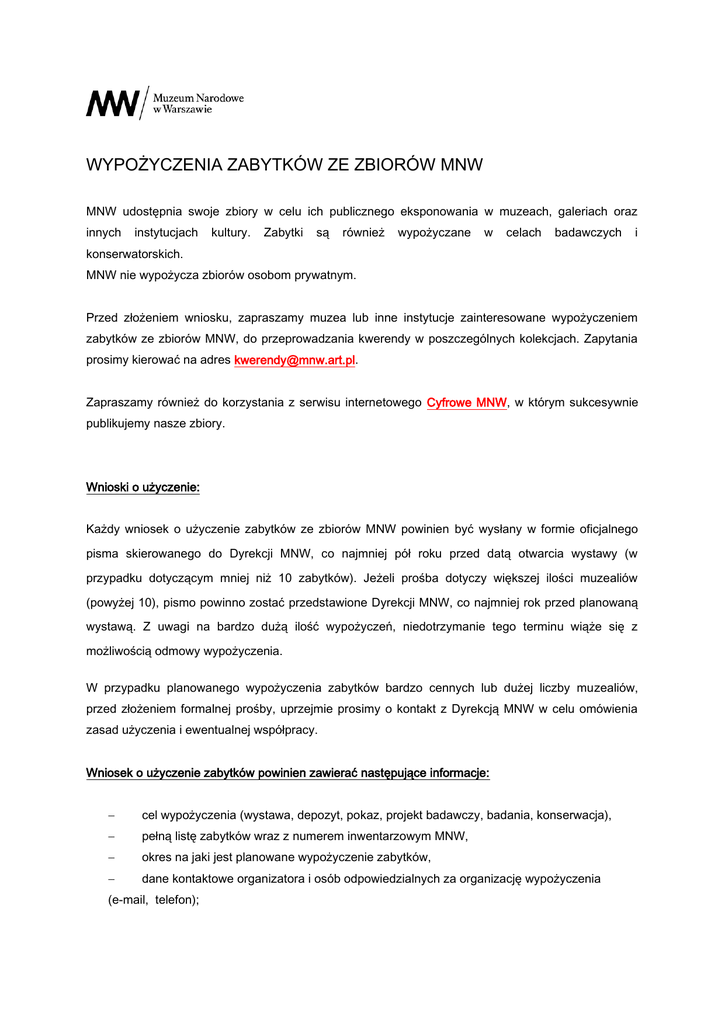 WYPOŻYCZENIA ZABYTKÓW ZE ZBIORÓW MNW MNW udostępnia swoje zbiory w celu ich publicznego eksponowania w muzeach, galeriach oraz innych instytucjach kultury. Zabytki są również wypożyczane w celach badawczych i konserwatorskich. MNW nie wypożycza zbiorów osobom prywatnym. Przed złożeniem wniosku, zapraszamy muzea lub inne instytucje zainteresowane wypożyczeniem zabytków ze zbiorów MNW, do przeprowadzania kwerendy w poszczególnych kolekcjach. Zapytania prosimy kierować na adres [email protected]. Zapraszamy również do korzystania z serwisu internetowego Cyfrowe MNW, w którym sukcesywnie publikujemy nasze zbiory. Wnioski o użyczenie: Każdy wniosek o użyczenie zabytków ze zbiorów MNW powinien być wysłany w formie oficjalnego pisma skierowanego do Dyrekcji MNW, co najmniej pół roku przed datą otwarcia wystawy (w przypadku dotyczącym mniej niż 10 zabytków). Jeżeli prośba dotyczy większej ilości muzealiów (powyżej 10), pismo powinno zostać przedstawione Dyrekcji MNW, co najmniej rok przed planowaną wystawą. Z uwagi na bardzo dużą ilość wypożyczeń, niedotrzymanie tego terminu wiąże się z możliwością odmowy wypożyczenia. W przypadku planowanego wypożyczenia zabytków bardzo cennych lub dużej liczby muzealiów, przed złożeniem formalnej prośby, uprzejmie prosimy o kontakt z Dyrekcją MNW w celu omówienia zasad użyczenia i ewentualnej współpracy. Wniosek o użyczenie zabytków powinien zawierać następujące informacje: cel wypożyczenia (wystawa, depozyt, pokaz, projekt badawczy, badania, konserwacja), pełną listę zabytków wraz z numerem inwentarzowym MNW, okres na jaki jest planowane wypożyczenie zabytków, dane kontaktowe organizatora i osób odpowiedzialnych za organizację wypożyczenia (e-mail, telefon); w przypadku wystaw i pokazów dodatkowo: tytuł oraz terminy otwarcia i zamknięcia wystawy, miejsce wystawy lub ekspozycji stałej, opis merytoryczny planowanej wystawy, notę dotyczącą planowanej publikacji i ewentualnego udziału w niej pracowników MNW. Wnioski o użyczenie prosimy kierować do: dr Agnieszka Morawińska Dyrektor Muzeum Narodowego w Warszawie Al. Jerozolimskie 3 00-495 Warszawa [email protected] Rozpatrzenie wniosku Wniosek o użyczenie zabytków jest rozpatrywany przez Dyrektora MNW na podstawie opinii kuratorów zbiorów i konserwatorów. Decyzja o wypożyczeniu zabytków jest uzależniona od terminu, w którym złożono wniosek, planów ekspozycyjnych MNW, kolejności zgłoszeń otrzymywanych od innych instytucji, stanu zachowania zabytków objętych wnioskiem, warunków przechowywania i ekspozycji oraz zabezpieczenia w nowym miejscu. Pod uwagę brany jest również scenariusz wystawy lub ekspozycji stałej. W przypadku decyzji pozytywnej, sprawa zostaje przekazana do realizacji do następujących działów: Działu Wypożyczeń - użyczenia na wystawy, pokazy (do 12 miesięcy) ([email protected]; tel. +48 22 621 10 31 w. 365); Działu Inwentarzy - użyczenia w depozyt (powyżej 12 miesięcy) ([email protected]; tel. +48 22 622 57 28 lub +48 22 621 10 31 w. 253); Działu Głównego ([email protected]; Konserwatora - użyczenia do badań i konserwacji tel. +48 22 621 10 31 w. 300). Wstępna informacja o podjętej decyzji w sprawie wypożyczenia zostaje przekazana Wnioskodawcy w ciągu dwóch miesięcy od otrzymania formalnej prośby. Warunki i koszty wypożyczenia: Biorący do używania jest zobowiązany do zapewnienia na własny koszt: materiałów do pakowania, odpowiednio przeszkolonej ekipy do pakowania zabytków, kuriera, transportu i uzbrojonego konwoju na terenie RP, jeżeli wartość przewożonych zabytków tego wymaga (Rozporządzenie Ministra Kultury i Dziedzictwa Narodowego z dnia 2 września 2014 r. w sprawie zabezpieczania zbiorów Muzeum przed pożarem, kradzieżą i innym niebezpieczeństwem grożącym ich zniszczeniem lub utratą, Dz. U.2014, poz.1240), odpowiednich warunków przechowywania i eksponowania dla użyczonych zabytków (zgodnie z zasadami opisanymi w wyżej przywołanym Rozporządzeniu MKiDN), ubezpieczenia zabytków od wszelkiego ryzyka na bazie „od gwoździa do gwoździa” (ubezpieczenie nie jest wymagane w przypadku wypożyczeń zbiorów do polskich muzeów państwowych oraz samorządowych). W przypadku wypożyczeń za granicę ubezpieczenie jest niezbędne w każdym przypadku. MNW zastrzega sobie prawo wysłania na koszt Wnioskodawcy swoich przedstawicieli w celu sprawdzenia warunków bezpieczeństwa oraz warunków klimatycznych (temperatura, wilgotność, natężenie światła) panujących w miejscu, w którym będą eksponowane lub przechowywane zabytki należące do MNW. Zastrzega sobie również prawo nadzorowania transportu oraz wszelkiego przemieszczenia zabytków, pakowania/ rozpakowywania, wieszania/ zdejmowania ze ścian, ustawiania w gablotach, a także kontroli stanu zachowania zabytków w trakcie wypożyczenia przez pracowników MNW (na koszt Wnioskodawcy). Muzea zagraniczne są zobowiązane do przesłania Raportu Bezpieczeństwa (Facility Report) przed wypożyczeniem zabytków. W przypadku pytań dotyczących zabezpieczenia zbiorów i ich przewożenia, jak również warunków przechowywania i ekspozycji, prosimy o kontakt z Działem Głównego Konserwatora: [email protected]; tel. +48 22 621 10 31 w. 300. Opcjonalne koszty wypożyczenia (uzależnione od rodzaju wypożyczenia, specyfiki zbiorów itp.) Biorący do używania jest zobowiązany do pokrycia następujących kosztów: koszt konserwacji zabytków (jeżeli zabytki wymagają przeprowadzenia zabiegów konserwatorskich); koszt oprawy (passe-partout, ramy - dotyczy m.in. rysunków, grafik); koszt przygotowania fotografii ewidencyjnej o wysokiej rozdzielczości, jeżeli zabytek takiej nie posiada; koszt podróży i diet, ewentualnie noclegu pracowników MNW, przedstawiciela Wewnętrznej Służby Ochrony (WSO) i Laboratorium w przypadku wstępnej kontroli miejsca ekspozycji, w którym będą prezentowan