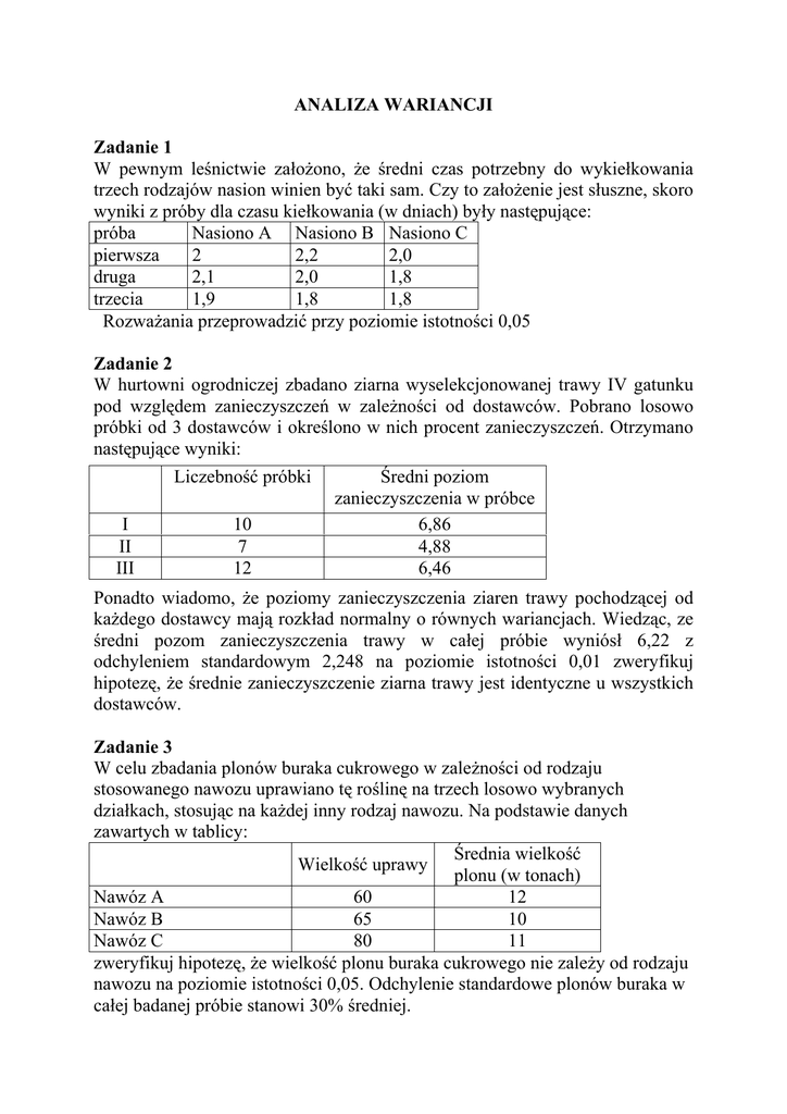 ANALIZA WARIANCJI Zadanie 1 W pewnym leśnictwie założono, że średni czas potrzebny do wykiełkowania trzech rodzajów nasion winien być taki sam. Czy to założenie jest słuszne, skoro wyniki z próby dla czasu kiełkowania (w dniach) były następujące: próba Nasiono A Nasiono B Nasiono C pierwsza 2 2,2 2,0 druga 2,1 2,0 1,8 trzecia 1,9 1,8 1,8 Rozważania przeprowadzić przy poziomie istotności 0,05 Zadanie 2 W hurtowni ogrodniczej zbadano ziarna wyselekcjonowanej trawy IV gatunku pod względem zanieczyszczeń w zależności od dostawców. Pobrano losowo próbki od 3 dostawców i określono w nich procent zanieczyszczeń. Otrzymano następujące wyniki: Liczebność próbki I II III 10 7 12 Średni poziom zanieczyszczenia w próbce 6,86 4,88 6,46 Ponadto wiadomo, że poziomy zanieczyszczenia ziaren trawy pochodzącej od każdego dostawcy mają rozkład normalny o równych wariancjach. Wiedząc, ze średni pozom zanieczyszczenia trawy w całej próbie wyniósł 6,22 z odchyleniem standardowym 2,248 na poziomie istotności 0,01 zweryfikuj hipotezę, że średnie zanieczyszczenie ziarna trawy jest identyczne u wszystkich dostawców. Zadanie 3 W celu zbadania plonów buraka cukrowego w zależności od rodzaju stosowanego nawozu uprawiano tę roślinę na trzech losowo wybranych działkach, stosując na każdej inny rodzaj nawozu. Na podstawie danych zawartych w tablicy: Średnia wielkość Wielkość uprawy plonu (w tonach) Nawóz A 60 12 Nawóz B 65 10 Nawóz C 80 11 zweryfikuj hipotezę, że wielkość plonu buraka cukrowego nie zależy od rodzaju nawozu na poziomie istotności 0,05. Odchylenie standardowe plonów buraka w całej badanej próbie stanowi 30% średniej. Zadanie 4 Zbadano czas otwierania rachunku inwestycyjnego 35 losowo wybranych osób w 3 biurach maklerskich. Przeciętny czas otwierania rachunku wśród wszystkich zbadanych osób wyniósł 10,4 min. Na podstawie wyników badania przedstawionych w tabeli zweryfikuj przy poziomie istotności 0,01 hipotezę, że średni czas na otwierania rachunku jest taki sam w każdym z biur. Nr biura Liczba Przeciętny czas Nieobciążona maklerskiego zbadanych otwierania wariancja czasu osób rachunku (w min) otwierania rachunku 1 12 9 4,2 2 10 10 3,6 3 13 12 3,8 Zadanie 5 Pewna firma farmaceutyczna testuje czas działania trzech, o podobnym przeznaczeniu, nowych leków przeciwbólowych (A,B,C). Czasy działania tych leków, zaobserwowane w losowo wybranych próbach pacjentów, były następujące (w godz.): Lek A: 8,11,12, 9; Lek B: 8, 6, 4, 7, 5; Lek C: 3, 3, 2, Wiedząc, że suma kwadratów odchyleń wartości cechy od średniej grupowej wyniosła 22 (godz.)2, zaś suma kwadratów odchyleń średnich grupowych od średniej ogólnej wyniosła 38,92 (godz.)2 należy podając konieczne założenia sprawdzić, czy rodzaj leku jest czynnikiem różnicującym średni czas działania (przyjąć poziom istotności 0,05)? Zadanie 6 W celu ustalenia czy marka samochodu istotnie różnicuje średnią miesięczną liczbę sprzedawanych samochodów zebrano informacje od 23 losowo wybranych salonów sprzedaży. Uzyskano następujące informacje dotyczące liczby sprzedanych samochodów 3 marek: suma kwadratów różnic między średnimi liczbami sprzedawanych samochodów różnych marek a ogólną średnią liczbą sprzedanych samochodów wyniosła 46 a suma kwadratów różnic pomiędzy liczbami sprzedanych samochodów a średnią ogólną wyniosła 66. Zweryfikuj odpowiednią hipotezę na poziomie istotności 0,05. Zadanie 7 Zbadano wydatki na żywność dwuosobowych gospodarstw domowych ze względu na miejsce zamieszkania (wieś, miasto poniżej 500 tys. mieszkańców, miasto powyżej 500 tys. mieszkańców). Korzystając z poniższego wydruku, proszę ocenić, czy wielkość miejsca zamieszkania różnicuje istotnie wysokość wydatków na żywność. Wydruk należy także uzupełnić o brakujące dane. Analysis of variance --------------------------------------------------------------------------------------------------------Source of variation Sum of Squares d.f. Mean square F-ratio Sig. level --------------------------------------------------------------------------------------------------------Between groups ………… … 52288.889 ……… .0000 Within groups 27533.33 … ……… --------------------------------------------------------------------------------------------------------Total (corrected) 132111.11 17