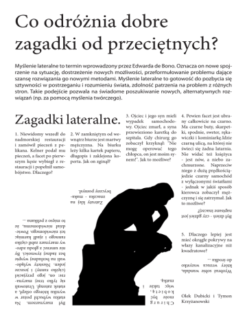 Co odróżnia dobre zagadki od przeciętnych? Myślenie lateralne to termin wprowadzony przez Edwarda de Bono. Oznacza on nowe spojrzenie na sytuację, dostrzeżenie nowych możliwości, przeformułowanie problemu dające szansę rozwiązania go nowymi metodami. Myślenie lateralne to gotowość do pozbycia się sztywności w postrzeganiu i rozumieniu świata, zdolność patrzenia na problem z różnych stron. Takie podejście pozwala na świadome poszukiwanie nowych, alternatywnych rozwiązań (np. za pomocą myślenia twórczego). Zagadki lateralne. 1. Niewidomy wszedł do nadmorskiej restauracji i zamówił pieczeń z pelikana. Kelner podał mu pieczeń, a facet po pierwszym kęsie wybiegł z restauracji i popełnił samobójstwo. Dlaczego? 2. W zamkniętym od wewnątrz biurze jest martwy mężczyzna. Na biurku leży kilka kartek papieru, długopis i zaklejona koperta. Jak on zginął? 3. Ojciec i jego syn mieli wypadek samochodowy. Ojciec zmarł, a syna przewieziono karetką do szpitala. Gdy chirurg go zobaczył krzyknął: "Nie mogę operować tego chłopca, on jest moim synem!". Jak to możliwe? 4. Pewien facet jest ubrany całkowicie na czarno. Ma czarne buty, skarpetki, spodnie, sweter, rękawiczki i kominiarkę.Idzie czarną ulicą, na której nie świeci się żadna latarnia. Nie widać też księżyca - jest nów, a niebo zachmurzone. Naprzeciw niego z dużą prędkościąjedzie czarny samochód z wyłączonymi światłami - jednak w jakiś sposób kierowca zobaczył mężczyznę i się zatrzymał. Jak to możliwe? Zatruty klej na znaczku - makabryczny pomysł. Był dzień - czy gdzieś jest napisane inaczej? 5. Dlaczego lepiej jest mieć okrągłe pokrywy na włazy kanalizacyjne niż kwadratowe? Wyobraź sobie wandala, który wrzuca wszystko do środka ... Olek Dubicki i Tymon Krzyżanowski Chirurg może być kobietą, więc także matką. i Był marynarzem. Na statku wybuchł pożar w wyniku którego oślepł, a statek zatonął. Uratowali się tylko trzej marynarze: on, jego przyjaciel (ciężko ranny) i jeszcze jeden. Niestety wylądowali na bezludnej wyspie bez żadnej żywności. By nie umrzeć z głodu zdrowy marynarz zabił ciężko rannego i zjadł karmiąc też niewidomego. Powiedział niewidomemu, że to mięso z pelikana ...
