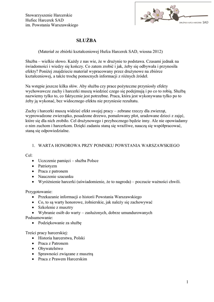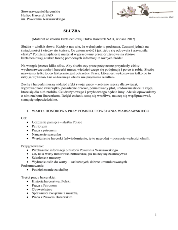 Stowarzyszenie Harcerskie Hufiec Harcerek SAD im. Powstania Warszawskiego SŁUŻBA (Materiał ze zbiórki kształceniowej Hufca Harcerek SAD, wiosna 2012) Służba – wielkie słowo. Każdy z nas wie, że w drużynie to podstawa. Czasami jednak na świadomości i wiedzy się kończy. Co zatem zrobić i jak, żeby się odbywała i przynosiła efekty? Poniżej znajdziecie materiał wypracowany przez drużynowe na zbiórce kształceniowej, a także trochę pomocnych informacji z różnych źródeł. Na wstępie jeszcze kilka słów. Aby służba czy prace pożyteczne przyniosły efekty wychowawcze zuchy i harcerki muszą wiedzieć czego się podejmują i po co to robią. Służbą nazwiemy tylko to, co faktycznie jest potrzebne. Praca, która jest wykonywana tylko po to żeby ją wykonać, bez widocznego efektu nie przyniesie rezultatu. Zuchy i harcerki muszą widzieć efekt swojej pracy – zebrane rzeczy dla zwierząt, wyprowadzone zwierzątko, posadzone drzewo, pomalowany płot, uradowane dzieci z zajęć, które się dla nich zrobiło. Cel drużynowego i przybocznego będzie inny. Ale nie opowiadamy o nim zuchom i harcerkom. Dzięki zadaniu staną się wrażliwe, nauczą się współpracować, staną się odpowiedzialne. 1. WARTA HONOROWA PRZY POMNIKU POWSTANIA WARSZAWSKIEGO Cel: Uczczenie pamięci – służba Polsce Patriotyzm Praca z patronem Nauczenie szacunku Wyróżnienie harcerki (uświadomienie, że to nagroda) – poczucie ważności chwili. Przygotowanie: Przekazanie informacji o historii Powstania Warszawskiego Co, to są warty honorowe, żołnierskie, jak należy się zachowywać Szkolenie z musztry Wybranie osób do warty – zasłużonych, dobrze umundurowanych Podsumowanie: Podziękowanie za służbę Treści pracy harcerskiej: Historia harcerstwa, Polski Praca z Patronem Obywatelstwo Sprawności związane z musztrą Praca z Prawem Harcerskim 1 Stowarzyszenie Harcerskie Hufiec Harcerek SAD im. Powstania Warszawskiego 2. SŁUŻBA NA RZECZ DZIECI – zajęcia z SAMARYTANKI Cel: Zwiększenie wiedzy i umiejętności z zakresu samarytanki Otwarcie się na społeczność, jej potrzeby Zdobycie umiejętności prowadzenia zajęć dla innych Przekazanie wiedzy Praca zespołowa Wrażliwość na otoczenie Przygotowanie: Zwiad – jak wygląda sytuacja w pobliskiej miejscowości? Czy są dzieci? W jakim wieku? Czy mają co robić? Do kogo można się zwrócić o pomoc w organizacji? Gdzie zorganizować zajęcia? Podsumowanie zwiadu i wspólne podjęcie decyzji o czy i jakie zajęcia chcemy zrobić. Przygotowanie samarytańskie – szkolenie, wymyślenie punktów, zebranie materiałów Przygotowanie się do pracy z innymi – jak mówić żeby dzieci słuchały, przerywniki, życie w małej miejscowości jak wygląda Wymyślenie sposobu przeprowadzenia zajęć Informowanie – plakaty, ksiądz, wójt, świetlica Przeprowadzenie zajęć i podsumowanie z uczestnikami – dziećmi Podsumowanie z harcerkami wykonanego zadania zespołowego Podsumowanie w gronie kadry – osiągnięcie celów wychowawczych W ramach cyklu: Samarytanka, Opiekunka dzieci, zwiady społeczne, sprawności obywatelskie 3. MALOWANIE PŁOTU W ZOO Cel: Odpowiedzialność Praca na rzecz społeczności, w której mieszkam – poczucie wspólnoty Przygotowanie: Kontakt z zoo – ile osób może to robić, czy zapewniają sprzęt czy trzeba go zorganizować, kiedy można podjąć działanie Podjęcie decyzji drużyną/gromadą że chcemy to zrobić Przygotowanie materiałów Poinformowanie rodziców – mogą to zrobić wspólnie z nami Malowanie płotu Podsumowanie – podziękowanie, zrobienie zdjęć, wycieczka do zoo. Cykl: przyjaciel zwierząt, zootechnik, obserwator zwierzyny, sprawności z działu przyroda, dział przyroda w stopniach 2 Stowarzyszenie Harcerskie Hufiec Harcerek SAD im. Powstania Warszawskiego 4. POMOC OSOBIE STARSZEJ Cel: Wrażliwość na ludzi Odpowiedzialność Systematyczność Przygotowanie: Podjęcie decyzji, że chcemy się takiej służby podjąć. Uświadomienie z czym to się wiąże. Wcześniej wizyta w domu spokojnej starości lub innej instytucji pracującej z osobami starszymi Poszukiwania osoby, której można pomóc – kościół, znajomi, sąsiedzi, pomoc społeczna Kontakt z osoba i umówienie się na spotkanie. Na spotkaniu drużynowa i przyboczne ustalają zakres obowiązków, dni działania Ustalenie z zastępem grafiku działania Pomoc osobie potrzebującej W trakcie drużynowa, lub wyznaczona przyboczna musi nadzorować czy zastępy realizują to, do czego się zobowiązały. Podsumowanie z drużyną, z zastępowymi. PRZYKŁADY – Pomysły służb i miejsca gdzie szukać 1 listopada – czyszczenie grobów, zapalanie zniczy, kwiaty na pomnikach Udział w akcjach społecznych Szlachetna paczka – przygotowanie drużyną paczki - http://www.szlachetnapaczka.pl/ Zajęcia w świetlicy środowiskowej Bank Żywności – udział w zbiórce żywności, pomoc w magazynie, drużynowe – koordynacja. - http://www.bankizywnosci.pl/ Roznoszenie paczek z kościoła Marzycielska poczta - http://marzycielskapoczta.pl/ Zadania z centrum wolontariatu - http://www.wolontariat.org.pl/ Towarzysz osoby niepełnosprawnej – dla starszych harcerek i harcerzy Pomoc przy dostaniu się na wybory http://ogloszenia.ngo.pl/organizacja_szuka_wolontariusza http://otwock.pttk.pl/szlaki/malarze/ - malowanie szlaków w okolicach Otwocka tymczasowy dom dla królika - http://www.kroliki.net/ pomoc przy dokarmianiu kotów w mieście zbieranie rzeczy dla schroniska dla zwierząt PRACE POŻYTECZNE Nie będę powtarzać czegoś co już ktoś napisał. Zajrzyjcie do skryptu Kursu Wodzów Zuchowych Trakt. http://sh.org.pl/images/dokumentySH/MetodykaZuchowa/KWZ/KWZ-pozyteczne-prace.pdf 3 Stowarzyszenie Harcerskie Hufiec Harcerek SAD im. Powstania Warszawskiego SŁUŻBA Na podstawie „Sekrety dobrej drużyny” „Wychowujemy więc przez pracę, której cel dla każdego jest oczywisty, a efekt namacalny. Jej sen