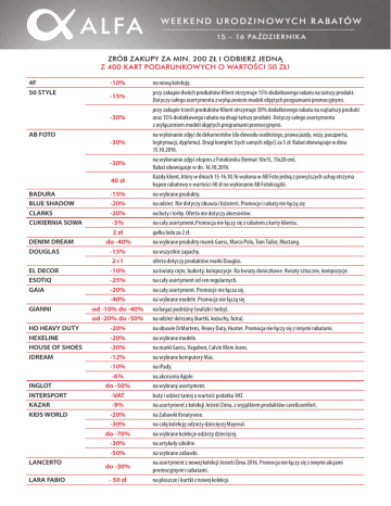 W E E K E N D U R O DZ I N OW YC H R A B ATÓW 15 – 16 PA ŹDZIERNIK A ZRÓB ZAKUPY ZA MIN. 200 ZŁ I ODBIERZ JEDNĄ Z 400 KART PODARUNKOWYCH O WARTOŚCI 50 ZŁ! 4F -10% na nową kolekcję. -15% przy zakupie dwóch produktów Klient otrzymuje 15% dodatkowego rabatu na tańszy produkt. Dotyczy całego asortymentu z wyłączeniem modeli objętych programami promocyjnymi. -30% przy zakupie trzech produktów Klient otrzymuje 30% dodatkowego rabatu na najtańszy produkt oraz 15% dodatkowego rabatu na drugi tańszy produkt. Dotyczy całego asortymentu z wyłączeniem modeli objętych programami promocyjnymi. -30% na wykonanie zdjęć do dokumentów (do dowodu osobistego, prawa jazdy, wizy, paszportu, legitymacji, dyplomu). Drugi komplet (tych samych zdjęć) za 5 zł. Rabat obowiązuje w dniu 15.10.2016. -30% na wykonanie zdjęć ekspres z Fotokiosku (format 10x15, 15x20 cm). Rabat obowiązuje w dn. 16.10.2016. 40 zł Każdy klient, który w dniach 15-16.10.16 wykona w AB Foto jedną z powyższych usług otrzyma kupon rabatowy o wartości 40 zł na wykonanie AB Fotoksiążki. BADURA -15% na wybrane produkty. BLUE SHADOW -20% na odzież. Nie dotyczy obuwia i biżuterii. Promocje i rabaty nie łączą się. CLARKS -20% na buty i torby. Oferta nie dotyczy akcesoriów. CUKIERNIA SOWA -5% na cały asortyment.Promocja nie łączy się z rabatem z karty klienta. 2 zł gałka loda za 2 zł. 50 STYLE AB FOTO DENIM DREAM DOUGLAS do -40% na wybrane produkty marek Guess, Marco Polo, Tom Tailor, Mustang. -15% na wszystkie zapachy. 2+1 oferta dotyczy produktów marki Douglas. EL DECOR -10% na kwiaty cięte, bukiety, kompozycje. Na kwiaty doniczkowe. Kwiaty sztuczne, kompozycje. ESOTIQ -25% na cały asortyment od cen regularnych. GAIA -20% na cały asortyment. Promocje nie łącza się. -40% na wybrane modele. Promocje nie łączą się. GIANNI od -10% do -40% na bagaż podróżny (walizki i torby). od -20% do -50% na odzież skórzaną (kurtki, kożuchy, futra). HD HEAVY DUTY -20% na obuwie DrMartens, Heavy Duty, Hunter. Promocja nie łączy się z innymi rabatami. HEXELINE -20% na wybrane modele. HOUSE OF SHOES -20% na marki Guess, Vagabon, Calvin Klein Jeans. iDREAM -12% na wybrane komputery Mac. -10% na iPady. -6% na akcesoria Apple. INGLOT do -50% na wybrany asortyment. INTERSPORT -VAT buty i odzież taniej o wartość podatku VAT. KAZAR -9% na asortyment z kolekcji Jesień/Zima, z wyjątkiem produktów care&comfort. KIDS WORLD -20% na Zabawki Kreatywne. -30% na całą kolekcję odzieży dziecięcej Mayoral. do -70% LANCERTO LARA FABIO na wybrane kolekcje odzieży dziecięcej. -30% na artykuły szkolne. -50% na wybrane zabawki. do -30% - 50 zł na asortyment z nowej kolekcji Jesień/Zima 2016. Promocja nie łączy się z innymi akcjami promocyjnymi i rabatami. na płaszcze i kurtki z nowej kolekcji. LEVI’S -20% LU-MAN MY HOME BY INSPIRACJA na cały asortyment. do -30% na kolekcję Jesień/Zima 2016. do -70% na kolekcję Wiosna/Lato 2016. -30% na narzuty dziecięce, obrusy CARLA bawełniano-poliestrowe w 4 kolorach (biel, krem, beż, szary), obrusy szydełkowe białe i kremowe. -65% poduszki ozdobne w kształcie serce i motyl, 2 wzory, w cenie 9,90 zł. -80% małe „poduszeczki - serduszka”, różne wzory, w cenie 2,90 zł -50% poszewki gobelinowe, wybrane wzory, w cenie 15 zł NEW BALANCE -20% na obuwie biegowe damskie i męskie, na całą odzież, na obuwie z edycji limitowanej VIP Space. NIKE -20% na nową kolekcję. Rabat udzielany jest od cen katalogowych. -10% przy zakupie jednego produktu. Rabat obowiązuje w dniu 15.10.2016r. Promocje nie łączą się. Promocja nie obejmuje środków do konserwacji i pielęgnacji skór. -20% przy zakupie dwóch produktów lub więcej. Rabat obowiązuje w dniu 15.10.2016r. Promocje nie łączą się. Promocja nie obejmuje środków do konserwacji i pielęgnacji skór. PATRIZIA ARYTON -20% na kolekcję Jesień/Zima 2016. Oferta nie dotyczy futer. PIERRE CARDIN -20% na cały asortyment. PIERRE MICHEL -20% na marynarki i spodnie z nowej kolekcji. -50% na wybrane kolekcje. PIOTR I PAWEŁ -20% na wybrane produkty marki „Piotr i Paweł”. PRO SPORT -20% na produkty marek The North Face, Columbia, Hannah, Vans, OUTHORN. REVERT 3 za 2 kup trzy koszule firmowe Revert, zapłać za dwie. SHINKS -20% na dania główne z menu głównego. -50% na napoje z menu głównego. SUBWAY -35% Dowolny sandwich 15 cm + sok Cappy 0,33l + ciastko = 12,50 zł. SUSHI TO GO -10% na wszystkie produkty własne. OCHNIK SWISS Prezent niespodzianka przy zakupie zegarka powyżej 300 zł. Oferta dotyczy wszystkich zegarków w pełnej cenie. Prezent niespodzianka + grawerowanie gratis przy zakupie zegarka powyżej 1 000 zł. Oferta dotyczy wszystkich zegarków w pełnej cenie. TCHIBO -20% na wszystkie produkty użytkowe. Promocja nie dotyczy oferty z baru, kawy i Cafissimo. TOUS -10% na cały asortyment. Promocja nie łączy się z innymi rabatami. TRIUMPH -25% na cały asortyment. Rabat nie łączy się z innymi promocjami. UNISONO -15% na kolekcję Jesień/Zima 2016. VENEZIA -10% na kolekcję Jesień/Zima 2016. VESARI -30% na cały asortyment. VILLEROY&BOCH ROSENTHAL -20% na cały asortyment Villeroy&Boch, Rosenthal, Goebel, Lampe Berger. VISION EXPRESS -20% na okulary korekcyjne, na okulary przeciwsłoneczne, na akcesoria. -10% na soczewki kontaktowe marki iWear, na płyny pielęgnacyjne marki iWear. 1 zł przy zakupie okularów badanie wzroku za 1 zł. -50% na badanie wzroku bez zakupu okularów. VISTULA -20% na całą kolekcję. Rabat obowiązuje od cen regularnych i nie łączy się z innymi promocjami. WILSOOR -20% na cały nieprzecenieniony asortyment. WÓJCIK FASHION -20% na nieprzecenioną kolekcję Jesień/Zima 2016. WÓLCZANKA -30% na całą kolekcję. Rabat obowiązuje od cen regularnych i nie łączy się z innymi promocjami. YES -50 zł rabat udzielany przy zakupach za min. 300 zł. YVES ROCHER -40% na dowolny kosmetyk poza produktami oznaczonymi zielonym punktem. Promocje ni