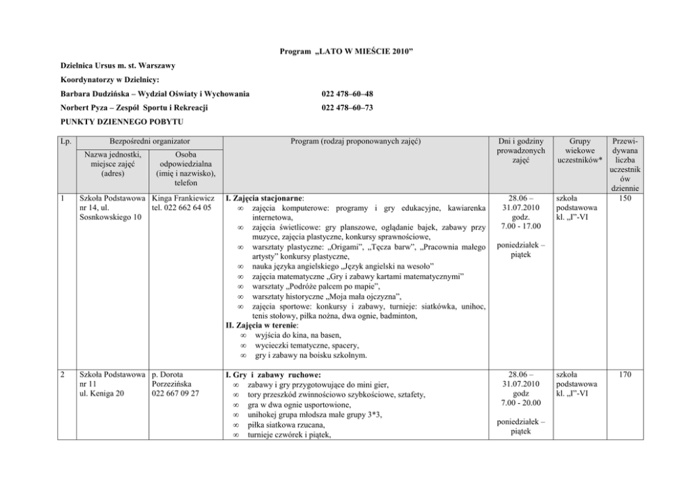 Program „LATO W MIEŚCIE 2010” Dzielnica Ursus m. st. Warszawy Koordynatorzy w Dzielnicy: Barbara Dudzińska – Wydział Oświaty i Wychowania 022 478–60–48 Norbert Pyza – Zespół Sportu i Rekreacji 022 478–60–73 PUNKTY DZIENNEGO POBYTU Lp. Bezpośredni organizator Nazwa jednostki, miejsce zajęć (adres) 1 2 Program (rodzaj proponowanych zajęć) Dni i godziny prowadzonych zajęć I. Zajęcia stacjonarne: • zajęcia komputerowe: programy i gry edukacyjne, kawiarenka internetowa, • zajęcia świetlicowe: gry planszowe, oglądanie bajek, zabawy przy muzyce, zajęcia plastyczne, konkursy sprawnościowe, • warsztaty plastyczne: „Origami”, „Tęcza barw”, „Pracownia małego artysty” konkursy plastyczne, • nauka języka angielskiego „Język angielski na wesoło” • zajęcia matematyczne „Gry i zabawy kartami matematycznymi” • warsztaty „Podróże palcem po mapie”, • warsztaty historyczne „Moja mała ojczyzna”, • zajęcia sportowe: konkursy i zabawy, turnieje: siatkówka, unihoc, tenis stołowy, piłka nożna, dwa ognie, badminton, II. Zajęcia w terenie: • wyjścia do kina, na basen, • wycieczki tematyczne, spacery, • gry i zabawy na boisku szkolnym. 28.06 – 31.07.2010 godz. 7.00 - 17.00 Osoba odpowiedzialna (imię i nazwisko), telefon Szkoła Podstawowa Kinga Frankiewicz nr 14, ul. tel. 022 662 64 05 Sosnkowskiego 10 Szkoła Podstawowa p. Dorota nr 11 Porzezińska ul. Keniga 20 022 667 09 27 I. Gry i zabawy ruchowe: • zabawy i gry przygotowujące do mini gier, • tory przeszkód zwinnościowo szybkościowe, sztafety, • gra w dwa ognie usportowione, • unihokej grupa młodsza małe grupy 3*3, • piłka siatkowa rzucana, • turnieje czwórek i piątek, Grupy wiekowe uczestników* szkoła podstawowa kl. „I”-VI Przewidywana liczba uczestnik ów dziennie 150 poniedziałek – piątek 28.06 – 31.07.2010 godz 7.00 - 20.00 poniedziałek – piątek szkoła podstawowa kl. „I”-VI 170 • • • • • • unihokej grupa starsza piłka siatkowa gra szkolna piłka koszykowa turnieje trójek piłka nożna – turnieje międzyszkolne tenis stołowy- gry pojedyncze, deble, gry grupowe na wesoło (turniej tenisa) • zajęcia na basenie ( jeden raz dziennie od 1000 - 1100) • zawody międzyszkolne w grach zespołowych –koszykówka, siatkówka • Zajęcia z samoobrony • Zajęcia z Akademi Wiercipiołka • Gry i zabawy z wykorzystaniem metod pedagogiki zabawy „Klanza” zabawy z chustą II. Zajęcia komputerowe • pierwsze kroki w Windows – poznajemy budowę i sposoby obsługi okna - multimedialny kurs obsługi klasy I-III • wykonujemy wizytówki, dyplomy, kartki, zaproszenia na różne okazje drukujemy swoje prace • „Klik Plik” – rysujemy i malujemy na ekranie w Paintcie • multimedialne programy edukacyjne wspomagające naukę (encyklopedie) • tworzenie prezentacji multimedialnych i oglądanie ich na tablicy interaktywnej • kawiarenka internetowa – nauka obsługi Internetu, • wysyłanie i odbieranie poczty, informacji na zadany temat, wyszukiwanie • wpływ komputera na zdrowie człowieka, zagrożenia płynące z Internetu „dziecko w sieci” • rozrywka z komputerem (ortograf, milionerzy, koło fortuny, rozwiązywanie zagadek, krzyżówek, logografów, rebusów, gry strategiczne itp.) III. Zajęcia świetlicowe • gry planszowe: warcaby, szachy, lotti, dom mody, domino, bierki, monopol, scrable, twister, super skojarzenia, chińczyk, connect, „Zakochany w Warszawie”, kim jestem, wygibajtus, • zabawy relaksacyjne, zabawy piłkami, skakanie na skakankach, hula hop, • rysowanie kredkami, bambino, węglem, farbami: akwarele i plakatówki, lepienie: z gliny, plasteliny, modeliny, masy solnej, rysowanie kredą po chodniku 3 Zespół Szkół Nr 80 (Szkoła Podstawowa nr 2) ul. Orłów Piastowskich 47 tel: (22) 667 4654 Krystyna Zych – Włodarczyk 1 Zespół Szkół nr 42 ul. Konińska 2 p. Zofia Kościak 022 662 67 80 • dyskoteki z konkursami, oglądanie bajek na video, nauka piosenek, tańce regionalne, dyskotekowe, hip-hop , aerobik przy muzyce itp. IV. Konkursy plastyczne, konkursy wiedzy, konkurs piosenki dowolnej, konkursy tańca dyskotekowego V. Edukacja filmowa i teatralna: • oglądanie, lektur szkolnych, filmów o komunikacji, • wyjścia do kina „Arsus” na filmy oraz przedstawienia teatralne i muzyczne • wyjścia do klubu „Miś” – na profesjonalne zajęcia taneczne i plastyczne. • wyjścia do ZOO, Sejmu, wycieczki po Warszawie, kolorado, kręgle, muzea ogrody muzyczne, statek po Wiśle, I. „ W kręgu Wielkich Polaków’’ • Poznawanie sylwetek sławnych Polaków • Wycieczki po Warszawie- odwiedzanie pomników i miejsc związanych ze sławnymi ludźmi • Wykonywanie zdjęć • Wystawa fotograficzna • Konkursy plastyczne , konkury wiedzy II. Zajęcia świetlicowe • gry i zabawy stolikowe, zręcznościowe, • zajęcia plastyczne, • zajęcia muzyczne, III. Zajęcia sportowe na sali gimnastycznej, dolnym holu i na świeżym powietrzu, boiskach sportowych, placu zabaw • rozgrywki w tenisa stołowego, • turniej hula – hop, • zabawy ze skakanką, • zabawy z chustą animacyjną IV. Wycieczki do kina, na zajęcia w Domach Kultury, korzystanie z ciekawych propozycji warszawskich I. Zajęcia plastyczne: - konkursy plastyczne: kolaż, witraże, lepienie z plasteliny - konkursy na najlepszą pracę plastyczną. II. Pogadanki, zajęcia czytelnicze. III. Zajęcia sprawnych rąk: wydzieranki z kolorowego papieru, papieroplastyka, zajęcia w domach kultury, konkursy, IV. Wyjazdy (w miarę możliwości): do muzeum, kina, zwiedzanie miasta i okolic. V. Zabawy ruchowe przy muzyce. VI. Zajęcia sportowe w sali gimnastycznej: 02.08 – 27.08.2010 godz. 7.00 – 17.00 szkoła podstawowa gimnazjum 02.08.-27.08. godz. 7.00 - 20.00 szkoła podstawowa kl. „0”-VI poniedziałek – piątek 70 100 - - gry i zabawy sportowe wyścigi rzędów zwinnościowy t