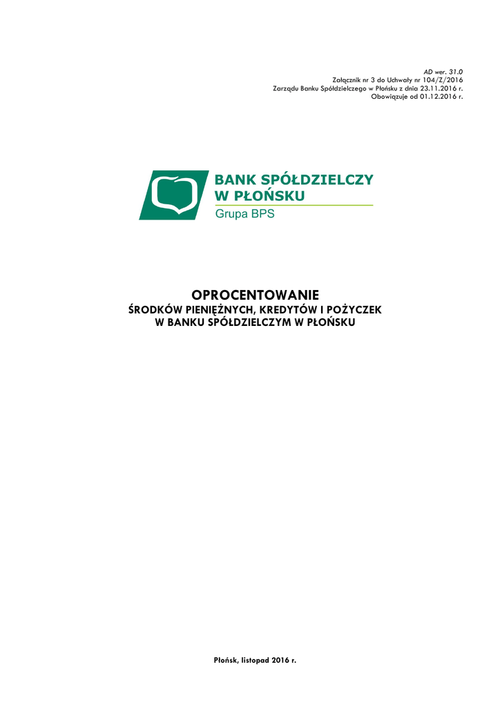 AD wer. 31.0 Załącznik nr 3 do Uchwały nr 104/Z/2016 Zarządu Banku Spółdzielczego w Płońsku z dnia 23.11.2016 r. Obowiązuje od 01.12.2016 r. OPROCENTOWANIE ŚRODKÓW PIENIĘŻNYCH, KREDYTÓW I POŻYCZEK W BANKU SPÓŁDZIELCZYM W PŁOŃSKU Płońsk, listopad 2016 r. OPROCENTOWANIE ŚRODKÓW PIENIĘŻNYCH, KREDYTÓW I POŻYCZEK DLA OSÓB FIZYCZNYCH 1. Oprocentowanie środków pieniężnych na rachunkach złotowych dla osób fizycznych Tabela 1. Rachunki oszczędnościowe, płatne na każde żądanie. Wkłady oszczędnościowe na kontach osobistych – oprocentowanie zmienne 1. UNIKONTO 0,00 % 2. UNIKONTO SENIOR 0,00 % 3. Rachunki oszczędnościowe płatne na żądanie 0,00 % 4. Rachunki oszczędnościowe płatne na żądanie Szkolnych Kas Oszczędnościowych 1,00 % 5. Unikonto Oszczędnościowe 0,00 zł – 999,99 zł. 0,10 % 1.000,00 zł – 49.999,99 zł. 0,20 % 50.000,00 zł i powyżej 0,60 % Tabela 2. Rachunki terminowych lokat oszczędnościowych Lp Rodzaj lokaty 1. 2. 3. 4. 5. 6. 7. 8. Oprocentowanie stałe zmienne 1 miesięczne do 9.999,99 zł. 0,10 % od 10.000,00 zł do 49.999,99 zł 0,20 % od 50.000,00 zł 0,60% 3 miesięczne do 9.999,99 zł. 0,20% 0,10% od 10.000,00 zł do 49.999,99 zł 0,40% 0,20% od 50.000,00 zł 0,70% 0,50% 6 miesięczne do 9.999,99 zł. 0,20% od 10.000,00 zł do 49.999,99 zł 0,30% od 50.000,00 zł 0,70% 9 miesięczne do 9.999,99 zł. 0,30% od 10.000,00 zł do 49.999,99 zł 0,40% od 50.000,00 zł 0,80% 12 miesięczne do 9.999,99 zł. 0,40% od 10.000,00 zł do 49.999,99 zł 0,60% od 50.000,00 zł 0,90% 15 miesięczne do 9.999,99 zł. 0,50% od 10.000,00 zł do 49.999,99 zł 0,70% od 50.000,00 zł 1,00% 24 miesięczne do 29.999,99 zł 0,70% od 30.000,00 zł 1,10% 36 miesięczne do 29.999,99 zł od 30.000,00 zł 9. Lokata „INWESTOR I " 60 miesięczna* (odsetki naliczane co 1 miesiąc) 5.000,00 zł – 29.999,99 zł. 30.000,00 zł – 49.999,99 zł. 50.000,00 zł – 99.999,99 zł. 100.000,00 zł i powyżej 10. Lokata „INWESTOR II" 6,12,24,36,48,60 miesięczna* (odsetki nal. co 3 m.) 11. Lokata „INWESTOR III " 60 miesięczna (odsetki naliczane co 6 miesięcy) 5.000,00 zł – 29.999,99 zł. 0,70% 1,20% 0,40% 0,50% 0,60% 0,70% 0,80% 0,90% 30.000,00 zł – 49.999,99 zł. 1,00% 50.000,00 zł – 99.999,99 zł. 1,10% 2 100.000,00 zł i powyżej 1,20% 12. Unilokata 3 miesięczna 6 miesięczna 13. Unizachęta (lokata 3 miesięczna powiązana z inwestycją w Fundusze Inwestycyjne) 0,70% 0,90% 14. Wkłady na książeczkach mieszkaniowych 15. Dynamiczna lokata oszczędnościowa dla osób fizycznych na okres 12 miesięcy likwidowana, w miesiącu od daty jej założenia** - 0,10% oprocentowanie zmienne Pierwszym Drugim Trzecim Czwartym Piątym Szóstym Siódmym Ósmym Dziewiątym Dziesiątym Jedenastym Dwunastym po upływie okresu umownego 16. Dynamiczna lokata oszczędnościowa dla osób fizycznych likwidowana w miesiącu od daty jej założenia**- oprocentowanie zmienne a) Pierwszym b) Drugim c) Trzecim d) Czwartym e) Piątym f) Szóstym g) Siódmym h) Ósmym i) Dziewiątym J) Dziesiątym k) Jedenastym l) Dwunastym ł) Trzynastym m) Czternastym n) Piętnastym o) Szesnastym 3,00% a) b) c) d) e) f) g) h) i) J) k) l) ł) 0,00% 0,00% 0,00% 0,00% 0,00% 0,00% 0,05% 0,10% 0,15% 0,20% 0,25% 0,30% 0,40% 18 m-cy 24 m-ce 0,00% 0,00% 0,00% 0,00% 0,00% 0,00% 0,05% 0,10% 0,15% 0,20% 0,25% 0,30% 0,35% 0,40% 0,50% 0,60% 0,00% 0,00% 0,00% 0,00% 0,00% 0,00% 0,05% 0,10% 0,15% 0,20% 0,25% 0,30% 0,35% 0,40% 0,50% 0,60% p) Siedemnastym 0,70% 0,70% r) Osiemnastym 0,80% 0,80% s) Dziewiętnastym X 0,90% t) Dwudziestym X 1,00% u) Dwudziestym pierwszym X 1,10% w) Dwudziestym drugim X 1,20% y) Dwudziestym trzecim X 1,30% z) Dwudziestym czwartym X 1,40% ż) Po okresie umownym 17. Lokata Optimum od 1.000,00 zł. do 20.000,00 zł 1,00% 1,50% stałe zmienne St. Ref. + marża 0,00 p.p. powyżej 20.000,00 zł do 50.000,00 zł St. Ref. + marża 0,10 p.p. powyżej 50.000,00 zł do 100.000,00 zł St. Ref. + marża 0,20 p.p. powyżej 100.000,00 zł St. Ref. + marża 0,30 p.p. 18. Lokata Platinum od 1.000,00 zł 24-miesięczna 1,50% 36-miesięczna 1,60% *Minimalna kwota lokat: INWESTOR I i INWESTOR II wynosi: 5.000,00 zł, **Minimalna wysokość lokaty dynamicznej 12, 18 i 24 miesięcznej wynosi: 5.000 zł St. ref. – Stopa referencyjna NBP. Informacja o aktualnej wysokości stopy referencyjnej udostępniana jest Klientom w placówkach Banku oraz na stronie internetowej Banku pod adresem: www.bsplonsk.pl. 3 Tabela 3. Lok@ty Internetowe Lp Oprocentowanie Rodzaj lokaty 1. 2. stałe Lokata 14 dniowa od 2.000,00 do 49.999,99 zł. 0,50% od 50.000 do 99.999,99 zł. 1,00% od 100.000,00 zł. 1,50% Lokaty standardowe od 1.000,00 zł 1 miesięczna 0,90% 3 miesięczna 1,00% 6 miesięczna 1,10% 12 miesięczna 3. 4. zmienne - 1,30% Lokaty e-Inwestor od 5.000,00 zł e-Inwestor I (odsetki naliczane co 1 miesiąc) 1,60% e-Inwestor II (odsetki naliczane co 3 miesiące) 1,70% e-Inwestor III (odsetki naliczane co 6 miesięcy) 1,80% e-Inwestor IV (odsetki naliczane co 12 miesięcy) 1,90% Lokata Platinum od 1.000,00 zł 24-miesięczna 2,00% 36-miesięczna 2,10% 2. Oprocentowanie środków pieniężnych na rachunkach w walutach wymienialnych osób fizycznych Tabela 1. Rachunki oszczędnościowe płatne na każde żądanie w walutach wymienialnych Lp. 1. EUR Rodzaj rachunku Rachunki walutowe z wkładem oszczędnościowym płatnym na każde żądanie 0,00% oprocentowanie zmienne Tabela 2: Rachunki terminowych lokat oszczędnościowych w walutach wymienialnych Lp. EUR Okres zadeklarowany USD 0,00% USD oprocentowanie zmienne 1. 1 miesięczne 0,01% 0,10% 2. 3 miesięczne 0,01% 0,20% 3. 6 miesięczne 0,01% 0,40% Minimalna kwota wymagana do otwarcia rachunku wynosi: dla lokat 500 USD i 250 EURO, dla rachunków a' vista 100 USD i 100 EURO. Oprocentowanie w przypadku podjęcia środków przed upływem zadeklarowanego terminu w wysokości oprocentowania rachunków płatnych na każde żądanie. 3. Oprocentowanie kredytów zł