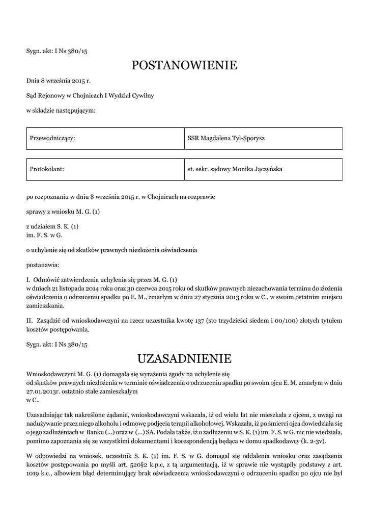Sygn. akt: I Ns 380/15 POSTANOWIENIE Dnia 8 września 2015 r. Sąd Rejonowy w Chojnicach I Wydział Cywilny w składzie następującym: Przewodniczący: SSR Magdalena Tyl-Sporysz Protokolant: st. sekr. sądowy Monika Jączyńska po rozpoznaniu w dniu 8 września 2015 r. w Chojnicach na rozprawie sprawy z wniosku M. G. (1) z udziałem S. K. (1) im. F. S. w G. o uchylenie się od skutków prawnych niezłożenia oświadczenia postanawia: I. Odmówić zatwierdzenia uchylenia się przez M. G. (1) w dniach 21 listopada 2014 roku oraz 30 czerwca 2015 roku od skutków prawnych niezachowania terminu do złożenia oświadczenia o odrzuceniu spadku po E. M., zmarłym w dniu 27 stycznia 2013 roku w C., w swoim ostatnim miejscu zamieszkania. II. Zasądzić od wnioskodawczyni na rzecz uczestnika kwotę 137 (sto trzydzieści siedem i 00/100) złotych tytułem kosztów postępowania. Sygn. akt: I Ns 380/15 UZASADNIENIE Wnioskodawczyni M. G. (1) domagała się wyrażenia zgody na uchylenie się od skutków prawnych niezłożenia w terminie oświadczenia o odrzuceniu spadku po swoim ojcu E. M. zmarłym w dniu 27.01.2013r. ostatnio stale zamieszkałym w C.. Uzasadniając tak nakreślone żądanie, wnioskodawczyni wskazała, iż od wielu lat nie mieszkała z ojcem, z uwagi na nadużywanie przez niego alkoholu i odmowę podjęcia terapii alkoholowej. Wskazała, iż po śmierci ojca dowiedziała się o jego zadłużeniach w Banku (...) oraz w (...) SA. Podała także, iż o zadłużeniu w S. K. (1) im. F. S. w G. nic nie wiedziała, pomimo zapoznania się ze wszystkimi dokumentami i korespondencją będąca w domu spadkodawcy (k. 2-3v). W odpowiedzi na wniosek, uczestnik S. K. (1) im. F. S. w G. domagał się oddalenia wniosku oraz zasądzenia kosztów postępowania po myśli art. 520§2 k.p.c, z tą argumentacją, iż w sprawie nie wystąpiły podstawy z art. 1019 k.c., albowiem błąd determinujący brak oświadczenia wnioskodawczyni o odrzuceniu spadku po ojcu nie był istotny, przeto wnioskodawczyni nie wykazała należytej staranności, celem powzięcia wiedzy w zakresie ewentualnych zobowiązań jej ojca. Okoliczność tę umacnia fakt nadużywania przez spadkodawcę alkoholu i nieczęsty z nim kontakt wnioskodawczyni, co tym bardziej winno ją wyczulić na zbadanie sytuacji finansowej, pod kątem ewentualnych długów, jej ojca (k. 22-22v). Na rozprawie w dniu 30 czerwca 2015r. Sąd odebrał od wnioskodawczyni oświadczenie o uchyleniu się od skutków prawnych niezłożenia w terminie oświadczenia o odrzuceniu spadku po swoim ojcu (k. 33). Sąd Rejonowy ustalił, co następuje: W dniu 27 stycznia 2013r., w C., w swoim ostatnim miejscu zamieszkania zmarł E. M.. Spadkodawczynią ustawową po w/w jest córka M. G. (1), zam. w C.. / bezsporne , nadto dowód : odpisy aktów USC (k. 7-8 akt I Ns 772/14) Przed śmiercią E. M. posiadał zadłużenia w Banku (...) S.A., (...) S.A. oraz w (...) im. (...) w G.. / bezsporne , nadto dowód : zeznania świadka M. G. (2) (k. 49); zeznania wnioskodawczyni M. G. (1) (k. 49)/ E. M. był osobą uzależnioną od alkoholu, który to nałóg wypierał i odmawiał poddania się leczeniu. Niemniej jednak skutkiem nałogu zaniedbywał swoje obowiązki, w tym finansowe. W dniu 15.01.2010r. do SR w Chojnicach wpłynął wniosek (...) w C.. Sprawę zainicjowała M. G. (1), podając, iż ojciec nadużywa alkoholu, nie reguluje opłat czynszowych, bywa agresywny i używa w stosunku do córki słów wulgarnych. / dowód : opinia sądowa psychiatryczno-psychologiczna (k. 39-40); zeznania świadka M. G. (2) (k. 49); zeznania wnioskodawczyni M. G. (1) (k. 49)/ E. M. jeszcze za życia popadł w zadłużenie w spółdzielni mieszkaniowej, skutkiem czego wystosowywano do niego monity z ewentualnym zainicjowaniem sprawy o eksmisję. W okresie 2009-2010r. zaległości czynszowe w spółdzielni uregulowała jego córka M. G. (1) wraz z mężem M. G. (2). / dowód : zeznania świadka M. G. (2) (k. 49); zeznania wnioskodawczyni M. G. (1) (k. 49)/ O zobowiązaniach E. M. w (...) S.A. i (...) im. (...) w G., M. G. (1) dowiedziała się już po śmierci ojca. O wierzytelności u tego pierwszego podmiotu informację powzięła od sąsiadki kilka dni po śmierci ojca, zaś o zobowiązaniach (...) dowiedziała się w 15 października 2014r., skutkiem doręczonego wniosku o stwierdzeniu nabycia spadku po zmarłym ojcu w sprawie I Ns 772/14. Na rozprawie w dniu 21.11.2014r., w sprawie I Ns 772/14 M. G. (1) spadek po swoim ojcu odrzuciła. / dowód : zeznania świadka M. G. (2) (k. 49); zeznania wnioskodawczyni M. G. (1) (k. 49), protokół rozprawy z 21.11.2014r w aktach I Ns 772/14/ M. G. (1) nie mieszkała wraz z ojcem, jednakże widywali się bardzo często. Niekiedy, z uwagi na upojenia alkoholowe ojca, M. G. (1) 2-3 dziennie odprowadzała go do domu. Relacje ich były dobre, konflikt pojawiał się tylko w zakresie problemu alkoholowego spadkodawcy. / dowód : zeznania świadka M. G. (2) (k. 49); zeznania wnioskodawczyni M. G. (1) (k. 49)/ M. G. (1) znała kondycję finansową swojego ojca. Ten ostatni utrzymywał się z emerytury w kwocie ok. 2.000 zł. Po śmierci ojca przeglądała dokumentację znajdującą się w jego domu, co miało miejsce na przełomie maja i czerwca 2013r. Nie znalazła wówczas informacji o jakichkolwiek zadłużeniach, dokonując jedynie zamknięcia konta w Banku (...) S.A. Innych działań celem ewentualnego ujawnienia zobowiązań – ponad jej znane – ojca, M. G. (1) nie podejmowała. / dowód : zeznania świadka M. G. (2) (k. 49); zeznania wnioskodawczyni M. G. (1) (k. 49)/ M. G. (1) jest z zawodu nauczycielem, obecnie zamieszkuje wraz z mężem i dwoma córkami, z których jedna jest pełnoletnia. M. G. (1) zatrudniona jest jako opiekunka do osób starszych w P. (1)w C. za wynagrodzeniem 200 zł miesięcznie. Mąż w/w M. G. (2) uzyskuje comiesięczny dochód w kwocie ok. 3.000 zł. / dowód : zeznania świadka M. G. (2) (k. 49); zeznania wnioskodawczyni M. 