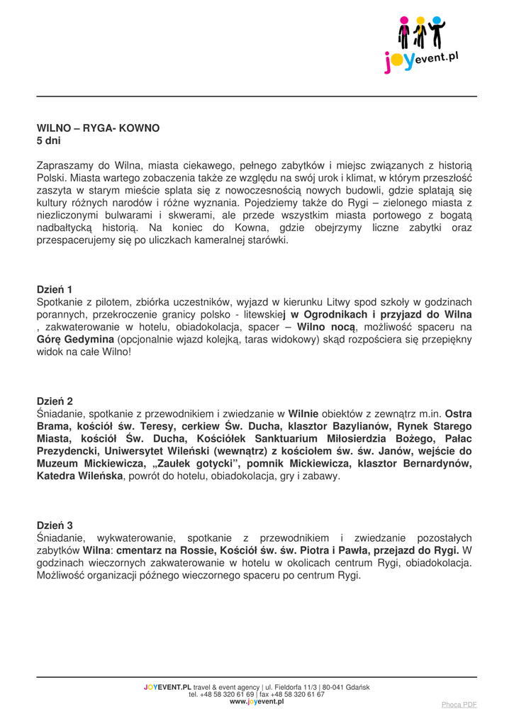 WILNO – RYGA- KOWNO 5 dni Zapraszamy do Wilna, miasta ciekawego, pełnego zabytków i miejsc związanych z historią Polski. Miasta wartego zobaczenia także ze względu na swój urok i klimat, w którym przeszłość zaszyta w starym mieście splata się z nowoczesnością nowych budowli, gdzie splatają się kultury różnych narodów i różne wyznania. Pojedziemy także do Rygi – zielonego miasta z niezliczonymi bulwarami i skwerami, ale przede wszystkim miasta portowego z bogatą nadbałtycką historią. Na koniec do Kowna, gdzie obejrzymy liczne zabytki oraz przespacerujemy się po uliczkach kameralnej starówki. Dzień 1 Spotkanie z pilotem, zbiórka uczestników, wyjazd w kierunku Litwy spod szkoły w godzinach porannych, przekroczenie granicy polsko - litewskiej w Ogrodnikach i przyjazd do Wilna , zakwaterowanie w hotelu, obiadokolacja, spacer – Wilno nocą, możliwość spaceru na Górę Gedymina (opcjonalnie wjazd kolejką, taras widokowy) skąd rozpościera się przepiękny widok na całe Wilno! Dzień 2 Śniadanie, spotkanie z przewodnikiem i zwiedzanie w Wilnie obiektów z zewnątrz m.in. Ostra Brama, kościół św. Teresy, cerkiew Św. Ducha, klasztor Bazylianów, Rynek Starego Miasta, kościół Św. Ducha, Kościółek Sanktuarium Miłosierdzia Bożego, Pałac Prezydencki, Uniwersytet Wileński (wewnątrz) z kościołem św. św. Janów, wejście do Muzeum Mickiewicza, „Zaułek gotycki”, pomnik Mickiewicza, klasztor Bernardynów, Katedra Wileńska, powrót do hotelu, obiadokolacja, gry i zabawy. Dzień 3 Śniadanie, wykwaterowanie, spotkanie z przewodnikiem i zwiedzanie pozostałych zabytków Wilna: cmentarz na Rossie, Kościół św. św. Piotra i Pawła, przejazd do Rygi. W godzinach wieczornych zakwaterowanie w hotelu w okolicach centrum Rygi, obiadokolacja. Możliwość organizacji późnego wieczornego spaceru po centrum Rygi. JOYEVENT.PL travel & event agency | ul. Fieldorfa 11/3 | 80-041 Gdańsk tel. +48 58 320 61 69 | fax +48 58 320 61 67 www.joyevent.pl Phoca PDF Dzień 4 Śniadanie, spotkanie z przewodnikiem i zwiedzanie Rygi z przewodnikiem m.in.: Stare Miasto, Dom Bractwa Czarnogłowych, ratusz, kościół św. Jakuba, kościół św. Piotra, budynek parlamentu, zespół średniowiecznych kamieniczek tzw. Trzej Bracia, Mała i Wielka Gildia Kupiecka, katedra luterańska. Wieczorem obiadokolacja w hotelu i nocleg. Dzień 5 Wczesnym rankiem, śniadanie, wykwaterowanie i wyjazd w stronę Polski. Po drodze przystanek w Kownie - zwiedzanie m. in. ruin zamku, obiad i dalsza droga do Polski. Przyjazd pod szkołę w późnych godzinach wieczornych. Cena: od 803 PLN (przy grupie min. 45 os.) Cena zawiera: zakwaterowanie w obiekcie w Wilnie lub okolicach, pokoje 3-5 osobowe, łazienki na korytarzu (WC, umywalka, prysznic), wyżywienie zgodne z programem, przejazd autokarem klasy turystycznej z dwoma kierowcami, opieka i pomoc pilota, usługi przewodnickie, ubezpieczenie KL i NNW za granicą, podatek VAT. Bilety wstępu do zwiedzanych obiektów płatne dodatkowo – ok.40 zł/os. UWAGA! Istnieje możliwość wzbogacenia programu o: - wjazd na wieżę telewizyjną w Wilnie - Muzeum Diabłów w Kownie JOYEVENT.PL travel & event agency | ul. Fieldorfa 11/3 | 80-041 Gdańsk tel. +48 58 320 61 69 | fax +48 58 320 61 67 www.joyevent.pl Phoca PDF - Akropolio Ledas – lodowisko w centrum handlowym. - poszerzenie zwiedzania trasy Uniwersytetu Wileńskiego - Pałac Wielkich Książąt Litewskich - wstęp do podziemi katedry wileńskiej - Muzeum Więzienia KGB w Wilnie - Muzeum Dziedzictwa Kościelnego w byłym kościele św. Michała w Wilnie - wizytę w Aquaparku Vichy - wizytę w Parku Europy (okolice Wilna) - wizytę w Geograficznym Centrum Europy pod Wilnem O szczegóły zapytaj w biurze! Program imprezy jest ramowy, kolejność zwiedzania może ulec zmianie. Planujesz zorganizować klasową wycieczkę „z klasą”? Szukasz transportu, przewodnika, pilota, programu wycieczki? Nasze biuro podróży z przyjemnością Ci w tym pomoże. Joytrip.pl to organizator wycieczek szkolnych nastawiony przede wszystkim na satysfakcję klientów. W ramach turystyki szkolnej oferujemy autorskie programy wyjazdów szkolnych, zielonych szkół, biwaków i wycieczek krajoznawczych. Najchętniej wybierane przez naszych klientów programy i regiony to: Kraków, Warszawa, Lwów, Praga, Łeba, Zakopane, Poznań, Mazury, Pomorze, Bieszczady, Tatry, Szlak Piastowski, Pomorze. Podróżujemy zawsze bezpiecznie autokarem, busem lub pociągiem. Każda z naszych wycieczek daje możliwość aktywnego wypoczynku, naturalnego poszerzenia wiedzy uczniów i ich integracji przez zabawę, której tak często brakuje w dobie intensywnej komputeryzacji. JOYEVENT.PL travel & event agency | ul. Fieldorfa 11/3 | 80-041 Gdańsk tel. +48 58 320 61 69 | fax +48 58 320 61 67 www.joyevent.pl Phoca PDF KRESOWY EXSPRESS LITWA I RYGA 5dni WILNO – RYGA- KOWNO Dla naszych młodych uczestników Litwa jest szczególnie ważna ze względów edukacyjnych. To kraj Adama Mickiewicza, który opisuje w swoich dziełach będących lekturą szkolną. Zapraszamy do Wilna, miasta ciekawego, pełnego zabytków i miejsc związanych z historią Polski. Miasta wartego zobaczenia także ze względu na swój urok i klimat, w którym przeszłość zaszyta w starym mieście splata się z nowoczesnością nowych budowli, gdzie splatają się kultury różnych narodów i różne wyznania. Pojedziemy także do Rygi – zielonego miasta z niezliczonymi bulwarami i skwerami, ale przede wszystkim miasta portowego z bogatą nadbałtycką historią. Na koniec do Kowna, gdzie obejrzymy liczne zabytki oraz przespacerujemy się po uliczkach kameralnej starówki. Dzień 1 Spotkanie z pilotem, zbiórka uczestników, wyjazd w kierunku Litwy spod szkoły w godzinach porannych, przekroczenie granicy polsko - litewskiej w Ogrodnikach i przyjazd do Wilna, zakwaterowanie w hotelu, obiadokolacja, spacer – Wilno nocą możliwość spaceru na Górę 