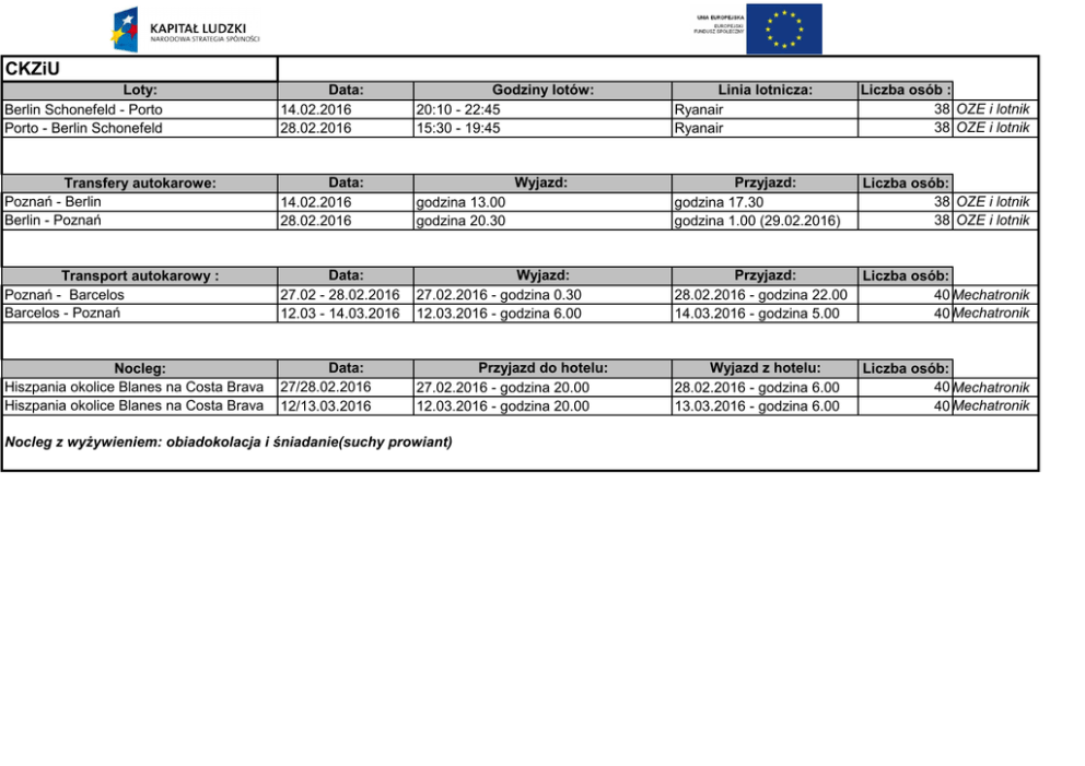 CKZiU Loty: Berlin Schonefeld - Porto Porto - Berlin Schonefeld Data: 14.02.2016 28.02.2016 Transfery autokarowe: Poznań - Berlin Berlin - Poznań Data: 14.02.2016 28.02.2016 Transport autokarowy : Poznań - Barcelos Barcelos - Poznań Nocleg: Hiszpania okolice Blanes na Costa Brava Hiszpania okolice Blanes na Costa Brava Godziny lotów: 20:10 - 22:45 15:30 - 19:45 Linia lotnicza: Ryanair Ryanair Liczba osób : 38 OZE i lotnik 38 OZE i lotnik godzina 13.00 godzina 20.30 Przyjazd: godzina 17.30 godzina 1.00 (29.02.2016) Liczba osób: 38 OZE i lotnik 38 OZE i lotnik Data: 27.02 - 28.02.2016 12.03 - 14.03.2016 Wyjazd: 27.02.2016 - godzina 0.30 12.03.2016 - godzina 6.00 Przyjazd: 28.02.2016 - godzina 22.00 14.03.2016 - godzina 5.00 Liczba osób: 40 Mechatronik 40 Mechatronik Data: 27/28.02.2016 12/13.03.2016 Przyjazd do hotelu: 27.02.2016 - godzina 20.00 12.03.2016 - godzina 20.00 Wyjazd z hotelu: 28.02.2016 - godzina 6.00 13.03.2016 - godzina 6.00 Liczba osób: 40 Mechatronik 40 Mechatronik Wyjazd: Nocleg z wyŜywieniem: obiadokolacja i śniadanie(suchy prowiant)