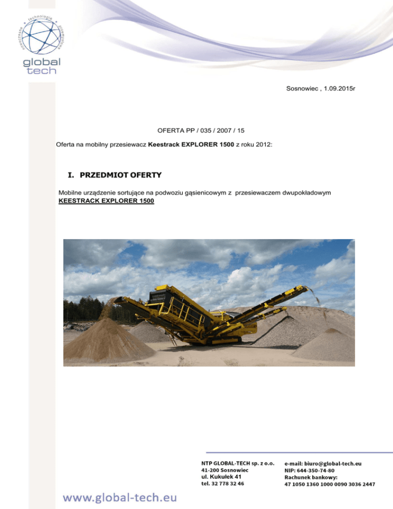 Sosnowiec , 1.09.2015r OFERTA PP / 035 / 2007 / 15 Oferta na mobilny przesiewacz Keestrack EXPLORER 1500 z roku 2012: I. PRZEDMIOT OFERTY Mobilne urządzenie sortujące na podwoziu gąsienicowym z przesiewaczem dwupokładowym KEESTRACK EXPLORER 1500 II. ZESTAWIENIE PODSTAWOWYCH WŁAŚCIWOŚCI MASZYNY KEESTRACK EXPLORER 1500 Doskonały dostęp przy wymianie sit ; Nie wymaga dodatkowych konstrukcji wsporczych ; Kompaktowe wymiary transportowe ; Oszczędność zużycia paliwa w stosunku do konkurencji o 25% ( wykorzystanie hydrauliki typu Loadsense – zmniejszenie zużycie paliwa – oszczędność do 6.500,00 Euro/rok ) ; Pomosty obsługowe po obu stronach przesiewacza ; Niska krawędź zasypu ; Udowodniona niezawodność ; Szybkie przygotowanie maszyny do pracy . Przesiewacz EXPLORER 1500 został zaprojektowany dla maksymalnej sprawności przesiewania dzięki zastosowaniu pojemnego kosza zasypowego , możliwości zastosowaniu różnych mediów przesiewających oraz szerokiemu przenośnikowi taśmowemu. Jest to idealna maszyna do przesiewania piasku, żwiru , węgla oraz dla kamieniołomów np. do produkcji grysów. Kosz zasypowy może być wyposażony w ruszt dla nad gabarytów. Ściana kosza wykonane są ze stali HARDOX . Kosz może być zasypany przez przenośnik taśmowy, kruszarkę , koparkę lub ładowarkę kołową . Szeroka taśma podająca na przesiewacz w porównaniu do konkurencji. Przesiewacz może być zabudowany sitami stalowymi plecionymi oraz sitami harfowymi dla drobnych frakcji np. grysy, żwir, piasek itp. Dostępne są również sita gumowe na górny pokład. Śruby mocujące sita zabezpieczone przed ścieraniem . Brak możliwości zsypu materiału po bokach przesiewacza dzięki zastosowaniu ochrony burt. Sita napinane wzdłużnie co skraca czas ich wymiany . Istnieje również możliwość podniesienia skrzyni przesiewacza dla lepszego dostępu serwisowego oraz przy wymianie sit. Skrzynia przesiewacza dostępna w wersji dwu i trzy pokładowej. Przenośniki taśmowe podparte stalowymi rolkami oraz wyposażone w boczne rolki prowadzące. Przenośniki składane hydraulicznie w bardzo kompaktowy sposób dla zmniejszenia wymiarów transportowych. III. ZESTAWIENIE DANYCH TECHNICZNYCH: 1. Podawany materiał: Kamień naturalny, węgiel, kruszywo, żwir , ziemię , recykling, kompost . Maksymalny wymiar jednostkowy podawanego materiału – 150-200 mm po wstępnym odsiewie na kracie zasypowej , możliwość regulacji kraty zasypowej . Układ rzeszota i uszczelnienie zabezpiecza przed przesypywaniem się materiału na konstrukcję urządzenia. 2. Maksymalna wielkość nadawy: Do 400 t/h w zależności od rodzaju materiału przesiewanego . 3. Wymiary transportowe Długość 13 593 mm Szerokość 2 550 mm Wysokość 2 800 mm Waga 24 t 4. Wymiary podczas pracy Długość 13 125 mm Szerokość 14 560 mm Wysokość 3 433 mm IV. ZESTAWIENIE PODSTAWOWYCH PODZESPOŁÓW 1. Kosz zasypowy Pojemność: 7,7 m³; Długość: 4500 mm ; Wysokość zasypu kosza ( regulowana ): 1700 mm - 3600 mm ; Wyłożenie stalą HARDOX i ST 52-3 ( stale trudnościeralne ) ; Przenośnik taśmowy w koszu zasypowym o szerokości: 1200 mm i długości 3500 mm ; Rodzaj taśmy: gumowa, trój przekładkowa , trudnościeralna ; Napęd: hydrauliczny o mocy 7,5 kW ; Zmienna prędkość taśmy: 0 ÷ 6,1 m/min ; Hydrauliczna regulacja kąta pochylenia kraty ; 2. Przenośnik taśmowy główny – odbierający z kosza zasypowego i podający do przesiewacza Rodzaj : taśma gumowa , trzy przekładkowa , trudnościeralna ; Napęd : hydrauliczny o mocy 7,5 kW ; Szerokość taśmy : 1200 mm ; Długość przenośnika : 6750 mm ; 3. Przesiewacz dwupokładowy o ruchu kołowym Wymiary pokładów: - pokład górny: 3600 mm długość x 1500 mm szerokość, - pokład dolny: 3600 mm długość x 1500 mm szerokość. Sortowanie materiału na trzy frakcje ; Przesiewacz podparty na wzmocnionych zespołach łożyskowych ; Napęd : hydrauliczny 11 kW ; 2 Powierzchnia przesiewania : 5,4 m ; 4. Przenośnik taśmowy boczny frakcji drobnej Odległość między osiami bębnów 8500 mm ; Szerokość taśmy przenośnika bocznego 650 mm ; Wysokość zrzutowa 4100 mm ; Taśma typu chevron, taśma typu : EP 315/3 4+2 , dwuprzekładkowa ; Napęd : hydrauliczny o mocy 15 kW ; Hydraulicznie składany na czas transportu ; 5. Przenośnik taśmowy boczny frakcji drugiej Odległość między osiami bębnów 8500 mm ; Szerokość taśmy przenośnika bocznego 650 mm ; Wysokość zrzutowa 4100 mm ; Taśma typu chevron, taśma typu : EP 315/3 4+2 , dwuprzekładkowa ; Hydraulicznie składany na czas transportu ; Napęd : hydrauliczny o mocy 7.5 kW ; 6. Przenośnik taśmowy ogonowy Odległość między osiami bębnów 8600 mm ; Szerokość taśmy przenośnika ogonowego 1200 mm ; Wysokość zrzutowa 4000 mm ; Taśma typu chevron, taśma typu : EP 315/3 4+2 , trudnościeralna ; Składany na czas transportu ; Napęd: hydrauliczny o mocy 11 kW ; 7. Podwozie gąsienicowe Hydrauliczny napęd gąsienic ; Wymiary gąsienic : dł. x szer. – 3300 x 2500 [ mm x mm ] ; Szerokość gąsienic : 400 [ mm ] ; Prędkość jazdy : max 2,5 [ km / h ] ; Pokonywanie wzniesień o max kącie : 22° ; Sterowanie jazdą za pomocą pilota przewodowego ; Wzmocnione podwozie gąsienicowe typu HD , przykręcane moduły podwozia ; 8. Napęd spalinowo-hydrauliczny Silnik diesla DEUTZ TCD2012 102,6 KM / 74,9 kW ; Zbiornik paliwa : 365 litrów ( stalowy ) ; Max moment : 390 Nm przy 1500 obr./min ; Hydraulika Sauer Danfoss i David Brown ; Łatwy dostęp do komory silnikowej ; Możliwość awaryjnego zatrzymania maszyny – 4 punkty STOP ; 9. Elektryczna skrzynka sterownicza Ze zdalnym sterowaniem kraty zasypowej OPCJA : - rzeszoto z trzema pokładami ; - wyłożenie kosza zasypowego blachą HARDOX ; - pilot zdalnego sterowania ( obsługuje gąsienice oraz kratę na zasypie ) ; - pompa tankowania paliwa 80l/min ; - dodatkowe oświetlenie na maszcie ; - system przeciw zapychaniu oczek sita ( An