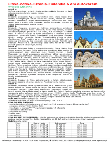 Litwa-Łotwa-Estonia-Finlandia 6 dni autokarem Wycieczka autokarowa DZIEŃ 1: Zbiórka uczestników i wyjazd z kraju według rozkładu. Przejazd do Rygi, zakwaterowanie w hotelu, kolacja, nocleg. DZIEŃ 2: Śniadanie. Zwiedzanie Rygi z przewodnikiem m.in.: stare miasto, Dom Bractwa Czarnogłowych, ratusz, kościół św. Jakuba, kościół św. Piotra, budynek Parlamentu, zespół średniowiecznych kamieniczek tzw. Trzej Bracia, Mała i Wielka Gildia Kupiecka, katedra luterańska. Przejazd do Tallina. Zakwaterowanie, kolacja, nocleg. DZIEŃ 3: Śniadanie. Przeprawa promem do Helsinek, panoramiczne zwiedzenia historycznego centrum miasta. Znaleźć tu można Plac Senacki, otoczony neoklasycystycznymi gmachami z XIX wieku, m.in uniwersytet i siedziba rządu. W pobliżu znajduje się rynek (Kauppatori) z ratuszem, pałacem prezydenta i gmachem soboru Uspieńskiego. Inne nietypowe i ciekawe obiekty: katedra luterańska, kościół Temppeliaukkio wykuty w skale, „Sanktuarium Ciszy” znajduje się w centrum miasta i charakteryzuje się nietypową architekturą, daje wspaniałe poczucie spokoju. Pomniki: Jana Sibeliusa i Aleksandra II. Obiadokolacja. Czas wolny. Powrót do Tallina w późnych godzinach wieczornych, nocleg. DZIEŃ 4: Śniadanie. Zwiedzanie Tallina z przewodnikiem m.in.: Górne i Dolne Stare Miasto, wzgórze Toompea, Sobór Aleksandra Newskiego, kilka spośród 20 średniowiecznych baszt obronnych m.in.: Wysoki Herman i Gruba Małgorzata, na której umieszczono pamiątkową tablicę upamiętniająca brawurową akcję ORP Orzeł, 2 średniowieczne ulice – Długa i Krótka Noga, ratusz miejski z 1404 roku, apteka z 1422 roku, Dom Wielkiej Gildii, Dom Bractwa Czarnogłowych, a także dzielnica Pirita (miejsce regat olimpijskich) i Park Święta Pieśni. Wjazd na wieżę telewizyjną, gdzie można nagrać i wysłać swoje powitanie dla rodziny i przyjaciół. Przejazd do Pałacu Kadriorg. To bez wątpienia jeden z najpiękniejszych barokowych zabytków Europy. W murach pałacu gościły takie znane osobistości jak car Mikołaj I oraz caryce Katarzyna i Elżbieta. Służył przez długi czas rosyjskim władcom jako letnia rezydencja. Nad budową pałacu zleconą przez cara Piotra I czuwał włoski mistrz architektów, Niccolo Michetti. Dodatkową atrakcją są przepiękne, zadbane ogrodowe labirynty wokół rezydencji. Powrót do hotelu, kolacja i nocleg. DZIEŃ 5: Śniadanie. Przejazd do Wilna, zakwaterowanie w hotelu, obiadokolacja. Wieczorem spacer z pilotem po starówce. Powrót do hotelu, nocleg. DZIEŃ 6: Śniadanie. Zwiedzania Wilna z przewodnikiem, m.in.: stare miasto (Ostra Brama, kościół św. Teresy, sobór św. Ducha, Plac Ratuszowy, ratusz, Plac Katedralny, budynek Uniwersytetu Wileńskiego (zewnątrz), kościół św. Anny i pomnik Adama Mickiewicza), a także kościół św. Piotra i Pawła na Antokolu, cmentarz na Rossie , gdzie spoczywają polscy żołnierze polegli podczas wojny 1920-21, matka Józefa Piłsudskiego oraz jego serce. Po południu wyjazd w kierunku granicy. Przyjazd do Polski w godzinach wieczornych, powrót do poszczególnych miejscowości. Program imprezy jest ramowy, kolejność zwiedzania może ulec zmianie. DOPŁATY: Dopłata do pokoju 1-os.: 400 zł Zniżka dla dziecka do 12 lat na dostawce w pokoju 2 os.: 100 zł CENA IMPREZY OBEJMUJE: - przejazd autokarem (klimatyzacja, dvd, barek , wc) lub wygodnym busem (klimatyzacja, dvd) - przeprawę promem Tallin-Helsinki-Tallin - 5 noclegów w hotelach**/*** w pokojach 2 osobowych z łazienką - 5 śniadań i 5 obiadokolacji - program turystyczny - opiekę pilota - ubezpieczenie CENA IMPREZY NIE OBEJMUJE: - biletów wstępu do zwiedzanych obiektów, kosztów lokalnych przewodników , zestawu słuchawkowego Tour-Guide. Koszt pakietu ok. 50 EUR płatny obligatoryjnie pilotowi wycieczki. Na jbliższe te rminy Pobyt 6 dni 6 dni 6 dni 6 dni 6 dni 6 dni 6 dni Data wyjazdu 27.04.14 - 02.05.14 29.06.14 - 04.07.14 06.07.14 - 11.07.14 27.07.14 - 01.08.14 10.08.14 - 15.08.14 07.09.14 - 12.09.14 14.09.14 - 19.09.14 Kod wycieczki 05-712-KN 07-724-KN 07-725-KN 08-716-KN 08-717-KN 09-713-KN 09-714-KN Cena 1529,- PLN 1529,- PLN 1529,- PLN 1529,- PLN 1529,- PLN 1529,- PLN 1529,- PLN Informacje i rezerwacje: ALPEN TOUR Biuro Turystyczne, 22/371-59-60, 691-032-018, [email protected], www.alpentour.pl Informacje i rezerwacje: ALPEN TOUR Biuro Turystyczne, 22/371-59-60, 691-032-018, [email protected], www.alpentour.pl