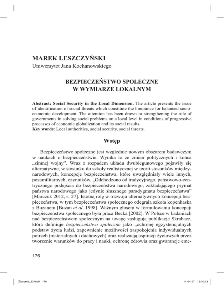 MAREK LESZCZYŃSKI Uniwersytet Jana Kochanowskiego BEZPIECZEŃSTWO SPOŁECZNE W WYMIARZE LOKALNYM Abstract: Social Security in the Local Dimension. The article presents the issue of identification of social threats which constitute the hindrance for balanced socioeconomic development. The attention has been drawn to strengthening the role of governments in solving social problems on a local level in conditions of progressive processes of economic globalization and its social results. Key words: Local authorities, social security, social threats. Wstęp Bezpieczeństwo społeczne jest względnie nowym obszarem badawczym w naukach o bezpieczeństwie. Wynika to ze zmian politycznych i końca „zimnej wojny”. Wraz z rozpadem układu dwubiegunowego pojawiły się alternatywne, w stosunku do szkoły realistycznej w teorii stosunków międzynarodowych, koncepcje bezpieczeństwa, które uwzględniały wiele innych, pozamilitarnych, czynników. „Odchodzono od tradycyjnego, państwowo-centrycznego podejścia do bezpieczeństwa narodowego, zakładającego prymat państwa narodowego jako jedynie słusznego paradygmatu bezpieczeństwa” [Marczuk 2012, s. 27]. Istotną rolę w rozwoju alternatywnych koncepcji bezpieczeństwa, w tym bezpieczeństwa społecznego odegrała szkoła kopenhaska z Buzanem [Buzan et al. 1998]. Ważnym głosem w formułowaniu koncepcji bezpieczeństwa społecznego była praca Becka [2002]. W Polsce w badaniach nad bezpieczeństwem społecznym na uwagę zasługują publikacje Skrabacz, która definiuje bezpieczeństwo społeczne jako „ochronę egzystencjalnych podstaw życia ludzi, zapewnienie możliwości zaspokojenia indywidualnych potrzeb (materialnych i duchowych) oraz realizacją aspiracji życiowych przez tworzenie warunków do pracy i nauki, ochronę zdrowia oraz gwarancje eme176 Zlecenie_23.indb 176 14-04-17 12:10:13 rytalne” [Skrabacz 2012, s. 53]. Istotne znaczenie ma uwaga o konieczności wzmocnienia odpowiedzialności obywateli za los własny i los rodzin, ponieważ walka z marginalizacją i nadrzędna rola państwa w tym procesie nie może kształtować postaw znanych jako wyuczony syndrom bezradności. Polega on na stopniowym zatracaniu umiejętności radzenia sobie w trudnych sytuacjach życiowych i sięganie po pomoc instytucji pomocy społecznej w sytuacjach do tego nieuprawnionych [Leszczyński 2011, s. 58]. Istotnym elementem bezpieczeństwa społecznego jest tworzenie warunków rozwojowych, przez możliwość aktywnego uczestniczenia w edukacji, kulturze, szeroko rozumianym życiu społecznym. Bezpieczeństwo społeczne odnosi się także do poczucia wspólnoty, tworzenia więzi społecznych opartych na zaufaniu. Możemy zatem powiedzieć, że bezpieczeństwo społeczne składa się z trzech komponentów (składowych): bezpieczeństwo socjalne (odnoszące się do minimalnych standardów socjalnych opisanych przez poziom minimalnych płac, dochodów, transferów – gwarantowanych w systemie prawa i wynikających z istoty demokratycznego państwa), bezpieczeństwo wspólnotowe (odnoszące się do obszaru doznań i emocji, mające charakter psychofizyczny, subiektywne doznanie jednostki bycia częścią większej wspólnoty, społeczeństwa. Poziom tego rodzaju bezpieczeństwa zależy od poziomu kapitału społecznego) oraz bezpieczeństwo rozwojowe (odnoszące się do ogólnych warunków rozwoju obywatela w danym państwie, opisane przez szanse i możliwości rozwojowe, współcześnie zależy ono głównie od poziomu kapitału ludzkiego, warunków instytucjonalnych, poziomu decentralizacji państwa i upodmiotowienia obywatela w systemie prawnym) [ibidem]. Badania nad bezpieczeństwem społecznym powinny być prowadzone w sposób wieloaspektowy na różnych szczeblach organizacji państwa. Nasilające się procesy globalizacyjne i redefinicja funkcji państwa narodowego wymaga stałego dostosowywania struktury organizacyjnej państwa do zadań i potrzeb społecznych. Obserwowane zjawiska polaryzacji rozwoju ekonomicznego i społecznego skłaniają do refleksji, że współczesne państwo ma nie mniej zadań do zrealizowania w zakresie kierunkowania rozwoju i dystrybucji dóbr publicznych niż miało w fazie szczytowego rozwoju państwa dobrobytu. Inny jest jednak charakter tych działań i w znacznie większym stopniu realizacja zadań ma charakter wielokierunkowy i zdecentralizowany. Efektywnej realizacji zadań służy rozwijanie idei samorządowej wraz z właściwie zaprojektowaną strukturą władz publicznych w terenie. Celem opracowania jest wskazanie na konieczność wielowymiarowego podejścia do rozwiązywania problemów społecznych, w tym zwłaszcza podkreślenie roli władz lokalnych w tym zakresie. W ramach nauk o bezpieczeństwie jedną z istotnych, badanych 177 Zlecenie_23.indb 177 14-04-17 12:10:13 relacji jest relacja państwo-obywatel. Dotyczy to także relacji samorząd-obywatel, ponieważ to właśnie ta zdecentralizowana forma państwa w sposób najbardziej istotny określa zaspokojenie społecznych potrzeb obywateli. Wreszcie można powiedzieć, że warunki zamieszkania, które kształtują subiektywne odczucie wysokiej lub niskiej jakości życia obywateli także w dużym stopniu zależą od działań władz publicznych. Działania władz publicznych w istotny sposób mogą wpływać na poprawę bezpieczeństwa społecznego. Jako główne obszary oddziaływania władz lokalnych (miejskich) można wskazać: politykę oświatową, w tym zwłaszcza projektowanie sieci placówek edukacyjnych różnych szczebli, politykę zdrowotną na podstawie diagnozy potrzeb zdrowotnych mieszkańców miasta, politykę mieszkaniową zwłaszcza adresowaną do mieszkańców ubogich mieszkających w lokalach substandardowych, kształtowanie bezpiecznej przestrzeni publicznej integrującej mieszkańców, kształtowanie ładu i porządku publicznego. Spoiwem wszystkich działań powinna być walka z wykluczeniem, marginalizacją i dezintegracją spo