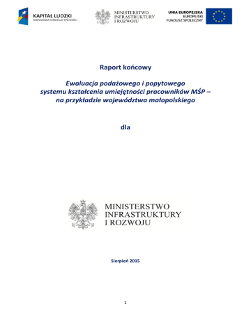 Raport końcowy Ewaluacja podażowego i popytowego systemu kształcenia umiejętności pracowników MŚP – na przykładzie województwa małopolskiego dla Sierpień 2015 1 Opracowanie: konsorcjum firm Bluehill Sp. z o.o. oraz Quality Watch Sp. z o.o. 2 Spis treści Nota metodologiczna ................................................................................................................... 5 I. Streszczenie ...................................................................................................................... 7 II. Summary ........................................................................................................................ 11 III. Koncepcja badawcza ....................................................................................................... 14 3.1 Cel i zakres badania ..........................................................................................................14 3.2 Kryteria ewaluacyjne ........................................................................................................14 3.3 Pytania badawcze ............................................................................................................15 3.4 Charakterystyka systemu podażowego i pilotażowego systemu popytowego w województwie małopolskim ...........................................................................................................................17 3.4.1 System podażowy ............................................................................................................. 17 3.4.2 Pilotażowy system popytowy ........................................................................................... 18 IV. Metodologia badania ...................................................................................................... 21 Analiza desk research ............................................................................................................... 21 Porównawcza analiza finansowa .............................................................................................. 23 Analiza metodologii wyliczenia wartości dofinansowania szkoleń w ramach PFK .................. 26 Panel ekspercki ......................................................................................................................... 26 Wywiady kwestionariuszowe wspomagane komputerowo (CATI) .......................................... 27 Indywidualne wywiady pogłębione (IDI) .................................................................................. 28 Zogniskowane wywiady grupowe (FGI) .................................................................................... 30 Metoda delficka ........................................................................................................................ 30 4.1 4.2 4.3 4.4 4.5 4.6 4.7 4.8 V. Wyniki badania w kontekście pytań ewaluacyjnych.......................................................... 32 5.1 Ocena funkcjonowania pilotażu systemu popytowego w porównaniu z systemem podażowym w kontekście wymogów wpisanych w obydwa systemy .............................................................32 5.1.1. Podsumowanie .................................................................................................................. 32 5.1.2. Prezentacja wyników badań ............................................................................................. 33 5.2 Ocena gotowości przedsiębiorstw do działań na rzecz podnoszenia kwalifikacji w pilotażu systemu popytowego i podażowym – który z systemów w większym stopniu zachęca pracodawców do zwiększania liczby szkoleń?............................................................................46 5.2.1 Podsumowanie ................................................................................................................. 46 5.2.2 Prezentacja wyników badań ......................................................................................47 5.3 Ocena dopasowania pilotażu systemu popytowego i systemu podażowego do potrzeb przedsiębiorców......................................................................................................................55 5.3.1 Podsumowanie ................................................................................................................. 55 5.3.2 Prezentacja wyników badania .......................................................................................... 57 5.4 Jaki wpływ na rynek usług szkoleniowych będzie mieć wprowadzenie wyłącznie systemu popytowego finansowania szkoleń dla przedsiębiorców z EFS? ..................................................72 5.4.1 Podsumowanie ................................................................................................................. 72 5.4.2 Prezentacja wyników badania .......................................................................................... 73 3 5.5 Czy Małopolskie Standardy Usług Edukacyjnych (MSUES) mogą być zaadoptowane do systemu Rejestru Usług Rozwojowych RUR? .............................................................................77 5.5.1 Podsumowanie ................................................................................................................. 77 5.5.2 Prezentacja wyników badania .......................................................................................... 78 5.6 Ocena pilotażu systemu popytowego w kontekście jego wprowadzenia w skali kraju – propozycje zmian ....................................................................................................................82 5.6.1 Podsumowanie ................................................................................................................. 82 5.6.2 Prezentacja wyników badania .......................................................................................... 86 5.7 Pomiar efektywności systemu popytowego w kontekście jeg