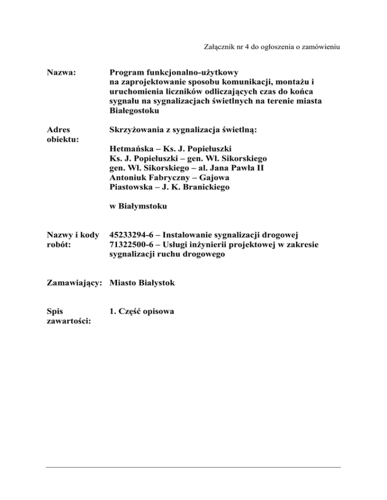 Załącznik nr 4 do ogłoszenia o zamówieniu Nazwa: Program funkcjonalno-użytkowy na zaprojektowanie sposobu komunikacji, montażu i uruchomienia liczników odliczających czas do końca sygnału na sygnalizacjach świetlnych na terenie miasta Białegostoku Adres obiektu: Skrzyżowania z sygnalizacja świetlną: Hetmańska – Ks. J. Popiełuszki Ks. J. Popiełuszki – gen. Wł. Sikorskiego gen. Wł. Sikorskiego – al. Jana Pawła II Antoniuk Fabryczny – Gajowa Piastowska – J. K. Branickiego w Białymstoku Nazwy i kody robót: 45233294-6 – Instalowanie sygnalizacji drogowej 71322500-6 – Usługi inżynierii projektowej w zakresie sygnalizacji ruchu drogowego Zamawiający: Miasto Białystok Spis zawartości: 1. Część opisowa Wytyczne realizacji dotyczące zaprojektowania sposobu komunikacji, montażu i uruchomienia liczników odliczających czas do końca sygnału na sygnalizacjach świetlnych na terenie miasta Białegostoku. 1.1 Opis ogólny Przedmiotem zamówienia jest zaprojektowanie sposobu komunikacji, montaż i uruchomienie liczników odliczających czas do końca sygnału na sygnalizacjach świetlnych. Liczniki mają zostać zainstalowane na 5 skrzyżowaniach na terenie miasta: 1) ul. Hetmańska – ul. ks. J. Popiełuszki, 2) ul. ks. J. Popiełuszki – ul. gen. Wł. Sikorskiego, 3) ul. gen. Wł. Sikorskiego – al. Jana Pawła II, 4) ul. Antoniuk Fabryczny – ul. Gajowa, 5) ul. Piastowska – ul. J. K. Branickiego, Liczniki mają zostać zainstalowane na każdym skrzyżowaniu na dwóch wlotach: 1) ul. Hetmańska – ul. Ks. J. Popiełuszki: wlot ul. Ks. J. Popiełuszki od tunelu oraz od ul. gen. Wł. Sikorskiego, 2) ul. ks. J. Popiełuszki – ul. gen. Wł. Sikorskiego: wlot ul. Ks. J. Popiełuszki od strony tunelu oraz wlot ul. gen. Wł. Sikorskiego, 3) ul. gen. Wł. Sikorskiego – al. Jana Pawła II: wlot al. Jana Pawła II od Warszawy oraz wlot al. Konstytucji 3-go Maja, 4) ul. Antoniuk Fabryczny – ul. Gajowa: oba wloty ul. Antoniuk Fabryczny, 5) ul. Piastowska – ul. J. K. Branickiego: wlot ul. Cz. Miłosza oraz wlot ul. J. K. Branickiego w stronę centrum. Liczniki maja zostać zainstalowane nad wlotami i wskazywać w sekundach pozostały czas do zmiany sygnału. Czas do końca sygnału zielonego w kolorze zielonym oraz do końca sygnału czerwonego Przedmiot zamówienia przewidziany jest do realizacji w systemie „zaprojektuj i zbuduj”. 1.1.1 Aktualne uwarunkowania Na skrzyżowaniach na których przewiduje się montaż liczników funkcjonują adaptacyjne sygnalizacje świetlne realizujące algorytmy sterowania obszarowego. Na skrzyżowaniach zainstalowane są sterowniki Siemens C900V. Podłączone są do Centrum Zarządzania Ruchem za pomocą sieci światłowodowej. Długość poszczególnych sygnałów jest zmienna, uzależniona od występującego natężenia ruchu. W związku z realizacją Systemu Zarządzania Ruchem w Białymstoku i zastosowanymi programami akomodacyjnymi na wszystkich skrzyżowaniach z sygnalizacją świetlną, nie dopuszcza się pogorszenia warunków i zastosowania programów stałoczasowych na ww. skrzyżowaniach. Nie dopuszcza się zmian programów sygnalizacji świetlnej. Kable sterownicze do lamp sygnalizacyjnych, elementów detekcji i innych urządzeń ułożone są w kanalizacji teletechnicznej. 1.1.2 Szczegółowe właściwości funkcjonalno-użytkowe Wymagania ogólne dotyczące liczników: 1. Liczniki nie mogą być niezgodne z obowiązującymi przepisami w zakresie sygnalizacji świetlnej, w szczególności z Rozporządzeniem Ministra Infrastruktury z dnia 3 lipca 2003 roku w sprawie szczegółowych warunków technicznych dla znaków i sygnałów drogowych oraz urządzeń bezpieczeństwa ruchu drogowego i warunków ich umieszczania na drogach, zamieszczonym w Dz. U. Nr 220, poz. 2181 z dnia 23 grudnia 2003 roku, z późniejszymi zmianami. 2. Liczniki muszą posiadać czytelne cyfry umożliwiające wyświetlenie czasu do końca sygnału czerwonego (w kolorze czerwonym) i do końca sygnału zielonego (w kolorze zielonym) 3. Liczniki mają zostać zainstalowane na masztach z wysięgnikami nad środkiem wlotów. 4. Liczniki będą odliczały czas do końca sygnału w sekundach wyświetlając stale aktualną jego wartość. 5. Ewentualne zmiany programów sygnalizacji wprowadzane przez Zamawiającego nie mogą powodować nieprawidłowego funkcjonowania liczników. 6. Dopuszcza się wyłączenie licznika na ostatnie kilka sekund przed zmianą sygnału. 7. W ramach zadania należy zaprojektować sposób komunikacji między licznikiem a sterownikiem, umożliwiający wyświetlenie prawdziwego czasu do końca sygnału, uwzględniając również adaptacyjny tryb pracy sygnalizacji. 8. Obudowy wyświetlacza muszą być w kolorze czarnym, odporne na warunki atmosferyczne. 9. Wyświetlane cyfry muszą być czytelne przy każdej pogodzie, również przy nisko operującym słońcu świecącym na wyświetlacz, wymaga się aby miał minimum IV klasę fantomową. 10. Zastosowane liczniki nie mogą wpłynąć na pogorszenie przepustowości skrzyżowania. 11. Wielkość cyfr musi spełniać wymagania dotyczące czytelności wyświetlacza w zakresie możliwości odczytania wartości z odległości 60 m. Wymagania dotyczące okablowania: 1. Do projektowanych urządzeń należy ułożyć oddzielne kable zapewniające właściwą pracę urządzenia. 2. W przypadku doprowadzenia sygnałów niskonapięciowych i zasilania 230V należy prowadzić je oddzielnymi kablami. Nie dopuszcza się łączenia w jednym kablu napięcia 230 V i niskiego np.: 12V Wymagania dotyczące prawdziwości wyświetlania informacji: 1. Zamawiający oczekuje liczników odliczających czas w sekundach do końca sygnału zielonego oraz czerwonego. 2. Wyświetlany czas nie może wprowadzać kierujących w błąd poprzez wyświetlenie jakiegokolwiek czasu większego od 1 s. przed zmianą sygnału tj. przed zapaleniem sygnału żółtego lub żółtego z czerwonym. 3. Weryfikacj