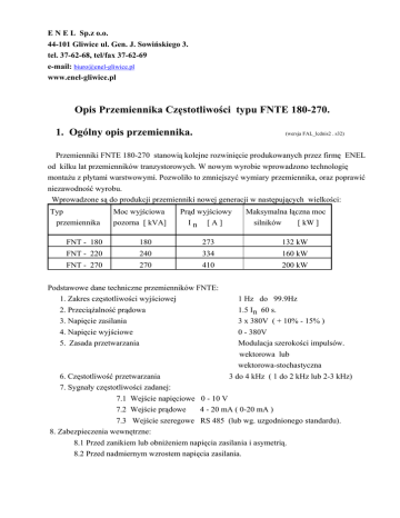 E N E L Sp.z o.o. 44-101 Gliwice ul. Gen. J. Sowińskiego 3. tel. 37-62-68, tel/fax 37-62-69 e-mail: [email protected] www.enel-gliwice.pl Opis Przemiennika Częstotliwości typu FNTE 180-270. 1. Ogólny opis przemiennika. (wersja FAL_lcdnis2 . s32) Przemienniki FNTE 180-270 stanowią kolejne rozwinięcie produkowanych przez firmę ENEL od kilku lat przemienników tranzystorowych. W nowym wyrobie wprowadzono technologię montażu z płytami warstwowymi. Pozwoliło to zmniejszyć wymiary przemiennika, oraz poprawić niezawodność wyrobu. Wprowadzone są do produkcji przemienniki nowej generacji w następujących wielkości: Typ przemiennika Moc wyjściowa pozorna [ kVA] Prąd wyjściowy In [A] Maksymalna łączna moc silników [ kW ] FNT - 180 180 273 132 kW FNT - 220 240 334 160 kW FNT - 270 270 410 200 kW Podstawowe dane techniczne przemienników FNTE: 1. Zakres częstotliwości wyjściowej 2. Przeciążalność prądowa 3. Napięcie zasilania 4. Napięcie wyjściowe 5. Zasada przetwarzania 1 Hz do 99.9Hz 1.5 In 60 s. 3 x 380V ( + 10% - 15% ) 0 - 380V Modulacja szerokości impulsów. wektorowa lub wektorowa-stochastyczna 3 do 4 kHz ( 1 do 2 kHz lub 2-3 kHz) 6. Częstotliwość przetwarzania 7. Sygnały częstotliwości zadanej: 7.1 Wejście napięciowe 0 - 10 V 7.2 Wejście prądowe 4 - 20 mA ( 0-20 mA ) 7.3 Wejście szeregowe RS 485 (lub wg. uzgodnionego standardu). 8. Zabezpieczenia wewnętrzne: 8.1 Przed zanikiem lub obniżeniem napięcia zasilania i asymetrią. 8.2 Przed nadmiernym wzrostem napięcia zasilania. 8.3 Przed zwarciem na zaciskach wyjściowych przemiennika. 8.4 Przed zwarciem doziemnym. 8.5 Przed zanikiem lub osłabieniem systemu wentylacji przemiennika. 8.6 Przed przeciążeniem silnika. 9. Sygnalizacja stanów pracy i awarii. 9.1 Sygnalizacja zasilania przemiennika. 9.2 Sygnalizacja gotowości do pracy (styk zwierny) 9.3 Sygnalizacja poprawnej pracy przemiennika ( styk zwierny ) 9.4 Sygnalizacja wyłączenia awaryjnego ( styk zwierny + informacja o przyczynie wyłączenia ). 9.5 Wyprowadzony sygnał prądowy proporcjonalny do częstotliwości wyjściowej przemiennika zaciski 11-3 listwy X2 (0 mA = 0 Hz 20 mA=Fmax) lub ( 4 - 20 mA ). 2. Podłączenie oraz sterowanie przemiennika. Sposób podłączenia obwodów głównych i sterujących do przemiennika pokazują rysunki FNTE 180-270/1 i 2. Podłączenie zasilania i wyjścia wykonać przewodami giętkimi gdyż do takich przewodów dostosowane są zaciski wejściowe i wyjściowe. 2.1 Układ załączania przemiennika. Przemiennik FNTE można sterować dwoma sposobami. 1. W układzie połączeń jak na rysunku FNTE 180-270 / 1 załączenie odłącznika Q1 powoduje zasilenie obwodów sterowania przemiennika ( zaciski 1L1-1L2 ). Włączona zostaje do pracy przetwornica zasilacza i uruchomiony system sterowania mikroprocesorowego. Zwarty zostaje styk gotowość. Do obwodu głównego przemiennika nie jest podane napięcie. Załączenie przemiennika do pracy następuje po podaniu napięcia na przekaźnik K2 znajdujący się na płycie zasilacza i obwodów wejściowych. Załączenie przekaźnika K2 powoduje załączenie stycznika głównego SG ( rys. FNTE 180-270 /1 ) i stycznika zwieracza K10. W przypadku braku innych podłączeń ( omówionych w dalszym ciągu opisu ) załączenie przekaźnika K2 powoduje że przemiennik znajduje się w stanie zatrzymania. Załączenie przekaźnika K2 następuje gdy: - zwarty zostanie zacisk 18 i 20 na listwie X2. w tym przypadku załączenie i wyłączenie przemiennika odbywa się jednym stykiem zewnętrznym. - zastosowane zostaną dwa przyciski zwierny ZAŁ i rozwierny WYŁ zgodnie ze schematem na rysunku FNTE 180-270 / 2. Zestyk podtrzymujący włączony jest pomiędzy zaciski 19 i 20 listwy X2. UWAGA Zaciski 1 do 20 listwy X2 w znacznej części przyłączone są do potencjału 0V i 12V zasilacza wewnętrznego przemiennika, dlatego niedozwolone jest przyłączanie styków sterujących podłączonych do potencjałów zewnętrznych. 2 Załączanie poprzez zwieranie zacisków 18 i 20 zaleca się w tym przypadku gdy przemiennik powinien się załączać samoczynnie po chwilowym zaniku napięcia zasilania. 2. Przemiennik można załączać również poprzez bezpośrednie podanie napięcia zasilania na zaciski wejściowe przemiennika ( L1,L2,L3,N). W tym przypadku załączanie stycznika podającego napięcie odbywa się poza przemiennikiem i wiele z opcji wykorzystywanych przy sterowaniu zgodnie z rys. FNTE 180-270 / 1 nie może być wykorzystanych. W tym przypadku można zewrzeć zaciski 18-20 i start przemiennika następuje automatycznie po podaniu napięcia na przemiennik, lub też przekaźnikiem K2 sterować dodatkowo załączaniem i wyłączaniem przemiennika. UWAGA: Należy połączyć zaciski L1 z 1L1 i L2 z 1L2 w celu podania napięcia na układ sterowania 2.2 Blokada technologiczna Uruchomienie przemiennika wymaga zwarcia zacisków 15 i 16. Jest to wejście pozwalające na zatrzymanie przemiennika ( nie wyłączenie ) po rozwarciu tych zacisków. Zatrzymanie to nie jest traktowane jako wyłączenie awaryjne. Po ponownym zwarciu zacisków 15 i 16 następuje uruchomienie przemiennika. 2.3 Układu hamowania elektrycznego. Układ hamowania elektrycznego jest w tej wersji przemiennika integralnie związany z pozostałymi podzespołami przemiennika. Wewnętrzny układ hamowania jest przystosowany do hamowania z mocą chwilową traconą na rezystorze zewnętrznym do 15 kW. Można zatem podłączyć rezystor zewnętrzny o wartości minimalnej 30 Ω. Zapewnia to poprawne hamowanie elektryczne wszystkich typowych napędów jak wentylator, dźwignica i inne. W przypadkach skrajnych ( np. napęd samotoków hutniczych ) gdzie wymagane są bardzo małe czasy hamowania i moc chwilowa oddawana do rezystora musi być większa od 15 kW konieczne jest stosowanie zewnętrznego układu hamowania elektrycznego. 2.4 Wybór kierunku obrotów. Wybór kierunku obrotów następuje poprzez zwarcie zacisków 6 i 7 d