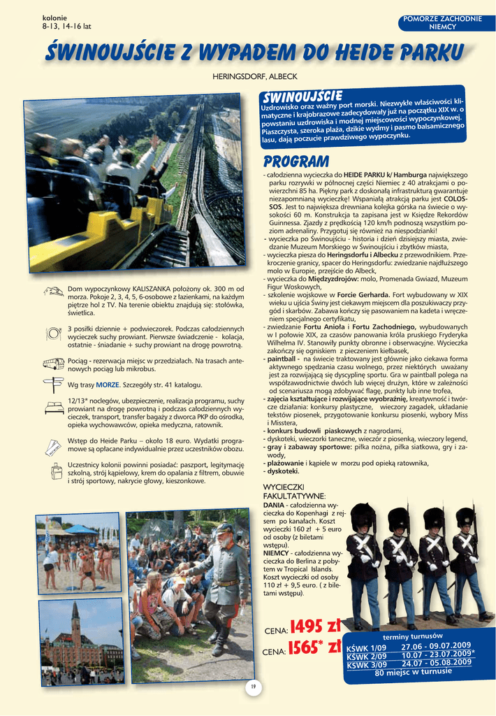 kolonie POMORZE ZACHODNIE NIEMCY 8-13, 14-16 lat ŚWINOUJŚCIE Z WYPADEM DO HEIDE PARKU HERINGSDORF, ALBECK ŚWINOUJŚCIE ski. Niezwykłe właściwości kliUzdrowisko oraz ważny port mor wały już na początku XIX w. o cydo zade owe matyczne i krajobraz scowości wypoczynkowej. miej powstaniu uzdrowiska i modnej my i pasmo balsamicznego wyd ie dzik a, plaż oka szer Piaszczysta, oczynku. wyp ego dziw lasu, dają poczucie praw PROGRAM - całodzienna wycieczka do HEIDE PARKU k/ Hamburga największego parku rozrywki w północnej części Niemiec z 40 atrakcjami o powierzchni 85 ha. Piękny park z doskonałą infrastrukturą gwarantuje niezapomnianą wycieczkę! Wspaniałą atrakcją parku jest COLOSSOS. Jest to największa drewniana kolejka górska na świecie o wysokości 60 m. Konstrukcja ta zapisana jest w Księdze Rekordów Guinnessa. Zjazdy z prędkością 120 km/h podnoszą wszystkim poziom adrenaliny. Przygotuj się również na niespodzianki! - wycieczka po Świnoujściu - historia i dzień dzisiejszy miasta, zwiedzanie Muzeum Morskiego w Świnoujściu i zbytków miasta, - wycieczka piesza do Heringsdorfu i Albecku z przewodnikiem. Przekroczenie granicy, spacer do Heringsdorfu: zwiedzanie najdłuższego molo w Europie, przejście do Albeck, - wycieczka do Międzyzdrojów: molo, Promenada Gwiazd, Muzeum Figur Woskowych, - szkolenie wojskowe w Forcie Gerharda. Fort wybudowany w XIX wieku u ujścia Świny jest ciekawym miejscem dla poszukiwaczy przygód i skarbów. Zabawa kończy się pasowaniem na kadeta i wręczeniem specjalnego certyfikatu, - zwiedzanie Fortu Anioła i Fortu Zachodniego, wybudowanych w I połowie XIX, za czasów panowania króla pruskiego Fryderyka Wilhelma IV. Stanowiły punkty obronne i obserwacyjne. Wycieczka zakończy się ogniskiem z pieczeniem kiełbasek, - paintball - na świecie traktowany jest głównie jako ciekawa forma aktywnego spędzania czasu wolnego, przez niektórych uważany jest za rozwijającą się dyscyplinę sportu. Gra w paintball polega na współzawodnictwie dwóch lub więcej drużyn, które w zależności od scenariusza mogą zdobywać flagę, punkty lub inne trofea, - zajęcia kształtujące i rozwijające wyobraźnię, kreatywność i twórcze działania: konkursy plastyczne, wieczory zagadek, układanie tekstów piosenek, przygotowanie konkursu piosenki, wybory Miss i Misstera, - konkurs budowli piaskowych z nagrodami, - dyskoteki, wieczorki taneczne, wieczór z piosenką, wieczory legend, - gray i zabaway sportowe: piłka nożna, piłka siatkowa, gry i zawody, - plażowanie i kąpiele w morzu pod opieką ratownika, - dyskoteki. Dom wypoczynkowy KALISZANKA położony ok. 300 m od morza. Pokoje 2, 3, 4, 5, 6-osobowe z łazienkami, na każdym piętrze hol z TV. Na terenie obiektu znajdują się: stołówka, świetlica. 3 posiłki dziennie + podwieczorek. Podczas całodziennych wycieczek suchy prowiant. Pierwsze świadczenie - kolacja, ostatnie - śniadanie + suchy prowiant na drogę powrotną. Pociąg - rezerwacja miejsc w przedziałach. Na trasach antenowych pociąg lub mikrobus. Wg trasy MORZE. Szczegóły str. 41 katalogu. 12/13* noclegów, ubezpieczenie, realizacja programu, suchy prowiant na drogę powrotną i podczas całodziennych wycieczek, transport, transfer bagaży z dworca PKP do ośrodka, opieka wychowawców, opieka medyczna, ratownik. Wstęp do Heide Parku – około 18 euro. Wydatki programowe są opłacane indywidualnie przez uczestników obozu. Uczestnicy kolonii powinni posiadać: paszport, legitymację szkolną, strój kąpielowy, krem do opalania z filtrem, obuwie i strój sportowy, nakrycie głowy, kieszonkowe. WYCIECZKI FAKULTATYWNE: DANIA - całodzienna wycieczka do Kopenhagi z rejsem po kanałach. Koszt wycieczki 160 zł + 5 euro od osoby (z biletami wstępu). NIEMCY - całodzienna wycieczka do Berlina z pobytem w Tropical Islands. Koszt wycieczki od osoby 110 zł + 9,5 euro. ( z biletami wstępu). 1495 zł * K 1/09 CENA: 1565 zł KŚW KŚWK 2/09 CENA: terminy turnusów 27.06 - 09.07.2009 10.07 - 23.07.2009* 24.07 - 05.08.2009 KSWK 3/09 80 miejsc w turnusie 19