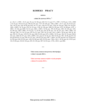 KODEKS PRACY ustawa z dnia 26 czerwca 1974 r.*) (j. t. Dz. U. z 1998 r. Nr 21, poz. 94, zm. Nr 106, poz. 668 i Nr 113, poz.717, z 1999 r. Nr 99, poz. 1152, z 2000 r. Nr 19, poz. 239, Nr 43, poz. 489, Nr 107, poz. 1127 i Nr 120, poz. 1268, z 2001 r. Nr 11, poz. 84, Nr 28, poz. 301 i Nr 52, poz. 538, Nr 99, poz.1075, Nr 111, poz. 1194, Nr 123, poz. 1354, Nr 128, poz. 1405 i Nr 154, poz. 1805, z 2002 r. Nr 74, poz. 676, Nr 135, poz. 1146, Nr 196, poz. 1660, Nr 199, poz. 1673, Nr 200 poz. 1679, z 2003 r. Nr 166, poz.1608 i Nr 213, poz. 2081, z 2004 r. Nr 96, poz.. 959, Nr 99, poz. 1001, Nr 120, poz. 1252, Nr 240, poz. 2407 z 2005 r. Nr 10, poz. 71, Nr 68, poz. 610, Nr 86, poz. 732, Nr 167, poz. 1398, z 2006 r. Nr 104, poz. 708 i 711, Nr 133, poz. 935, Nr 217, poz. 1587, Nr 221, poz. 1615, z 2007 r. Nr 64, poz. 426, Nr 89, poz. 589, Nr 176, poz. 1239, Nr 181, poz.1288, Nr 225, poz.1672, z 2008 r. Nr 93, poz. 586, Nr 116, poz.740,Nr 223, poz. 1460, Nr 237, poz. 1654, z 2009 r. Nr 6, poz.33, Nr 56, poz. 458, Nr 58, poz. 485, Nr 98, poz.817, Nr 99, poz.825,Nr 115, poz. 958, Nr 157, poz. 1241,Nr 219, poz.1704, z 2010 r. Nr 105, poz.655, Nr 135,poz.912, Nr 182, poz.1228, Nr 224, poz. 1459, Nr 249, poz.1655, Nr 254, poz. 1700, z 2011 r. Nr 36, poz.181, Nr 63, poz. 322, Nr 80, poz. 432,Nr 144, poz. 855, Nr 149, poz. 887, Nr 232, poz. 1378, z 2012 r. poz.908) *** Tekst czarny oznacza stan prawny obowiązujący w dniu 1 stycznia 2012 r. Tekst czerwony oznacza wejście w życie przepisu z dniem 8 września 2012 r. *** Stan prawny na 8 września 2012 r. *) Niniejsza ustawa dokonuje w zakresie swojej regulacji wdrożenia następujących dyrektyw Wspólnot Europejskich: 1) dyrektywy Rady 76/207/EWG z dnia 9 lutego 1976 r. w sprawie wprowadzenia w życie zasady równego traktowania kobiet i mężczyzn w zakresie dostępu do zatrudnienia, kształcenia i awansu zawodowego oraz warunków pracy (Dz. Urz. WE L 39 z 14.02.1976, str. 40), 2) dyrektywy 83/477/EWG z dnia 19 września 1983 r. w sprawie ochrony pracowników przed ryzykiem związanym z narażeniem na działanie azbestu w miejscu pracy (druga dyrektywa szczegółowa w rozumieniu art. 8 dyrektywy 80/1107/EWG) (Dz. Urz. WE L 263 z 24.09.1983, z późn. zm.), 3) dyrektywy 86/188/EWG z dnia 12 maja 1986 r. w sprawie ochrony pracowników przed ryzykiem związanym z narażeniem na działanie hałasu w miejscu pracy (Dz. Urz. WE L 137 z 24.05.1986), 4) dyrektywy 89/391/EWG z dnia 12 czerwca 1989 r. w sprawie wprowadzenia środków w celu poprawy bezpieczeństwa i zdrowia pracowników w miejscu pracy (Dz. Urz. WE L 183 z 29.06.1989), 5) dyrektywy 89/654/EWG z dnia 30 listopada 1989 r. dotyczącej minimalnych wymagań w dziedzinie bezpieczeństwa i ochrony zdrowia w miejscu pracy (pierwsza dyrektywa szczegółowa w rozumieniu art. 16 ust. 1 dyrektywy 89/391/EWG) (Dz. Urz. WE L 393 z 30.12.1989), 6) dyrektywy 89/655/EWG z dnia 30 listopada 1989 r. dotyczącej minimalnych wymagań w dziedzinie bezpieczeństwa i higieny użytkowania sprzętu roboczego przez pracowników podczas pracy (druga dyrektywa szczegółowa w rozumieniu art. 16 ust. 1 dyrektywy 89/391/EWG) (Dz. Urz. WE L 393 z 30.12.1989, z późn. zm.), 7) dyrektywy 89/656/EWG z dnia 30 listopada 1989 r. w sprawie minimalnych wymagań w dziedzinie bezpieczeństwa i ochrony zdrowia pracowników korzystających z wyposażenia ochrony osobistej (trzecia dyrektywa szczegółowa w rozumieniu art. 16 ust. 1 dyrektywy 89/391/EWG) (Dz. Urz. WE L 393 z 30.12.1989), 8) dyrektywy 90/269/EWG z dnia 29 maja 1990 r. w sprawie minimalnych wymagań dotyczących ochrony zdrowia i bezpieczeństwa podczas ręcznego przemieszczania ciężarów w przypadku możliwości wystąpienia zagrożenia, zwłaszcza urazów kręgosłupa pracowników (czwarta szczegółowa dyrektywa w rozumieniu art. 16 ust. 1 dyrektywy 89/391/EWG) (Dz. Urz. WE L 156 z 21.06.1990), 9) dyrektywy 90/270/EWG z dnia 29 maja 1990 r. w sprawie minimalnych wymagań w dziedzinie bezpieczeństwa i ochrony zdrowia przy pracy z urządzeniami wyposażonymi w monitory ekranowe (piąta dyrektywa szczegółowa w rozumieniu art. 16 ust. 1 dyrektywy 89/391/EWG) (Dz. Urz. WE L 156 z 21.06.1990), 10) dyrektywy 90/394/EWG z dnia 28 czerwca 1990 r. w sprawie ochrony pracowników przed zagrożeniem dotyczącym narażenia na działanie czynników rakotwórczych podczas pracy (szósta dyrektywa szczegółowa w rozumieniu art. 16 ust. 1 dyrektywy 89/391/EWG) (Dz. Urz. WE L 196 z 26.07.1990, z późn. zm.), 11) dyrektywy 91/322/EWG z dnia 29 maja 1991 r. w sprawie ustalenia indykatywnych wartości granicznych w wykonaniu dyrektywy 80/1107/EWG w sprawie ochrony pracowników przed ryzykiem związanym z narażeniem na działanie czynników chemicznych, fizycznych i biologicznych w miejscu pracy (Dz. Urz. WE L 177 z 05.07.1991), 12) dyrektywy 91/383/EWG z dnia 25 czerwca 1991 r. uzupełniającej środki mające wspierać poprawę bezpieczeństwa i zdrowia w pracy pracowników pozostających w stosunku pracy na czas określony lub w czasowym stosunku pracy (Dz. Urz. WE L 206 z 29.07.1991), 13) dyrektywy 91/533/EWG z dnia 14 października 1991 r. w sprawie obowiązku pracodawcy dotyczącym informowania pracowników o warunkach stosowanych do umowy lub stosunku pracy (Dz. Urz. WE L 288 z 08.07.1992), 14) dyrektywy 92/57/EWG z dnia 24 czerwca 1992 r. w sprawie wprowadzenia w życie minimalnych wymagań w zakresie bezpieczeństwa i ochrony zdrowia w miejscach tymczasowych lub ruchomych budów (ósma dyrektywa szczegółowa w rozumieniu art. 16 ust. 1 dyrektywy 89/391/EWG) (Dz. Urz. WE L 245 z 26.08.1992), 15) dyrektywy 92/58/EWG z dnia 24 czerwca 1992 r. w sprawie minimalnych wymagań dotyczących znaków bezpieczeństwa i/lub zdrowia w miejscu pracy (dziewiąta dyrektywa szczegółowa w rozumieniu art. 16 ust. 1 dyrektywy 89/391/EWG) (Dz. Urz. WE L 245 z 26.08.1992), 16) dyrektywy 92/85/EWG z dnia 19 października 1992 r. w sprawie wprowadzenia środków służących wspieraniu poprawy w 
