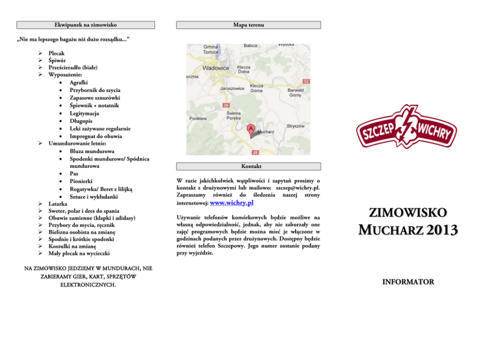 Ekwipunek na zimowisko Mapa terenu „Nie ma lepszego bagażu niż dużo rozsądku...” Plecak Śpiwór Prześcieradło (białe) Wyposażenie: Agrafki Przybornik do szycia Zapasowe sznurówki Śpiewnik + notatnik Legitymacja Długopis Leki zażywane regularnie Impregnat do obuwia Umundurowanie letnie: Bluza mundurowa Spodenki mundurowe/ Spódnica mundurowa Pas Pionierki Rogatywka/ Beret z lilijką Sztuce i wykładanki Latarka Sweter, polar i dres do spania Obuwie zamienne (klapki i adidasy) Przybory do mycia, ręcznik Bielizna osobista na zmianę Spodnie i krótkie spodenki Koszulki na zmianę Mały plecak na wycieczki Kontakt W razie jakichkolwiek wątpliwości i zapytań prosimy o kontakt z drużynowymi lub mailowo: [email protected]. Zapraszamy również do śledzenia naszej strony internetowej: www.wichry.pl Używanie telefonów komórkowych będzie możliwe na własną odpowiedzialność, jednak, aby nie zaburzały one zajęć programowych będzie można mieć je włączone w godzinach podanych przez drużynowych. Dostępny będzie również telefon Szczepowy. Jego numer zostanie podany przy wyjeździe. ZIMOWISKO MUCHARZ 2013 NA ZI MOWI S KO J E DZI E MY W MUNDURACH, NI E ZABIERAMY GIER, KART, SPRZĘTÓW ELEKTRONICZNYCH. INFORMATOR Miejsce Terminarz Uczestnicy W tym roku udajemy się do miejscowości Mucharz położonej w województwie małopolskim, powiecie wadowickim. Będziemy mieszkać w Szkole Podstawowej. Szkoła jest oczywiście ogrzewana, posiada łazienki z prysznicami i bardzo dużą salę gimnastyczną. Teren i okolice sprzyjają pieszym wycieczkom i oczywiście jeździe na nartach, do której gorąco zachęcamy. Adres szkoły (podamy również w dniu wyjazdu) Szkoła Podstawowa im. Ojca Świętego Jana Pawła II w Mucharzu 34-106 Mucharz 238 WPŁATA GWARANCYJNA 300 zł + DAROWIZNA 50zł: - do 12 grudnia 2012 (środa), SP 12, godz. 18:00-18:30 KARTY ZDROWIA: - należy oddać do 12 grudnia 2012 (środa), SP 12, godz. 18:00-18:30 W zimowisku uczestniczyć będą zuchy, harcerki, harcerze i wędrowniczki: - 5 KDH PIORUN drużynowy ćw. Maciej Adrian, tel. 534 668 203, e-mail [email protected] - 5 KDH BŁYSKAWICA drużynowa: pwd Karolina Wierzejska, tel. 509 842 251 e-mail [email protected] - 5 KDH LAS drużynowa pwd. Katarzyna Chmielewska-Synowska tel. 601 239 049 e-mail [email protected] - 5 KDW VIRGA drużynowa: pwd Agnieszka Musiałowicz, tel. 605 251 075 e-mail a.musiał[email protected] - 5 KGZ Królestwo Wiatru drużynowy ćw. Igor Niemiec, tel. 792 207 229 e-mail [email protected] - 5 KGZ Słoneczna Gromada drużynowa sam Iga Niemiec, tel. 667 252 077 e-mail [email protected] Termin Wyjazd na zimowisko odbędzie się 12.01.2013 (sobota) w godzinach porannych, zbiórka najprawdopodobniej pod harcówką w Bronowicach przy ul. Pod Strzechą. Powrót natomiast w godzinach popołudniowych 26.01.2013 (sobota). Dokładne godziny zostaną podane na naszej stronie internetowej (www.wichry.pl), kiedy zarezerwujemy autobus. Rodziców zapraszamy w odwiedziny w terminie: 19-20.01.2013. Zuchy z Naszego Szczepu wezmą udział tylko w pierwszym tygodniu zimowiska, tj. 12.01 – 19.01. Kadra i organizatorzy Proszę o wydrukowanie karty zdrowia na jednej kartce formatu A4! (obustronnie) – inne karty nie będą przyjmowane. Nowy wzór kart zdrowia jest dostępny na stronie wichry.pl Bardzo prosimy o odnotowanie na kartach zdrowia wszelkich informacji dotyczących zażywanych leków i ich dawkowania. WPŁATA POZOSTAŁA 590zł: - do 3 stycznia 2013 (czwartek), SP 12, godz. 18:00-18:30 Wszelkich wpłat, można również dokonać na konto Szczepu: Alior Bank w Krakowie Szczep 5KDH "Wichry" ul. Grzegórzecka 45-47 31-532 Kraków 55 2490 0005 0000 4530 9128 1330 przykładowy tytłu przelewu WPŁATY GWARANCYJNEJ i DAROWIZNY: Organizatorem obozu jest Szczep Wichry 5 KDH Kraków Związku Harcerstwa Rzeczypospolitej. Kadrę wychowawczą obozu stanowią: phm. Piotr Hausner HR. – komendant, pwd. Mariusz Skóra HO- kwatermistrz Opłaty Odpłatność uczestnika zimowiska: 940 zł w tym: koszt zimowiska: 890 zł darowizna: 50 zł ------------------------Składka programowa AZ13 300zł Darowizna 50zł imię i nazwisko dziecka. -----------------------Ze względów podatkowych w przelewie za udział w zimowisku musi znaleźć się informacja, że jest to 'składka programowa'. Każdy przelew nie zawierający tej adnotacji będzie zwracany. Wszelkie informacje dotyczące wpłat i terminów można znaleźć na naszej stronie www.wichry.pl Warunkiem uczestnictwa w zimowisku jest: wiek 8 lat (zuchy), 11 lat i więcej (harcerze), wypełnienie i oddanie karty zdrowia do: 12.12.2012r., opłata gwarancyjna 12.12.2012r. Całkowita opłata za zimowisko do dnia: 03.01.2013 r. Personel Na zimowisku obecny będzie wykwalifikowany personel: opieka medyczna oraz panie kucharki. Wszyscy instruktorzy oraz drużynowi są posiadaczami kursu wychowawców kolonijnych.