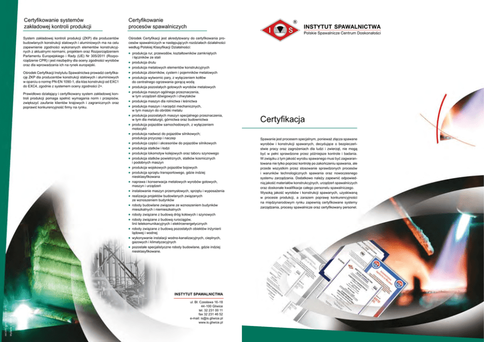 Certyfikowanie systemów zakładowej kontroli produkcji Certyfikowanie procesów spawalniczych System zakładowej kontroli produkcji (ZKP) dla producentów budowlanych konstrukcji stalowych i aluminiowych ma na celu zapewnienie zgodności wykonanych elementów konstrukcyjnych z aktualnymi normami, projektem oraz Rozporządzeniem Parlamentu Europejskiego i Rady (UE) Nr 305/2011 (Rozporządzenie CPR) i jest niezbędny dla oceny zgodności wyrobów oraz dla wprowadzania ich na rynek europejski. Ośrodek Certyfikacji jest akredytowany do certyfikowania procesów spawalniczych w następujących rozdziałach działalności według Polskiej Klasyfikacji Działalności: INSTYTUT SPAWALNICTWA Polskie Spawalnicze Centrum Doskonałości Ośrodek Certyfikacji Instytutu Spawalnictwa prowadzi certyfikację ZKP dla producentów konstrukcji stalowych i aluminiowych w oparciu o normę PN-EN 1090-1, dla klas konstrukcji od EXC1 do EXC4, zgodnie z systemem oceny zgodności 2+. Prawidłowo działający i certyfikowany system zakładowej kontroli produkcji pomaga spełnić wymagania norm i przepisów, zwiększyć zaufanie klientów krajowych i zagranicznych oraz poprawić konkurencyjność firmy na rynku. ● ● ● ● ● ● ● ● ● ● ● ● ● ● ● ● ● ● ● ● ● ● ● ● ● ● ● p rodukcja rur, przewodów, kształtowników zamkniętych i łączników ze stali produkcja drutu produkcja metalowych elementów konstrukcyjnych produkcja zbiorników, cystern i pojemników metalowych produkcja wytwornic pary, z wyłączeniem kotłów do centralnego ogrzewania gorącą wodą produkcja pozostałych gotowych wyrobów metalowych produkcja maszyn ogólnego przeznaczenia, w tym urządzeń dźwigowych i chwytaków produkcja maszyn dla rolnictwa i leśnictwa produkcja maszyn i narzędzi mechanicznych, w tym maszyn do obróbki metalu produkcja pozostałych maszyn specjalnego przeznaczenia, w tym dla metalurgii, górnictwa oraz budownictwa produkcja pojazdów samochodowych, z wyłączeniem motocykli produkcja nadwozi do pojazdów silnikowych; produkcja przyczep i naczep produkcja części i akcesoriów do pojazdów silnikowych produkcja statków i łodzi produkcja lokomotyw kolejowych oraz taboru szynowego produkcja statków powietrznych, statków kosmicznych i podobnych maszyn produkcja wojskowych pojazdów bojowych produkcja sprzętu transportowego, gdzie indziej niesklasyfikowana naprawa i konserwacja metalowych wyrobów gotowych, maszyn i urządzeń instalowanie maszyn przemysłowych, sprzętu i wyposażenia realizacja projektów budowlanych związanych ze wznoszeniem budynków roboty budowlane związane ze wznoszeniem budynków mieszkalnych i niemieszkalnych roboty związane z budową dróg kołowych i szynowych roboty związane z budową rurociągów, linii telekomunikacyjnych i elektroenergetycznych roboty związane z budową pozostałych obiektów inżynierii lądowej i wodnej wykonywanie instalacji wodno-kanalizacyjnych, cieplnych, gazowych i klimatyzacyjnych pozostałe specjalistyczne roboty budowlane, gdzie indziej niesklasyfikowane. Wydanie V, 2016 r. AKCEPT-ART®, tel. 32 204 32 75 INSTYTUT SPAWALNICTWA ul. Bł. Czesława 16 -18 44 -100 Gliwice tel. 32 231 00 11 fax 32 231 46 52 e-mail: [email protected] www.is.gliwice.pl Certyfikacja Spawanie jest procesem specjalnym, ponieważ złącza spawane wyrobów i konstrukcji spawanych, decydujące o bezpieczeństwie pracy oraz zagrożeniach dla ludzi i zwierząt, nie mogą być w pełni sprawdzone przez późniejsze kontrole i badania. W związku z tym jakość wyrobu spawanego musi być zagwarantowana nie tylko poprzez kontrolę po zakończeniu spawania, ale przede wszystkim przez stosowanie sprawdzonych procesów i warunków technologicznych spawania oraz nowoczesnego systemu zarządzania. Dodatkowo należy zapewnić odpowiednią jakość materiałów konstrukcyjnych, urządzeń spawalniczych oraz doskonałe kwalifikacje całego personelu spawalniczego. Wysoką jakość wyrobów i konstrukcji spawanych, uzyskiwaną w procesie produkcji, a zarazem poprawę konkurencyjności na międzynarodowym rynku zapewnią certyfikowane systemy zarządzania, procesy spawalnicze oraz certyfikowany personel. Ośrodek Certyfikacji Instytutu Spawalnictwa, wydzielony organizacyjnie w strukturze Instytutu jest: ● ● ● a kredytowany przez Polskie Centrum Akredytacji (PCA) w zakresie certyfikowania procesów spawalniczych, systemów zarządzania jakością, systemów zakładowej kontroli produkcji, personelu spawalniczego i personelu badań nieniszczących utoryzowany przez Europejską Federację Spawalniczą a (EWF) w zakresie kwalifikowania i certyfikowania personelu spawalniczego oraz certyfikowania procesów spawalniczych utoryzowany przez Międzynarodowy Instytut Spawalnictwa a (IIW) w zakresie kwalifikowania i certyfikowania personelu spawalniczego oraz certyfikowania procesów spawalniczych. Kwalifikowanie personelu spawalniczego w oparciu o Kursy Specjalne Europejskiej Federacji Spawalniczej w kategoriach: ● ● Certyfikowanie systemów zarządzania jakością p ersonel wykonujący badania makroskopowe i mikroskopowe materiałów konstrukcyjnych i ich połączeń spajanych p ersonel odpowiedzialny za przeprowadzenie obróbki cieplnej złączy spawanych. Po ukończeniu ww. kursów Ośrodek Certyfikacji wydaje dokumenty (Record of Achievement) na trzech poziomach wiedzy: Comprehensive (Pełny), Standard (Standardowy) i Basic (Podstawowy), które są honorowane w Unii Europejskiej. Przedsiębiorstwa chcące liczyć się na wolnym, konkurencyjnym rynku wprowadzają systemy zarządzania jakością, których głównym celem jest spełnienie wymagań klienta, zwiększenie efektywności pracy i skuteczniejsze zarządzanie firmą. Certyfikaty kompetencji dla inżyniera, technologa, mistrza i instruktora spawalniczego są ważne 3 lata, natomiast Certyfikaty - Świadectwa Egzaminu Kwalifikacyjnego Spawacza są ważne zgodnie z zasadami opisanymi w norm