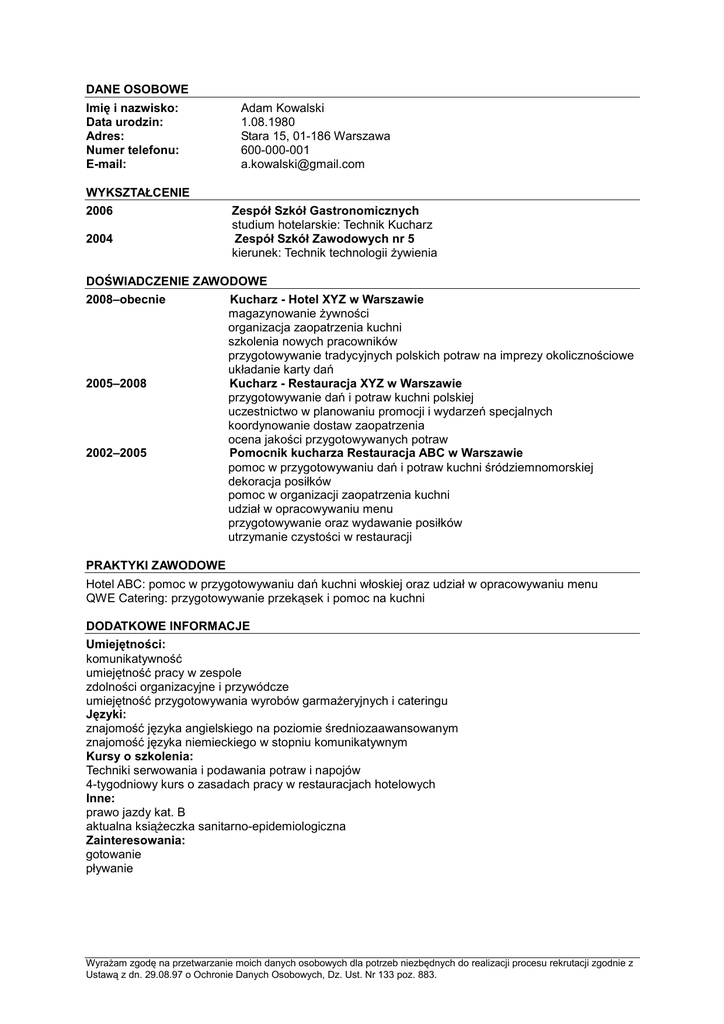 DANE OSOBOWE Imię i nazwisko: Data urodzin: Adres: Numer telefonu: E-mail: Adam Kowalski 1.08.1980 Stara 15, 01-186 Warszawa 600-000-001 [email protected] WYKSZTAŁCENIE 2006 2004 Zespół Szkół Gastronomicznych studium hotelarskie: Technik Kucharz Zespół Szkół Zawodowych nr 5 kierunek: Technik technologii Ŝywienia DOŚWIADCZENIE ZAWODOWE 2008–obecnie 2005–2008 2002–2005 Kucharz - Hotel XYZ w Warszawie magazynowanie Ŝywności organizacja zaopatrzenia kuchni szkolenia nowych pracowników przygotowywanie tradycyjnych polskich potraw na imprezy okolicznościowe układanie karty dań Kucharz - Restauracja XYZ w Warszawie przygotowywanie dań i potraw kuchni polskiej uczestnictwo w planowaniu promocji i wydarzeń specjalnych koordynowanie dostaw zaopatrzenia ocena jakości przygotowywanych potraw Pomocnik kucharza Restauracja ABC w Warszawie pomoc w przygotowywaniu dań i potraw kuchni śródziemnomorskiej dekoracja posiłków pomoc w organizacji zaopatrzenia kuchni udział w opracowywaniu menu przygotowywanie oraz wydawanie posiłków utrzymanie czystości w restauracji PRAKTYKI ZAWODOWE Hotel ABC: pomoc w przygotowywaniu dań kuchni włoskiej oraz udział w opracowywaniu menu QWE Catering: przygotowywanie przekąsek i pomoc na kuchni DODATKOWE INFORMACJE Umiejętności: komunikatywność umiejętność pracy w zespole zdolności organizacyjne i przywódcze umiejętność przygotowywania wyrobów garmaŜeryjnych i cateringu Języki: znajomość języka angielskiego na poziomie średniozaawansowanym znajomość języka niemieckiego w stopniu komunikatywnym Kursy o szkolenia: Techniki serwowania i podawania potraw i napojów 4-tygodniowy kurs o zasadach pracy w restauracjach hotelowych Inne: prawo jazdy kat. B aktualna ksiąŜeczka sanitarno-epidemiologiczna Zainteresowania: gotowanie pływanie WyraŜam zgodę na przetwarzanie moich danych osobowych dla potrzeb niezbędnych do realizacji procesu rekrutacji zgodnie z Ustawą z dn. 29.08.97 o Ochronie Danych Osobowych, Dz. Ust. Nr 133 poz. 883.